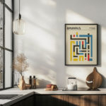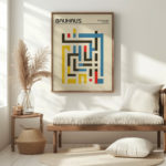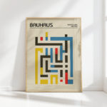 This high quality print captures the essence of Bauhaus design, a celebrated art movement known for its clean lines and functional aesthetic. The composition is a visually striking maze of colorful geometric shapes, seamlessly intertwining blues, yellows, reds, and blacks against a neutral background. Ideal for those looking to add a touch of intellectual sophistication and modernist design to their living or workspace, this print serves as both a captivating visual puzzle and a testament to the enduring legacy of Bauhaus style.