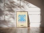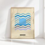 This Bauhaus Print encapsulates the essence of modernist design with its clean lines and geometric shapes. A prominent blue square anchors the composition, flanked by undulating waves in varying shades of blue, creating a sense of movement. This piece embodies a vibrant and dynamic aesthetic that brings a modern touch to any space, perfectly blending the pastel palette with a bold geometric design to make a striking visual statement.