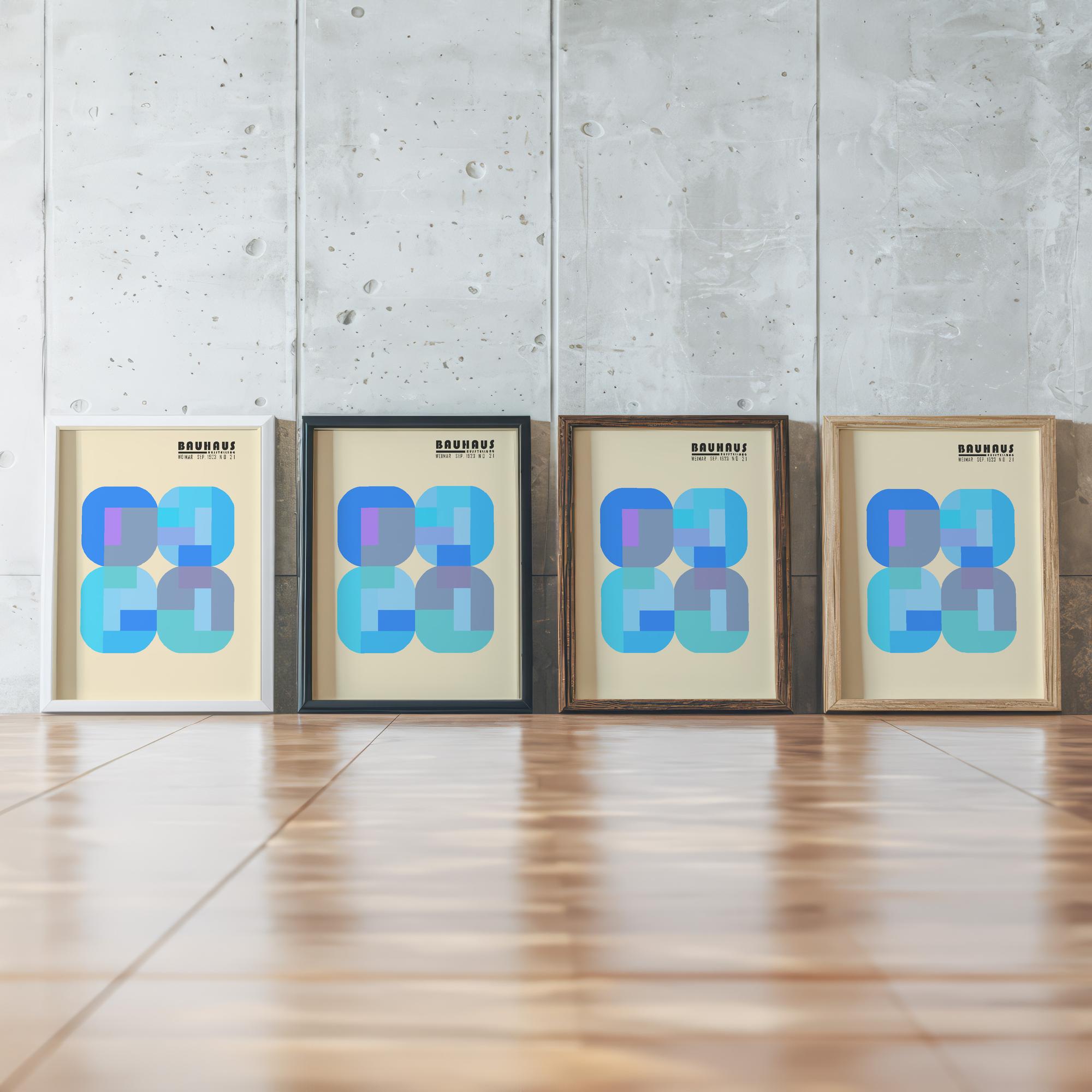 This High Quality Print captures the essence of Bauhaus design with its clean, geometric blocks and cool color palette. The symmetrical arrangement of squares in varying shades of blue reflects the movement’s emphasis on harmony and function. Its minimalist approach and understated elegance make it a versatile addition to any space, embodying the principles of Bauhaus art that blend craftsmanship with fine arts, offering a timeless piece for enthusiasts of modernist design.