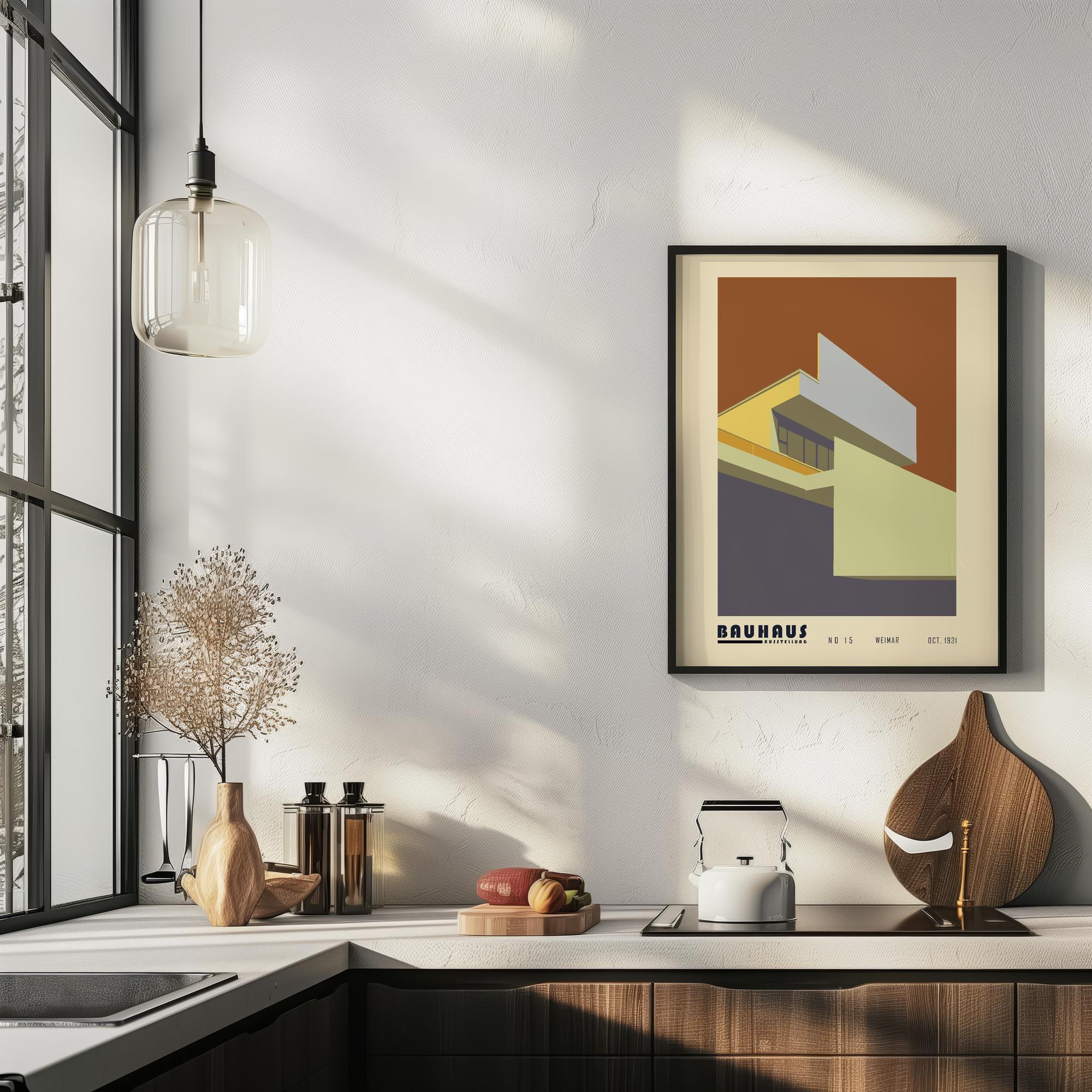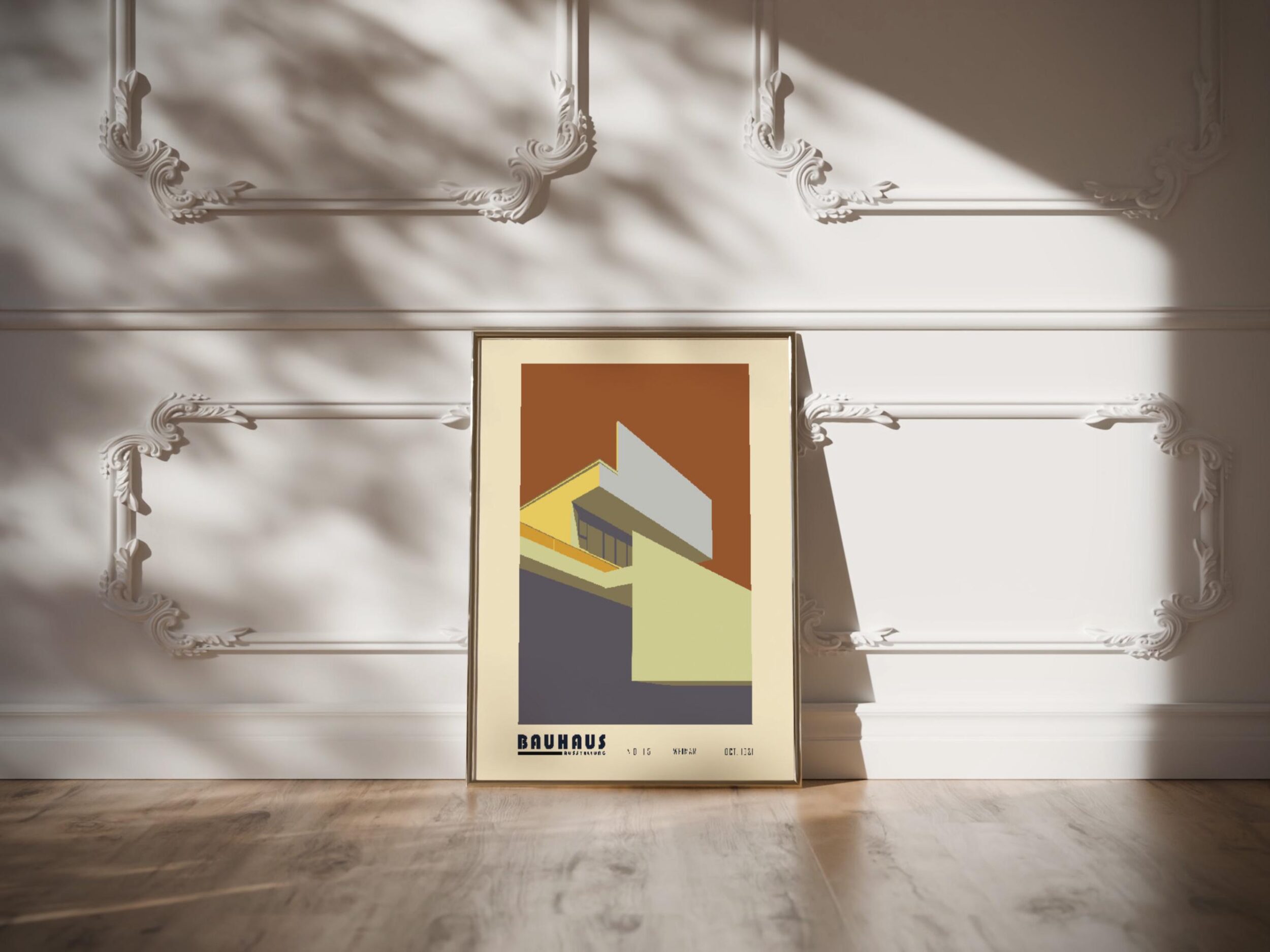 This Bauhaus Print showcases a stylized architectural form with bold geometric shapes. The composition features a harmonious blend of earth-toned rectangles and squares, evoking a sense of balance and modern elegance. The layered geometric elements create an illusion of depth, reminiscent of the iconic Bauhaus style known for its simplicity and functionalism. With its muted neutral palette, this piece brings sophistication to any space and serves as a nod to historical art movements while remaining timeless and versatile for a range of decor settings.