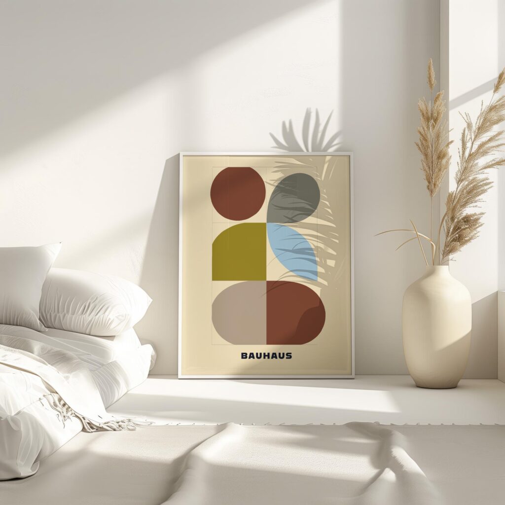 This high-quality print captures the essence of Bauhaus design with its focus on simplistic yet impactful geometric shapes. The composition is a balanced arrangement of semicircles and quarter circles in a muted, earth-toned color scheme that conveys a sense of elegance and sophistication. This piece embodies the modernist principles of form following function and features a harmonious blend of natural colors that would complement any contemporary interior. The timeless appeal of this Bauhaus artwork makes it a perfect addition to any collection, inviting interpretation and contemplation from viewers.
