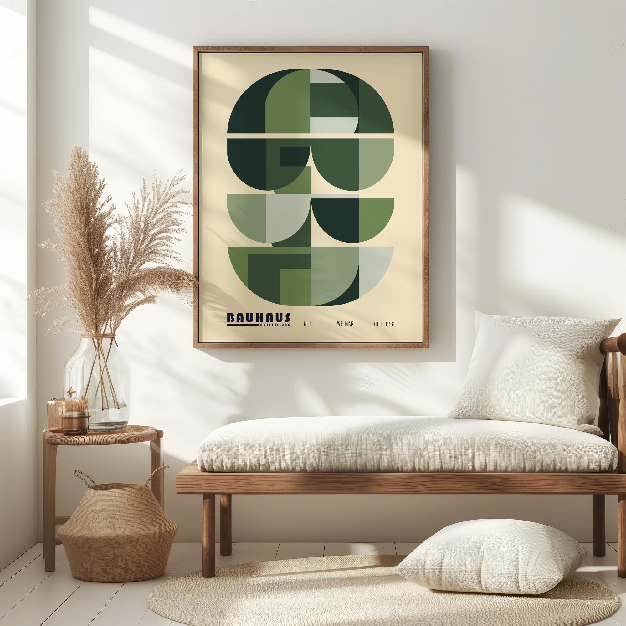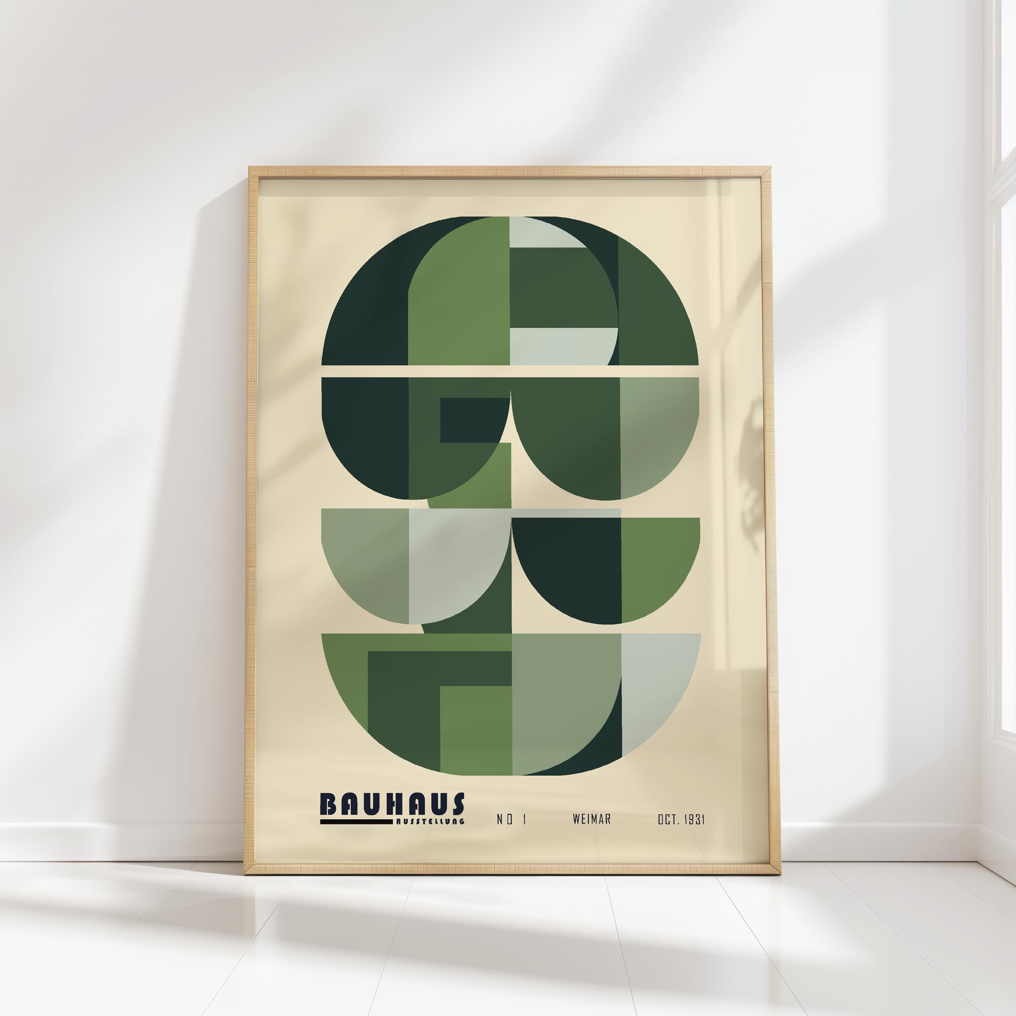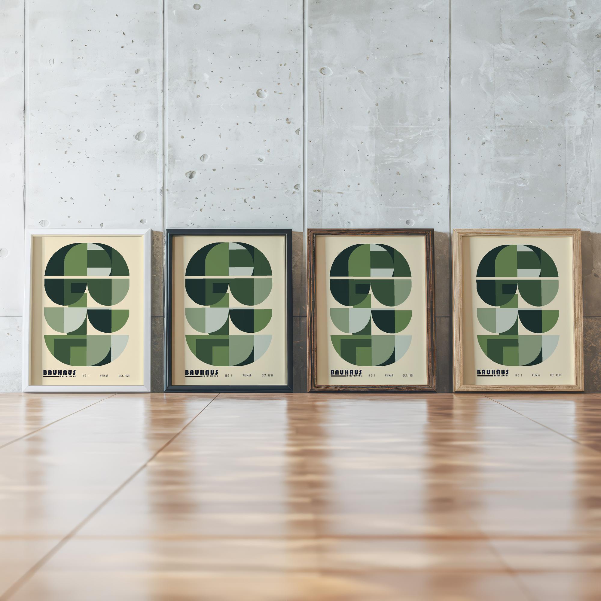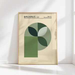 This print captures the essence of the Bauhaus aesthetic with its minimalist yet intricate arrangement of geometric shapes. Clean lines and circular forms overlap, creating a harmonious composition that exemplifies the movement’s focus on function and simplicity. The use of varying shades of green against a neutral background offers a subtle yet impactful visual that highlights the interplay of light and shadow, depth, and perspective. It’s an elegant piece that would bring a touch of sophistication and historical design to any modern interior.