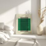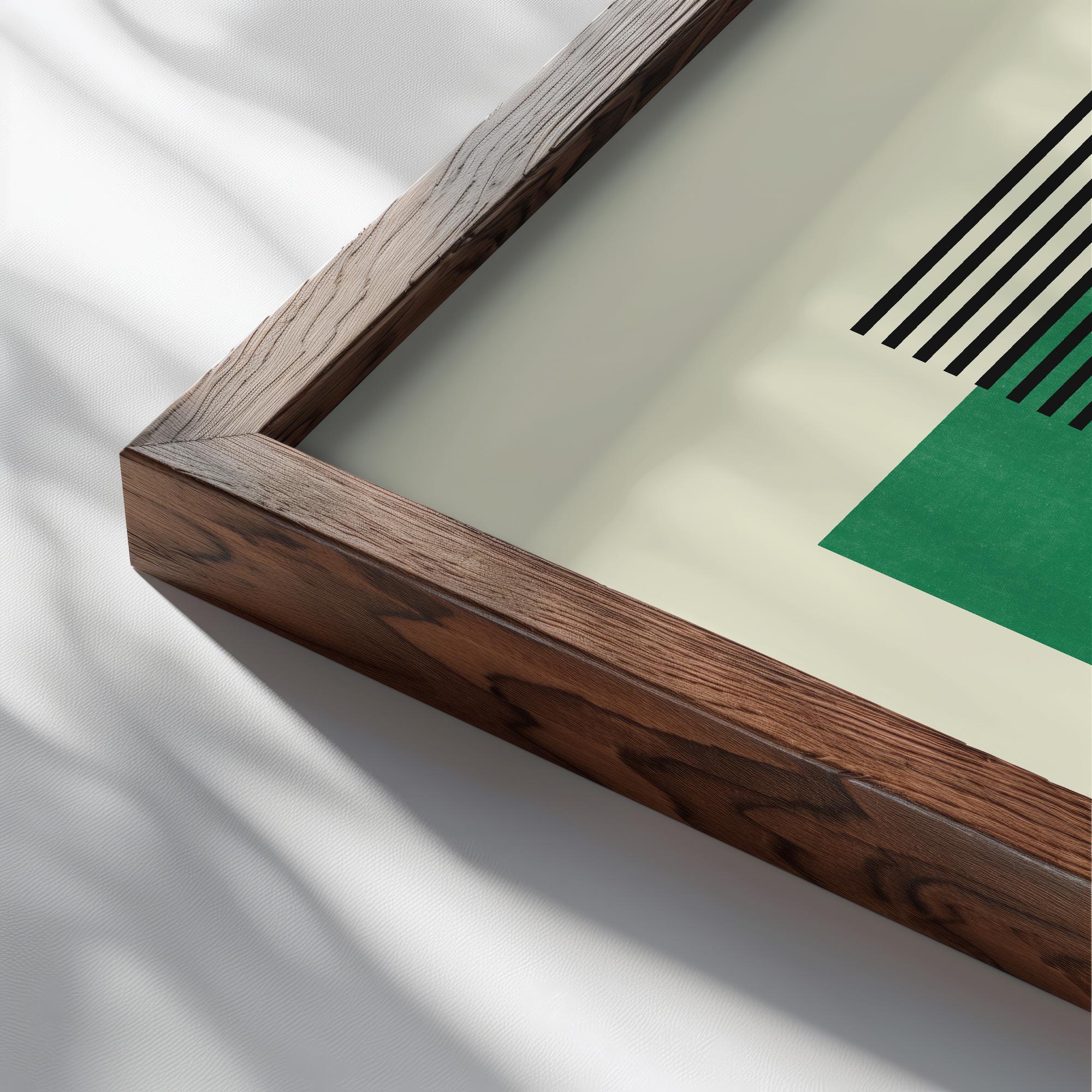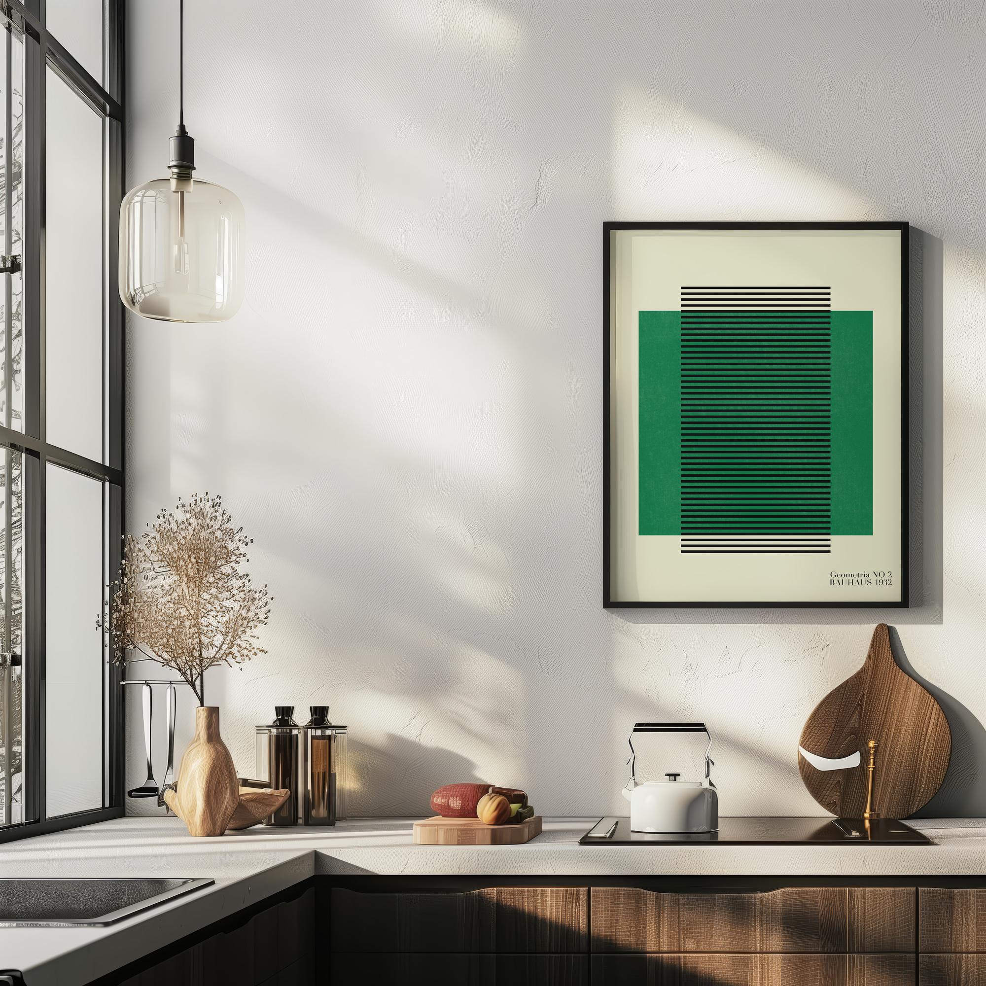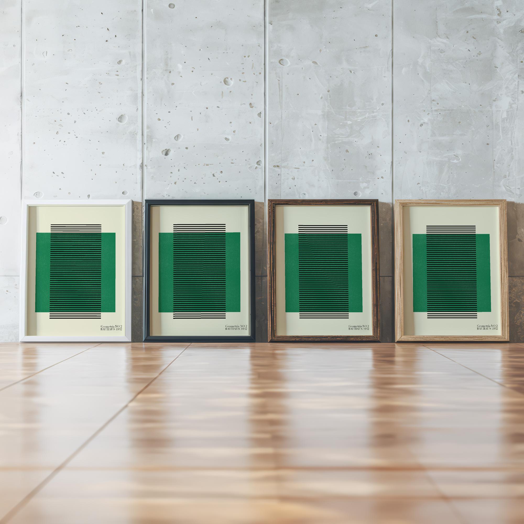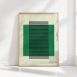 This Bauhaus Print features a striking combination of cool green tones with vertical black stripes creating a geometric pattern. The design embodies the classic Bauhaus style with its clean lines and functional aesthetic. The uniformity and simplicity of the piece convey a sense of elegance and contemporary design, making it an ideal addition to modern decor. Perfect for art enthusiasts and those looking to add a touch of vintage modernism to their space.