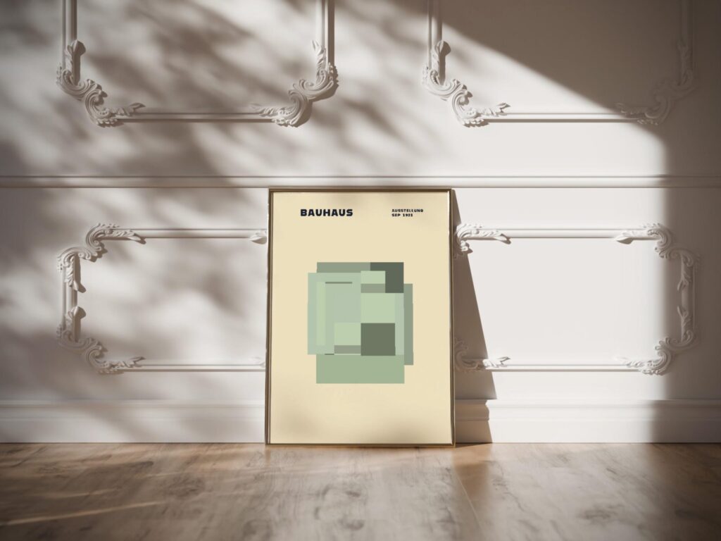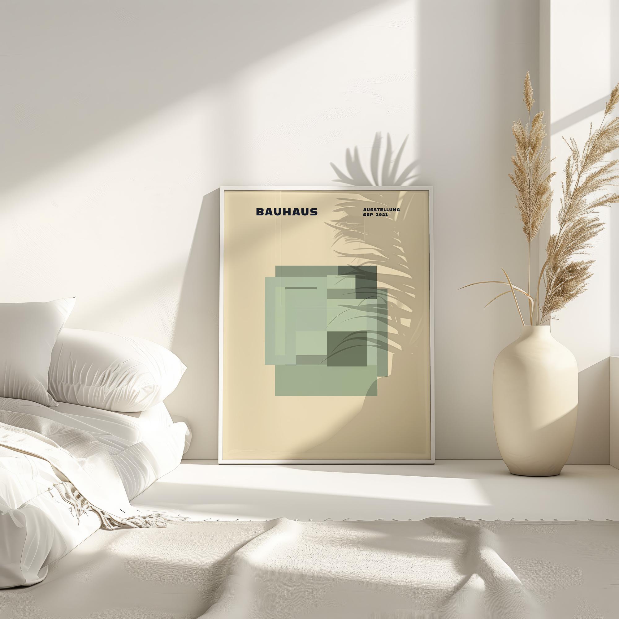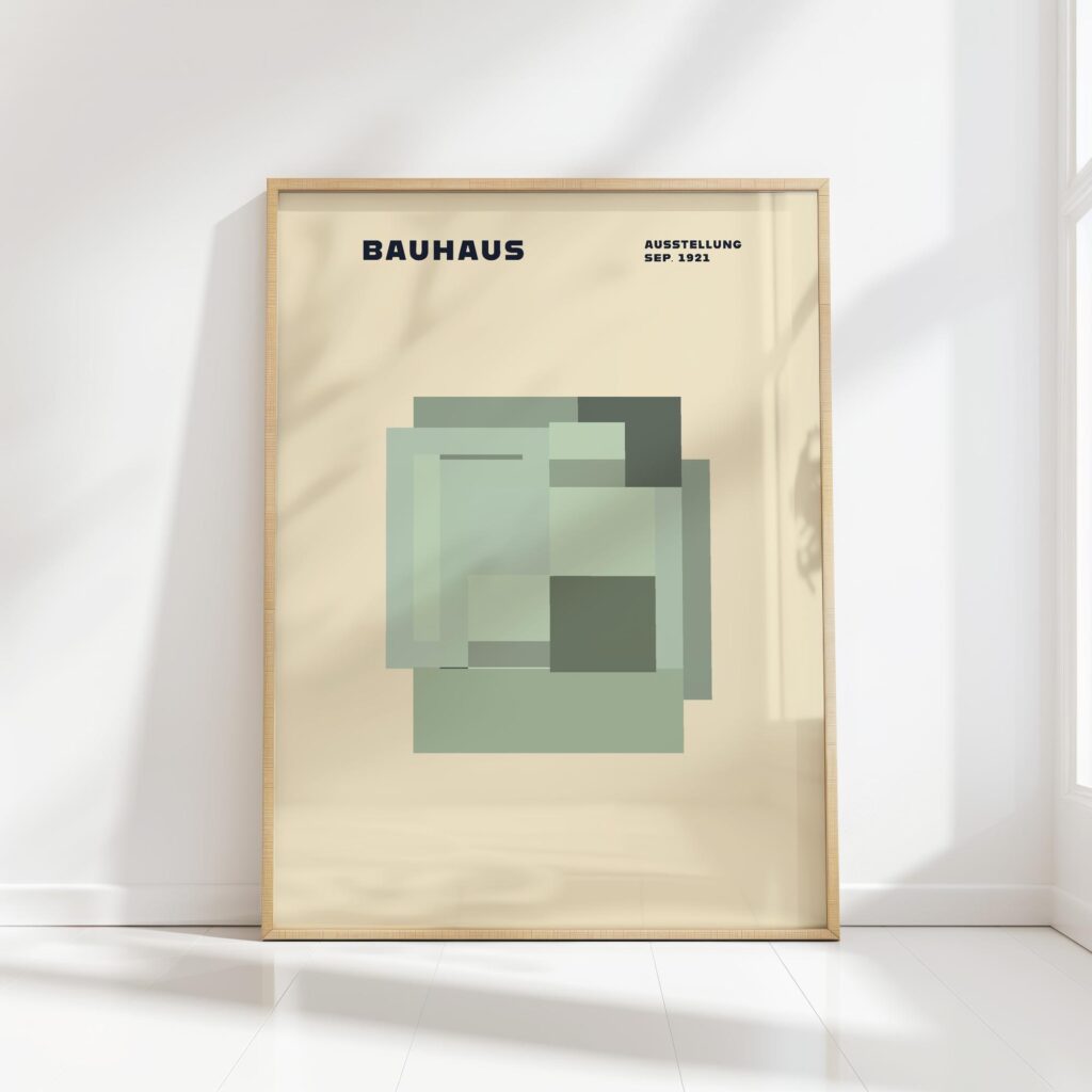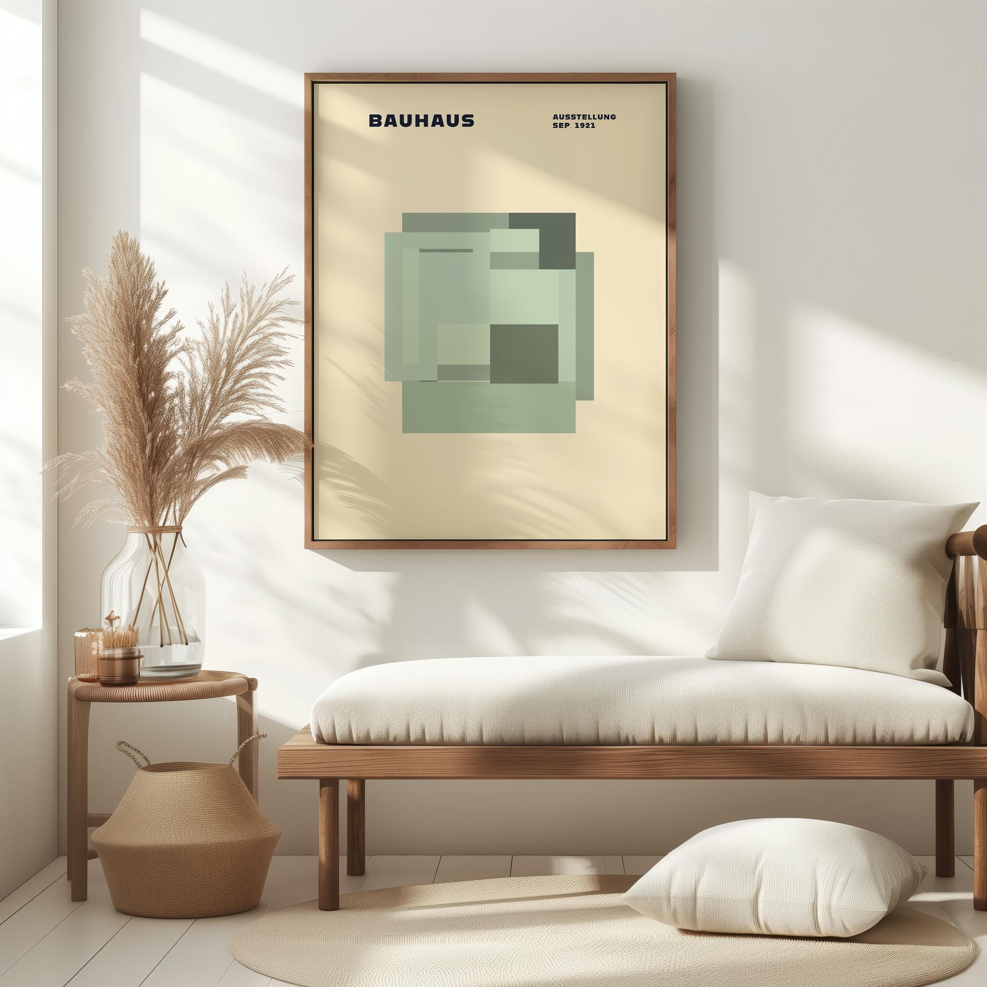 This high-quality Bauhaus Print captures the essence of the iconic design movement. It features an elegant assembly of green-toned squares and rectangles that overlap in a harmonious composition, creating depth and interest. The minimalist geometric shapes are carefully arranged, reflecting the movement’s emphasis on simplicity and functionality. The use of muted green hues adds to the print’s neutral yet alluring aesthetic, making it an ideal artwork for modern and contemporary interiors. This print is a tribute to the Bauhaus school’s revolutionary approach to design and art, making it a perfect piece for enthusiasts and collectors.