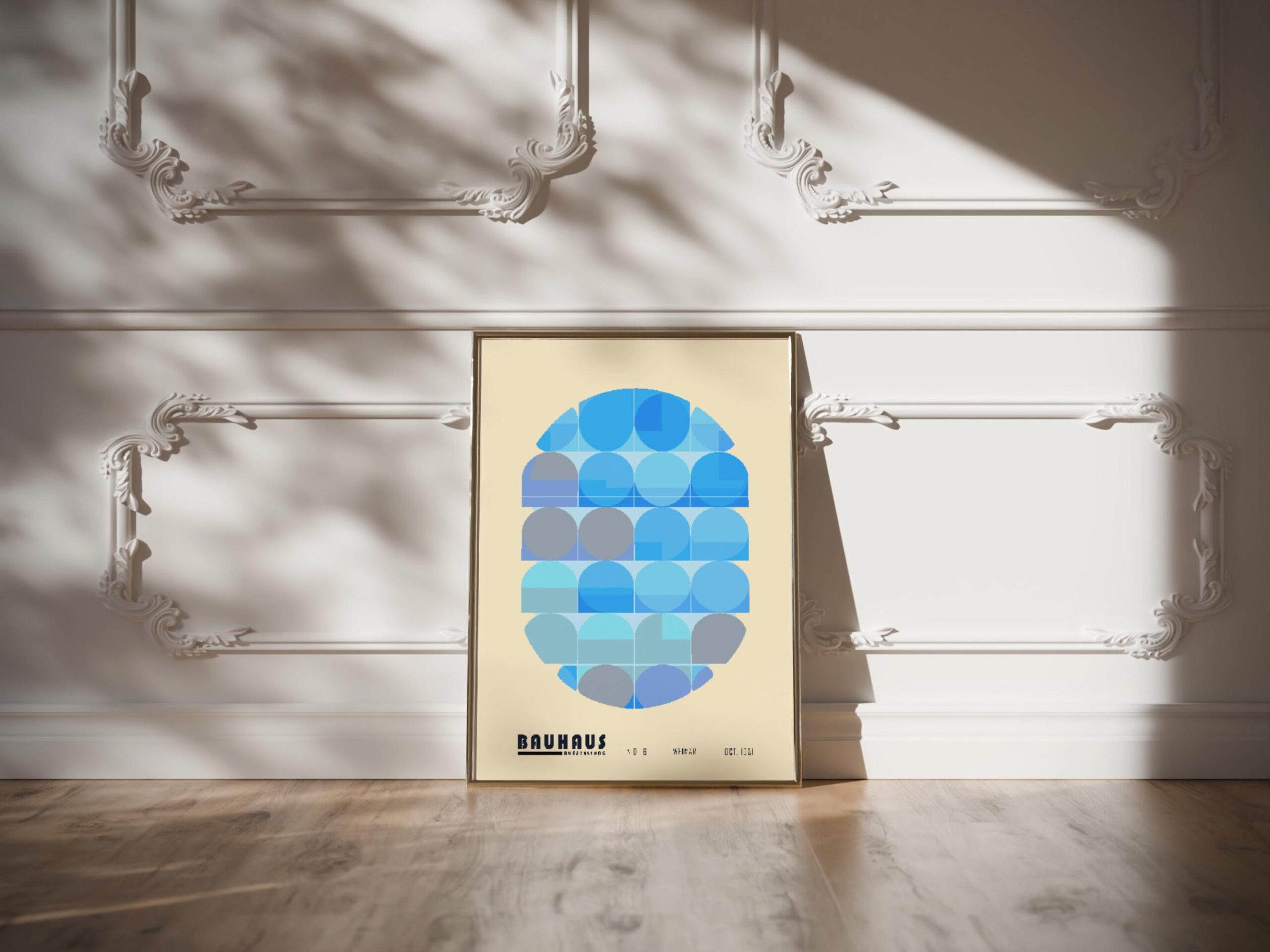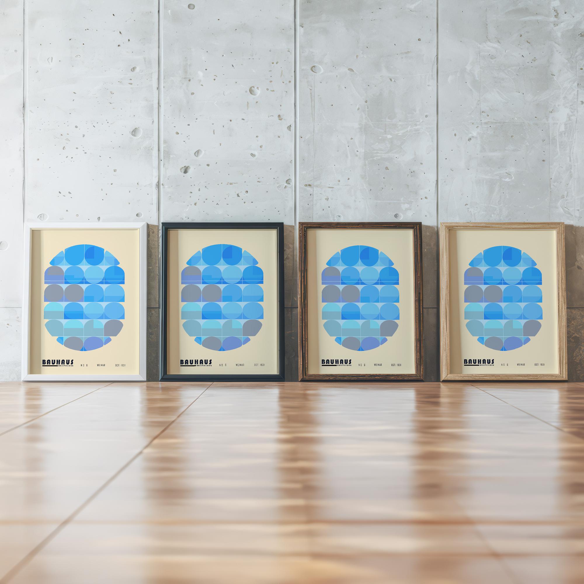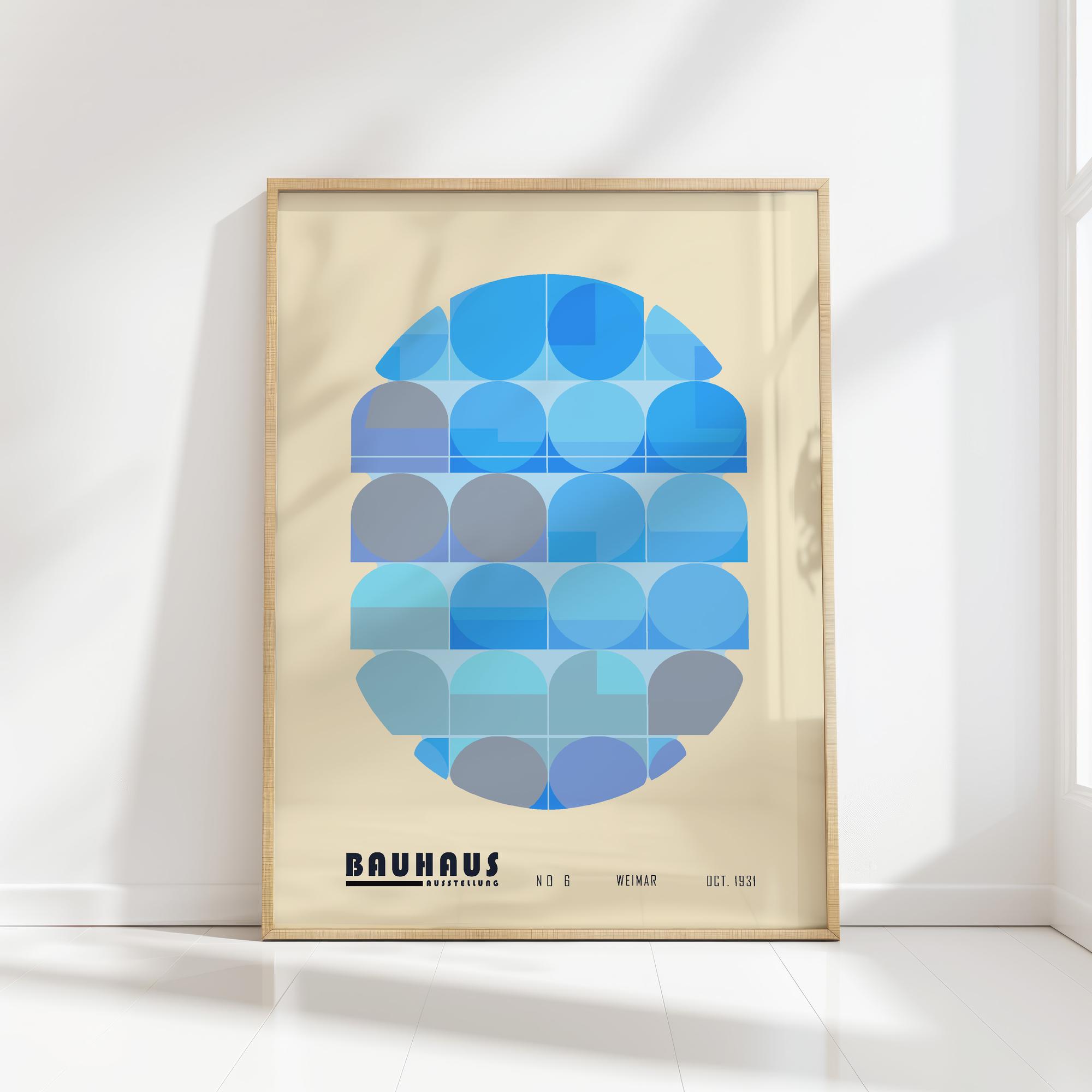 This print showcases the iconic Bauhaus style with a modern twist, employing a serene palette of blue tones. The design is comprised of carefully arranged geometric shapes that create a harmonious and balanced composition. Echoing the Bauhaus principles of functionalism and simplicity, this print exudes an air of calm sophistication. It is a fitting tribute to the revolutionary design school and a must-have for enthusiasts of modernist graphic art. This piece would seamlessly integrate into contemporary interior décor, making it an ideal choice for those seeking a minimalist yet impactful aesthetic.
