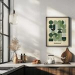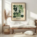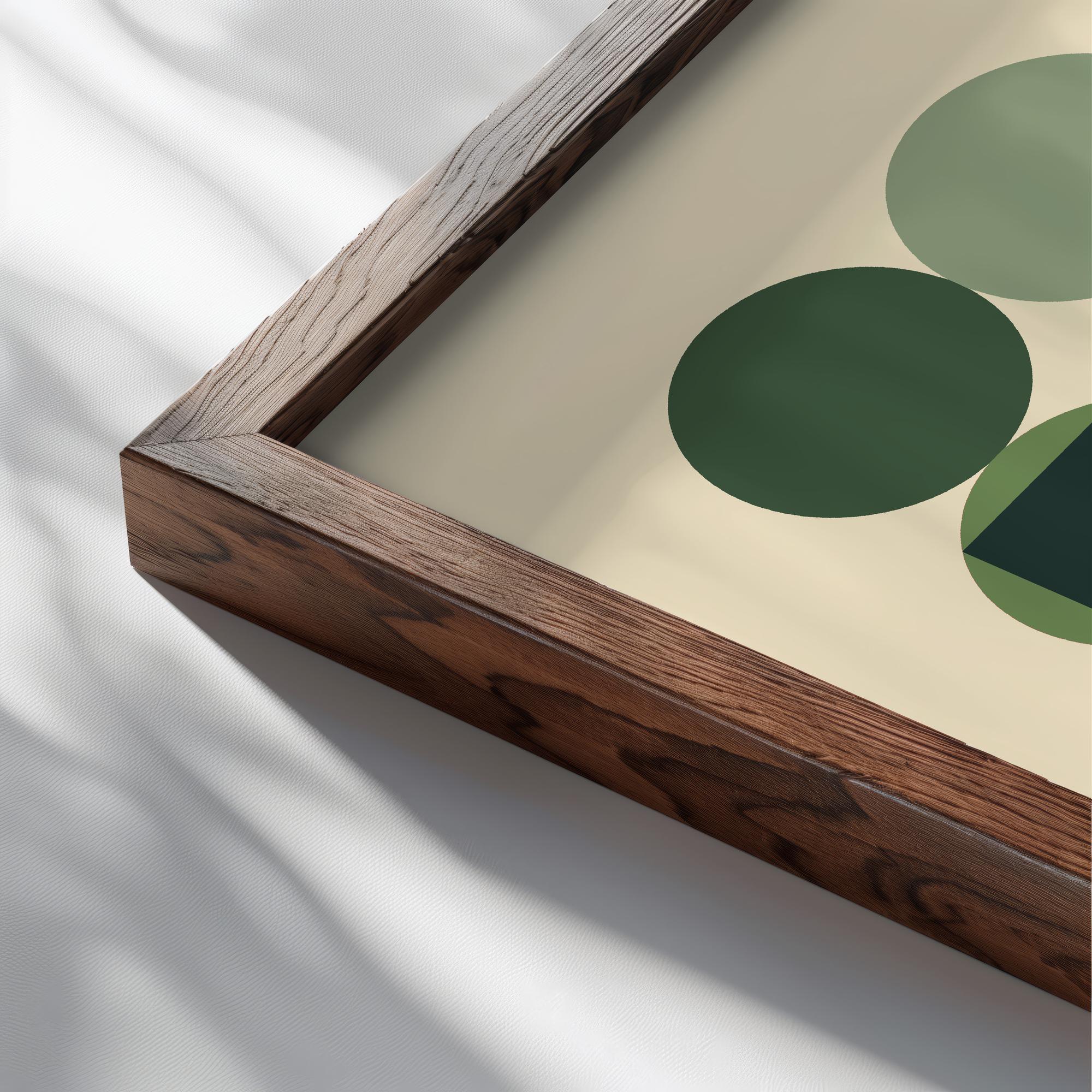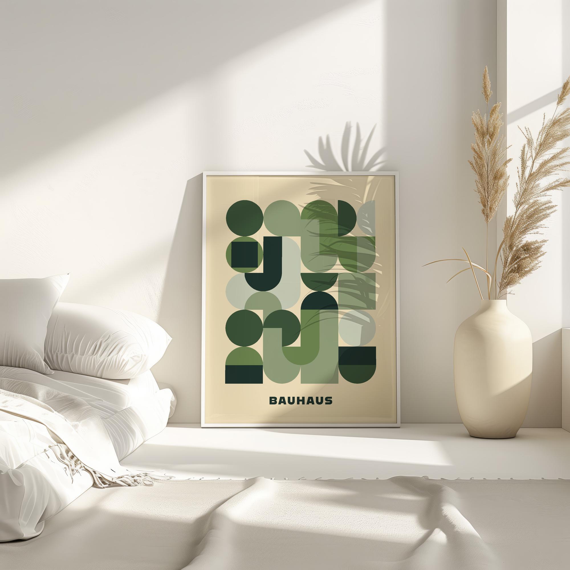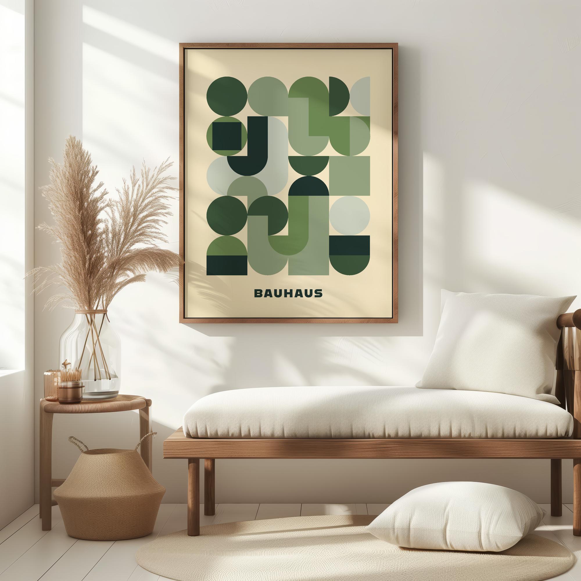 This high-quality print showcases a visually striking Bauhaus inspired design composed of an array of geometric shapes in varying green hues. The design is laid out against a soft, neutral backdrop, creating a stark and appealing contrast. This piece embodies the principles of the Bauhaus movement, emphasizing simplicity, balance, and functionality. It is a perfect addition to any space that favors modernism and contemporary style, offering an elegant yet understated aesthetic that can complement various interior design themes. Ideal as a focal point or a subtle accent, this artwork captivates the viewer with its clean lines and harmonious composition.