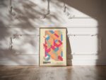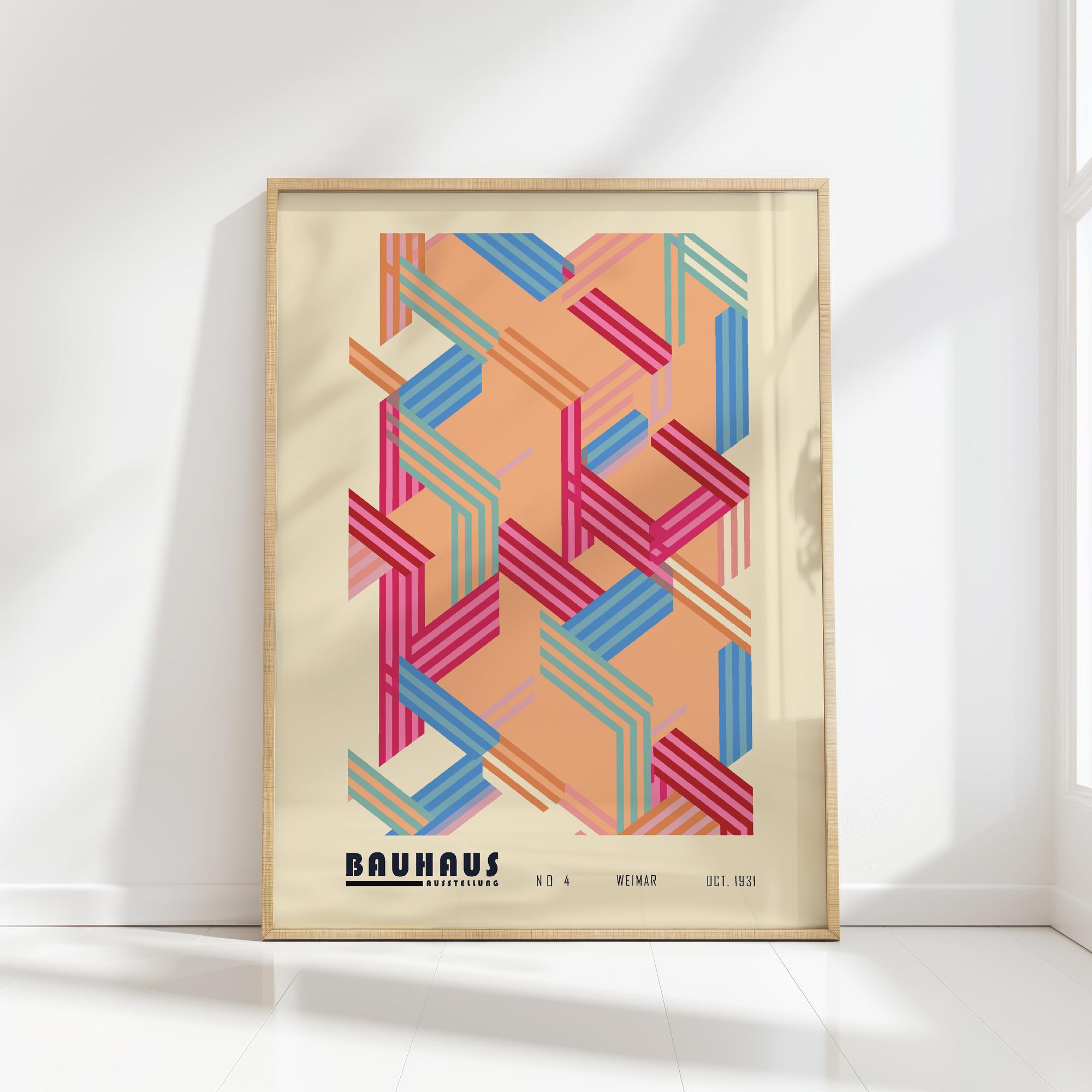 This high-quality Bauhaus print showcases a complex composition of geometric shapes that interlock in an intriguing optical illusion. The use of pastel hues adds a subtle depth to the art, creating a visually pleasing palette that’s both sophisticated and calm. The geometric lines play with perception, evoking the innovative Bauhaus spirit of combining art with industrial function. This piece encapsulates the essence of modernism and serves as a captivating visual statement that will enhance any contemporary space with its elegant complexity and timeless design.