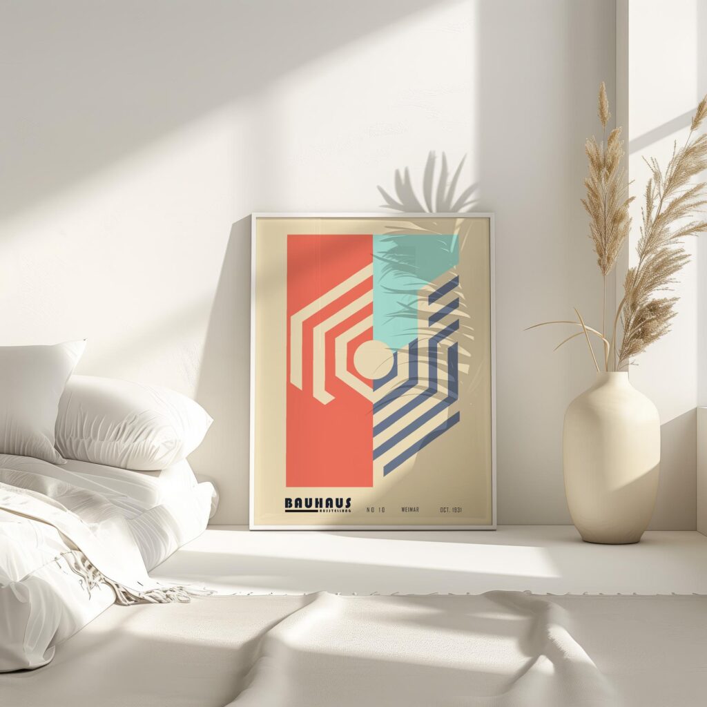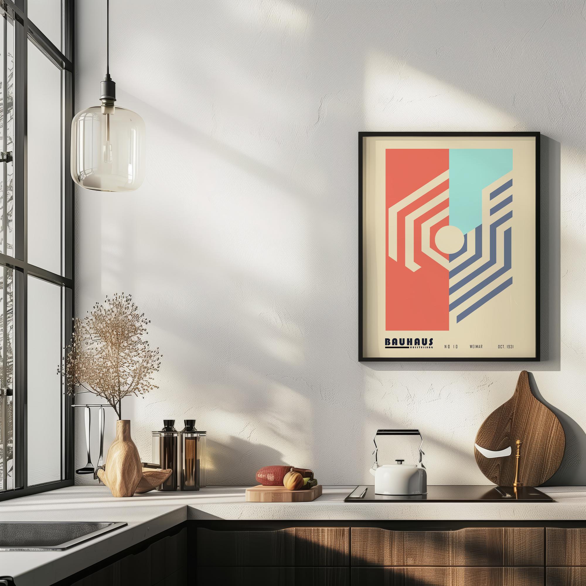 This high-quality print showcases a visually striking Bauhaus-inspired design. Dominated by warm red and blue tones, the print offers a compelling contrast between the two color areas, which are neatly divided by clean, geometric lines. A central circular element and layered shapes create a sense of depth and movement, embodying the principles of form and function synonymous with the Bauhaus school. With its simple yet bold aesthetic, this print is a testament to timeless design and would make a sophisticated addition to any modern interior.