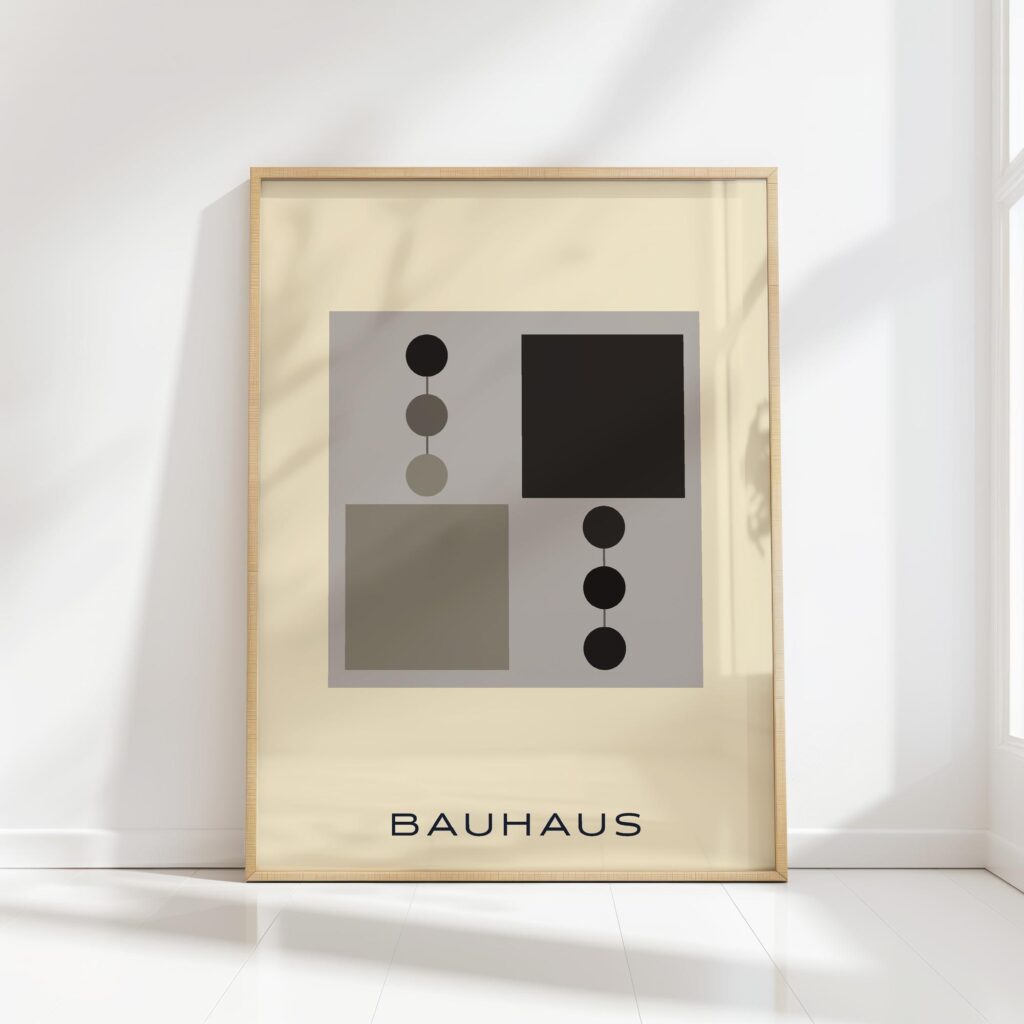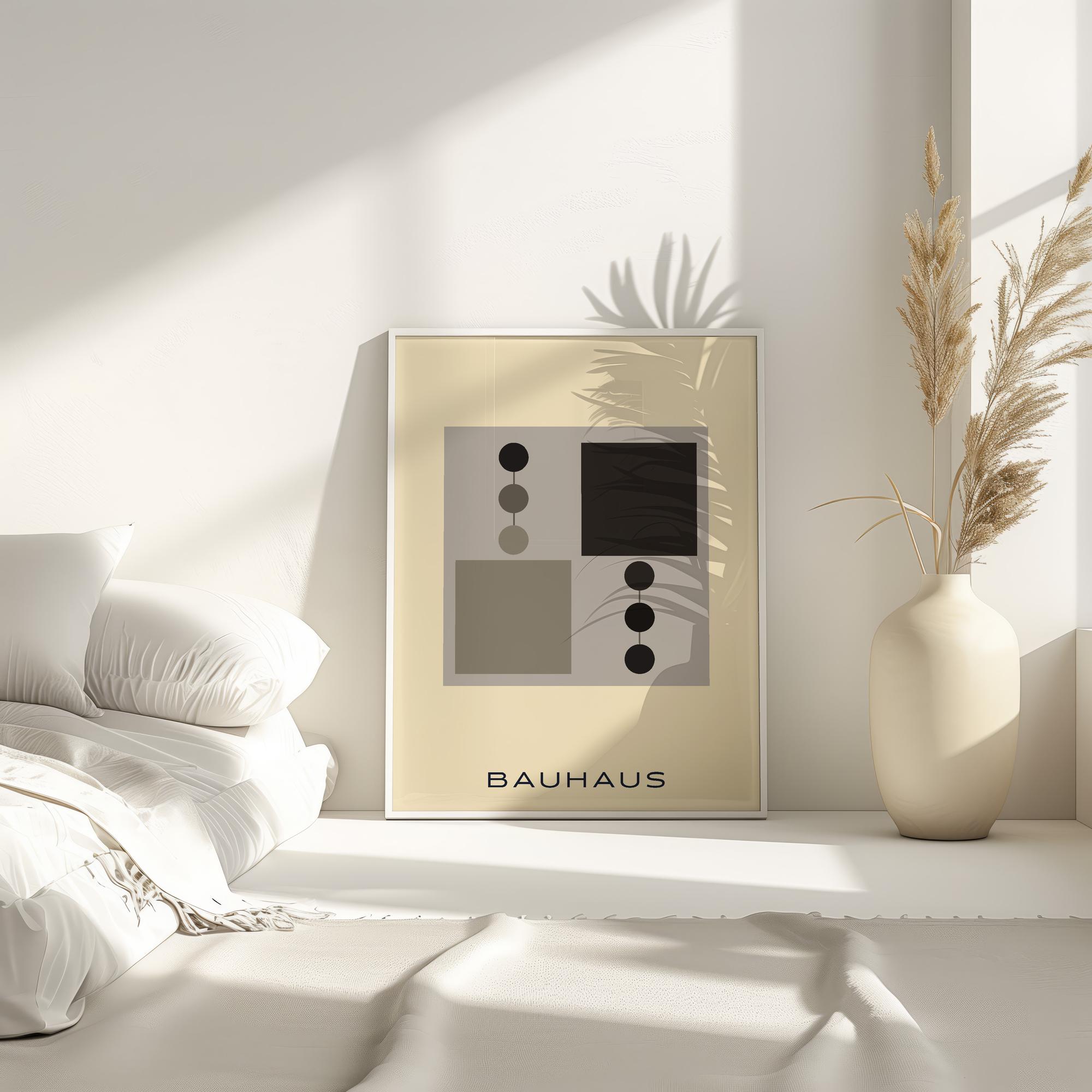 This Bauhaus Print showcases a sophisticated array of geometric shapes, including circles and squares, arranged in a harmonious composition. Set against a neutral background, the print exudes a sense of balance and modern elegance, drawing on the minimalist design principles of the Bauhaus movement. Perfect for adding a touch of sophistication to any space, this piece blends seamlessly with various interior design aesthetics while celebrating the timeless beauty of simple geometric forms.