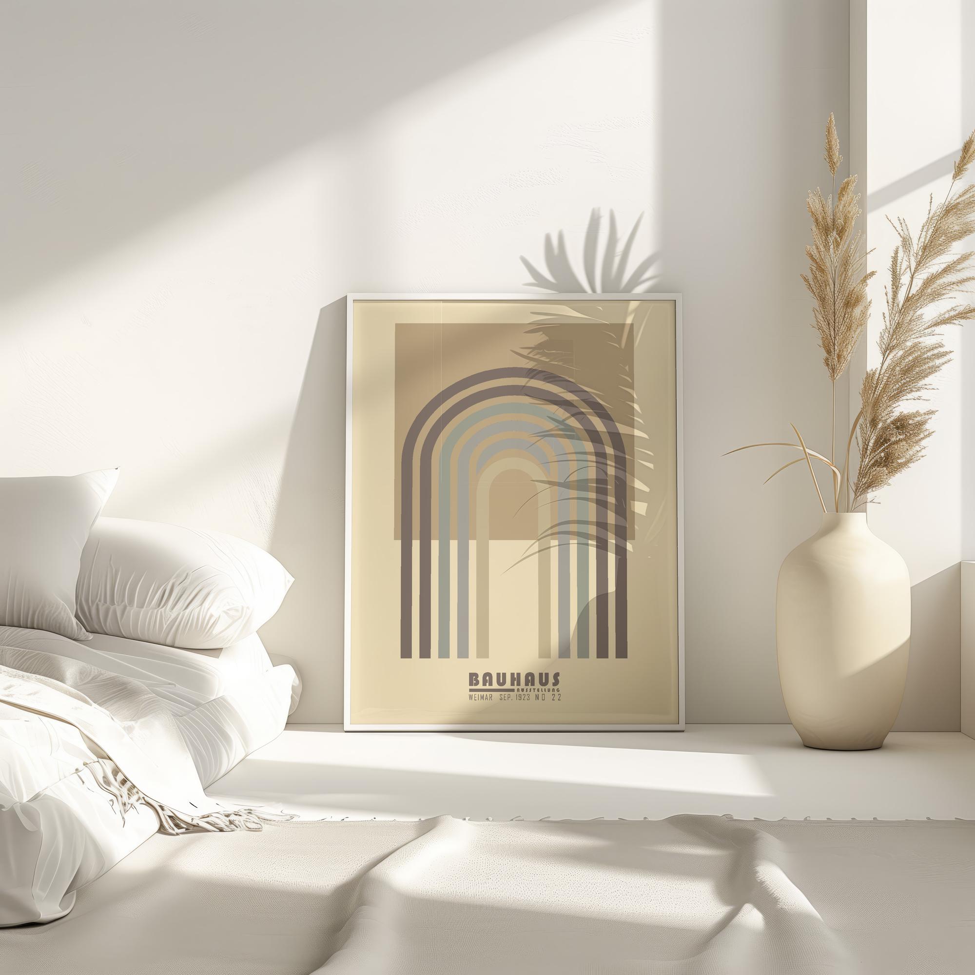 This print presents a Bauhaus-influenced design with a sophisticated sequence of arches, creating a rhythmic visual effect. The neutral palette emphasizes the intersection of form and function, key principles of the Bauhaus movement. The layered arches offer depth and a sense of dimensionality, while the clean lines and minimalist approach showcase a modernist aesthetic. The harmonious composition is calming, yet thought-provoking, adhering to the belief that design should be accessible and intellectually engaging. This piece is an homage to the architectural innovation and timeless simplicity that Bauhaus continues to inspire in contemporary art and design.