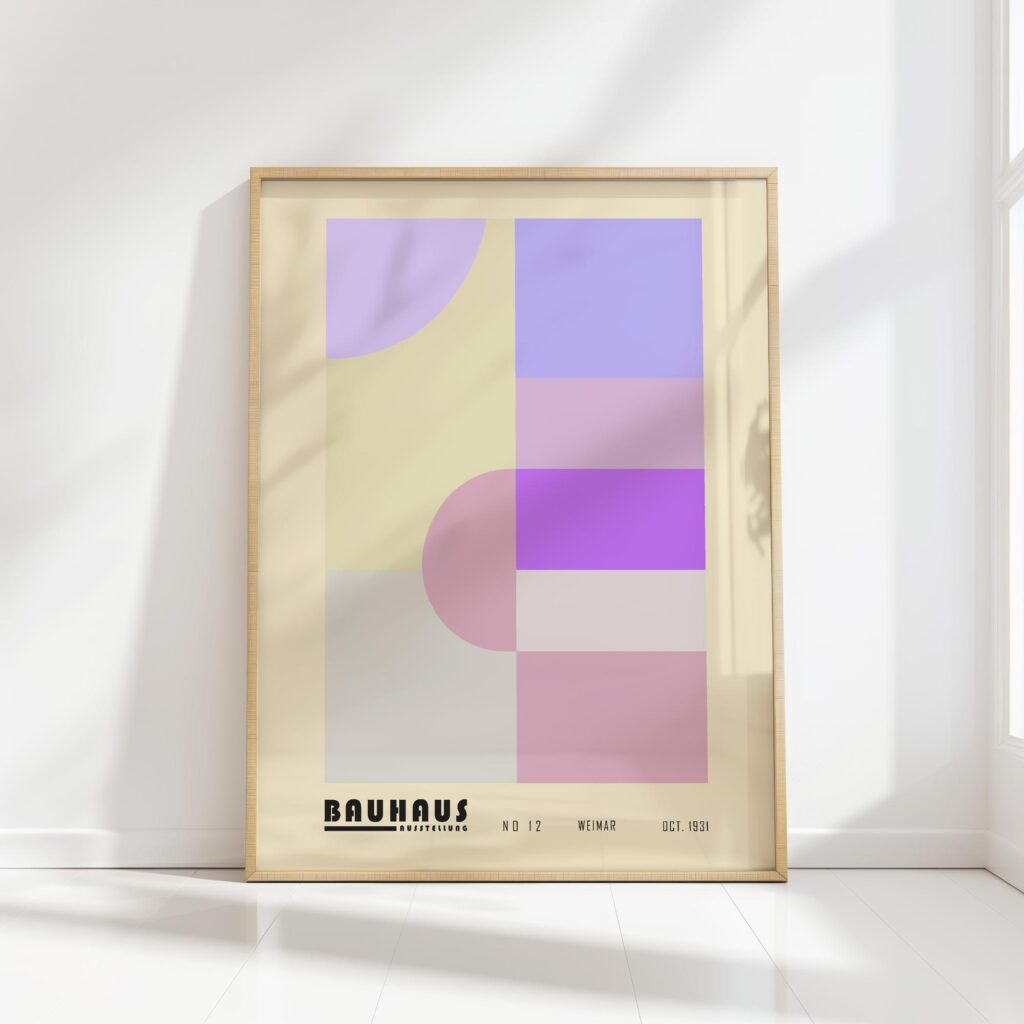 This high-quality Bauhaus print showcases an abstract geometric design that blends soft, serene pastel hues with bold simplicity. It features perfectly aligned shapes, including a central rectangle divided into bands of varying purples, and half-circles that subtly overlap the linear composition. The soft color palette exudes a calming atmosphere, making it an ideal decorative piece for modern interiors seeking a touch of tranquility and minimalist elegance. The print pays homage to the timeless Bauhaus aesthetic of clean lines and functional beauty, offering a piece that is both a nod to historical design and a contemporary artwork.