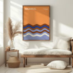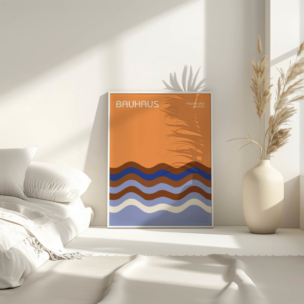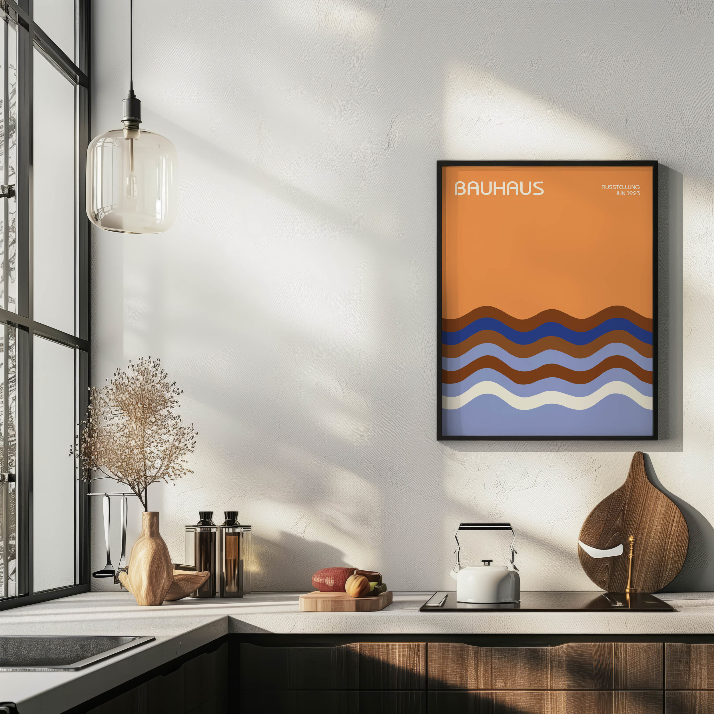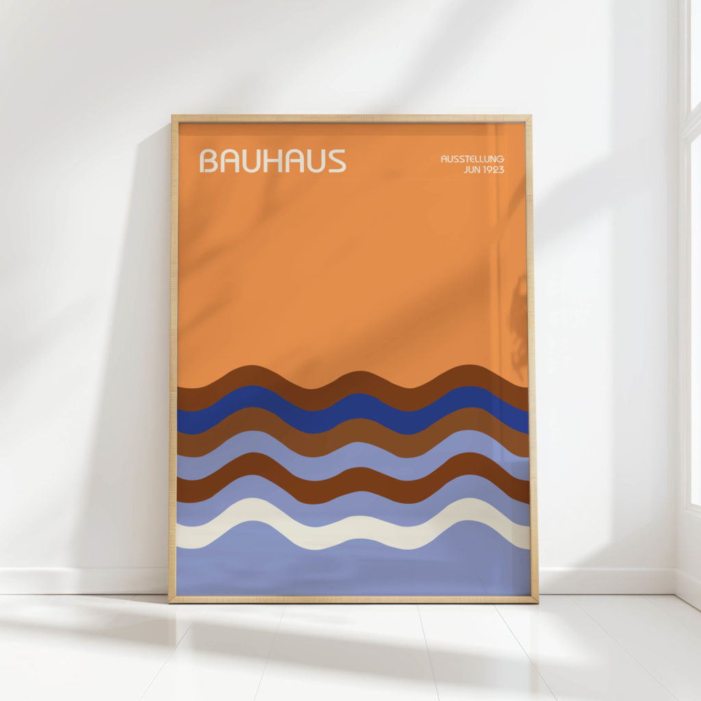 This high-quality print brings the iconic Bauhaus influence into your space. It showcases a series of abstract waves that create a dynamic sense of movement. The warm color palette transitions from a deep terra cotta to soft blue hues, imparting an elegant and contemporary aesthetic that captures the essence of modernist design principles. This artwork adds a sophisticated and timeless charm to any room, blending well with both modern and classic interior styles.