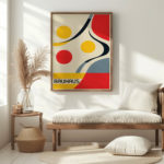 This high-quality print showcases a Bauhaus-style design with a modern twist, perfect for adding a touch of elegance and sophistication to any room. The composition consists of geometric shapes, such as circles and curved lines, harmoniously arranged against a warm color palette of red, yellow, grey, and cream. The strategic use of bold and dynamic forms creates a visually striking piece that captures the essence of the Bauhaus movement, known for its influence on modernist design and architecture. Perfect for art enthusiasts and those looking to introduce a classic yet modern aesthetic into their living space.