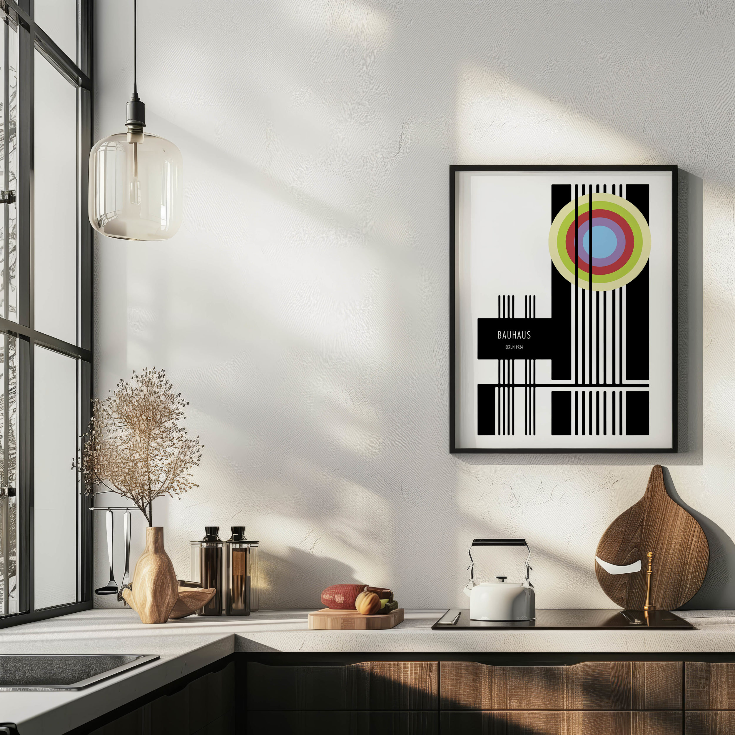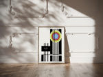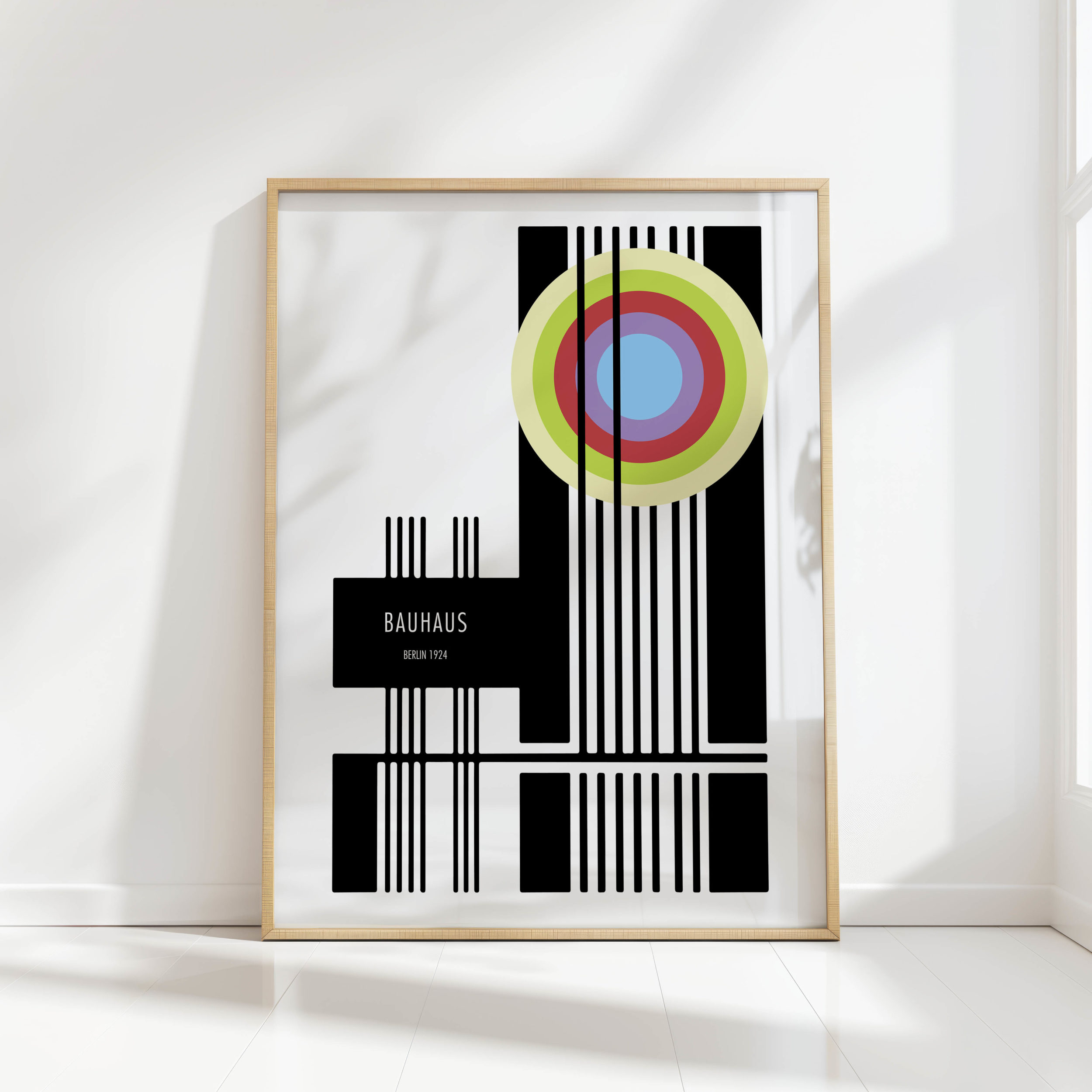This high quality print showcases a modern art representation that draws inspiration from the Bauhaus school of design. It features a stark contrast of black and white elements, complemented by a series of concentric circles in vibrant hues of blue, green, and red. The structured composition with clean lines and geometric shapes creates an aesthetically pleasing and thought-provoking piece. It’s a versatile artwork that could serve as a focal point in a variety of settings, from an office to a living room, appealing to aficionados of modernist and contemporary design.