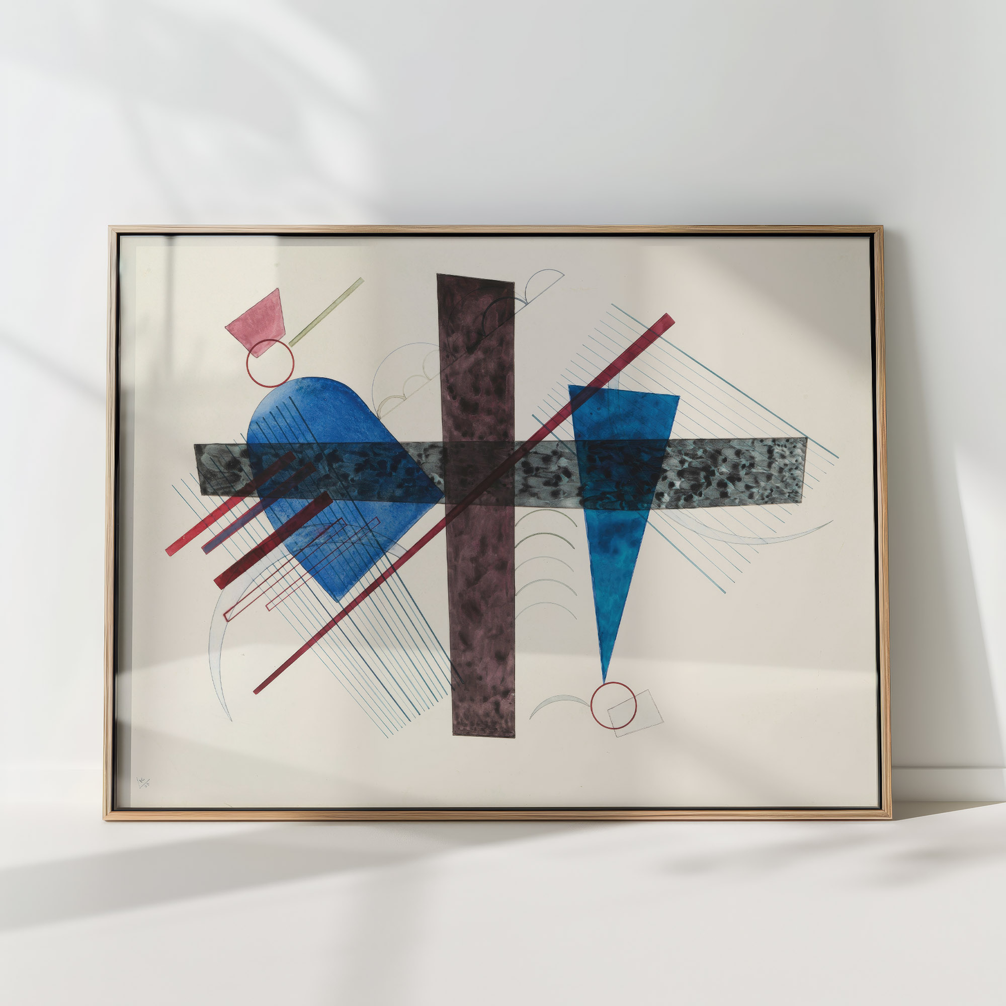 “Blau in Rund und Spitz” by Wassily Kandinsky captures an abstract composition where geometric forms intersect in a visual melody. Central to the image is a bold, blue curved shape, crossed by black textured forms and surrounded by accentuating red lines with circles. Delicate scribbles add movement, contrasting the starkness of the shapes. This print exudes a sense of balance and dynamic tension through its symphony of color and form.