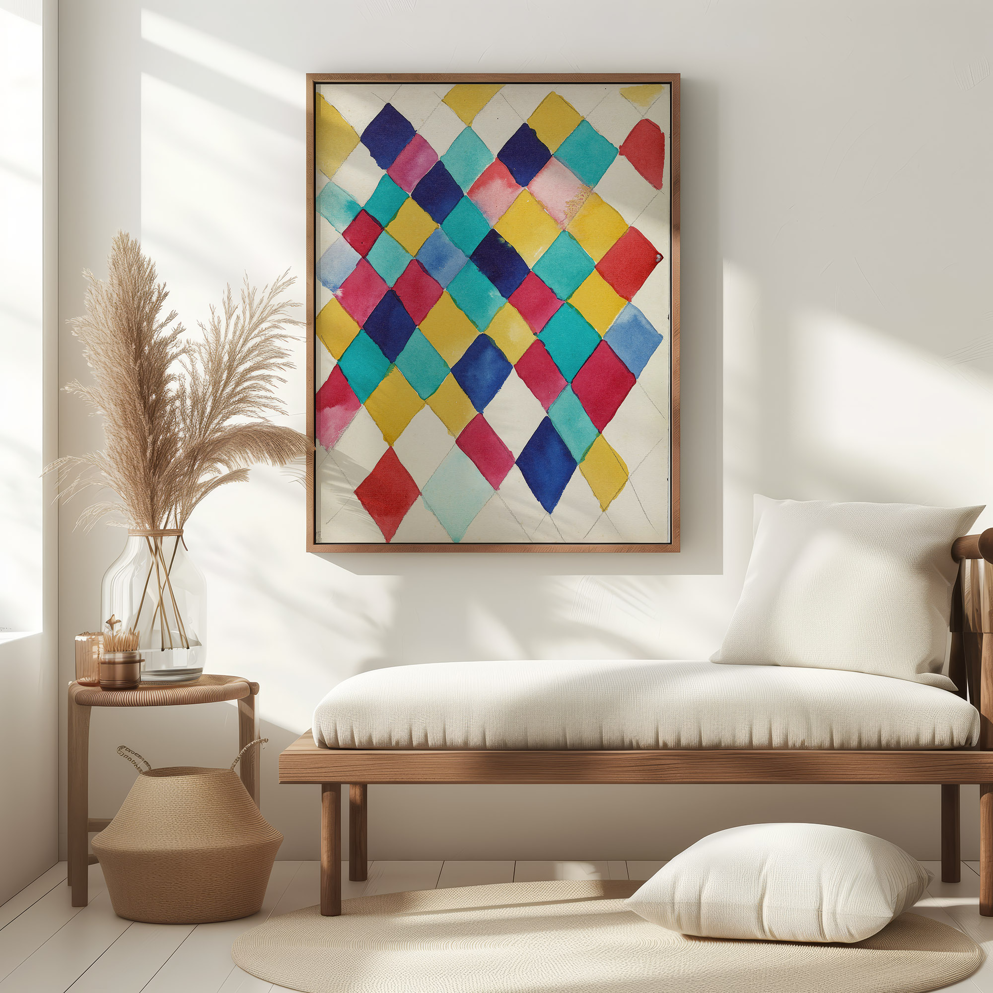 The work “Farbstudie mit Rauten” by Wassily Kandinsky showcases a colorful geometric mosaic. Displaying vibrant hues of blue, yellow, red, and pink, rhombuses interlock in a captivating, checkerboard-like composition. The harmonious blend of shades and shapes exemplifies abstract visual rhythm, inviting contemplation on the relationships between color and form.