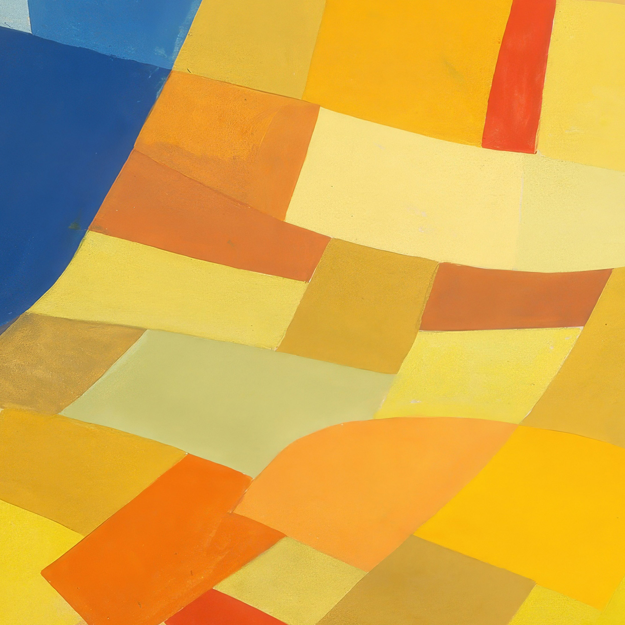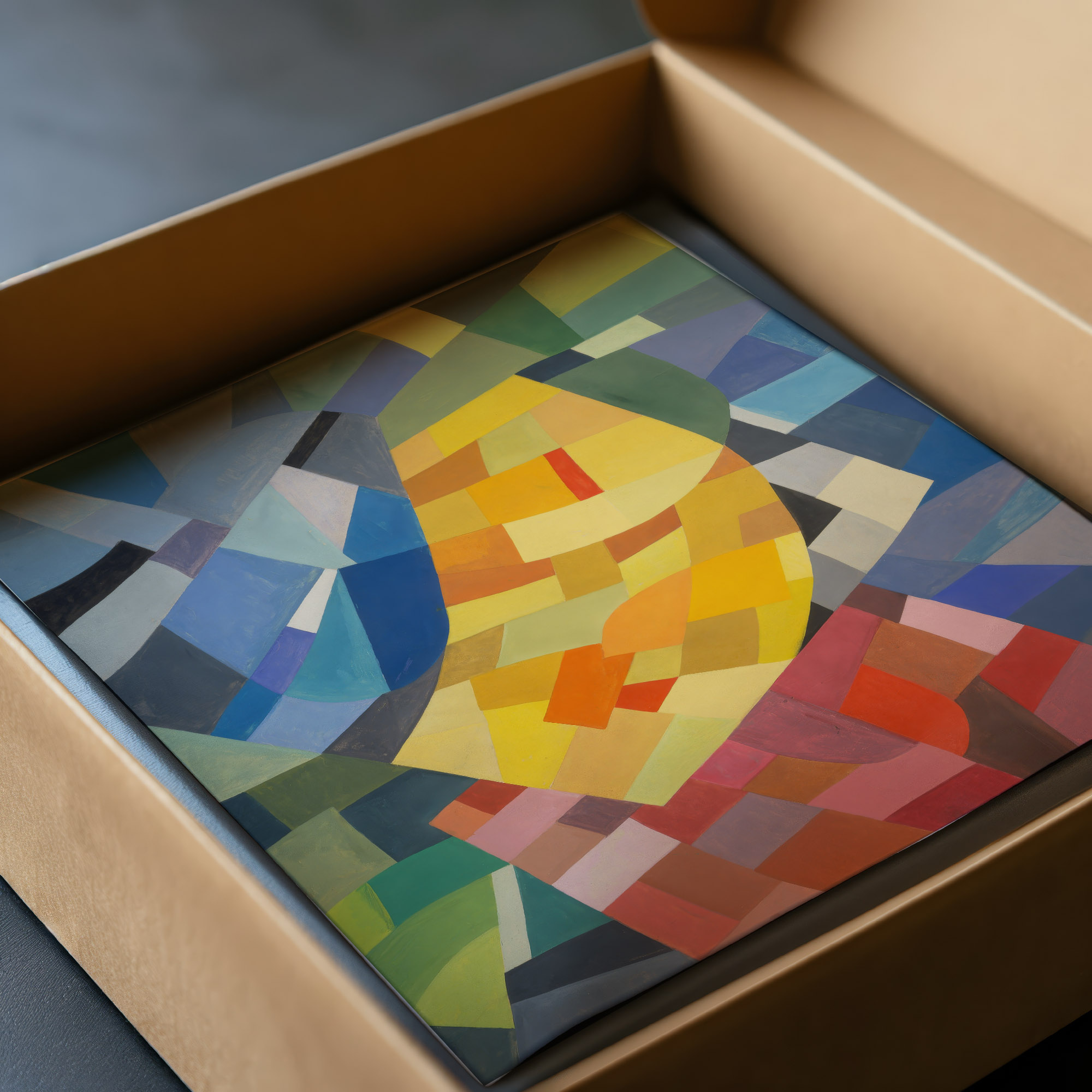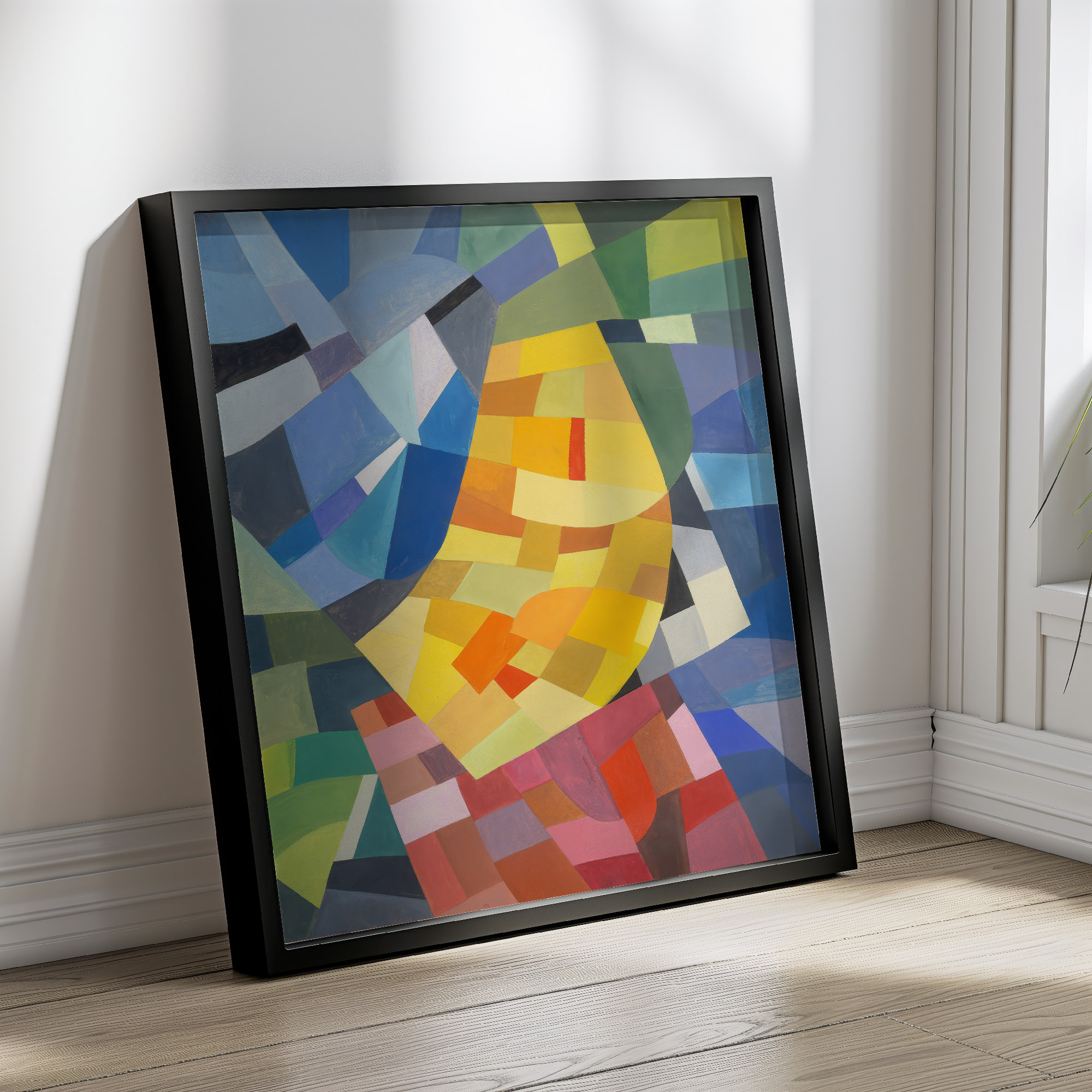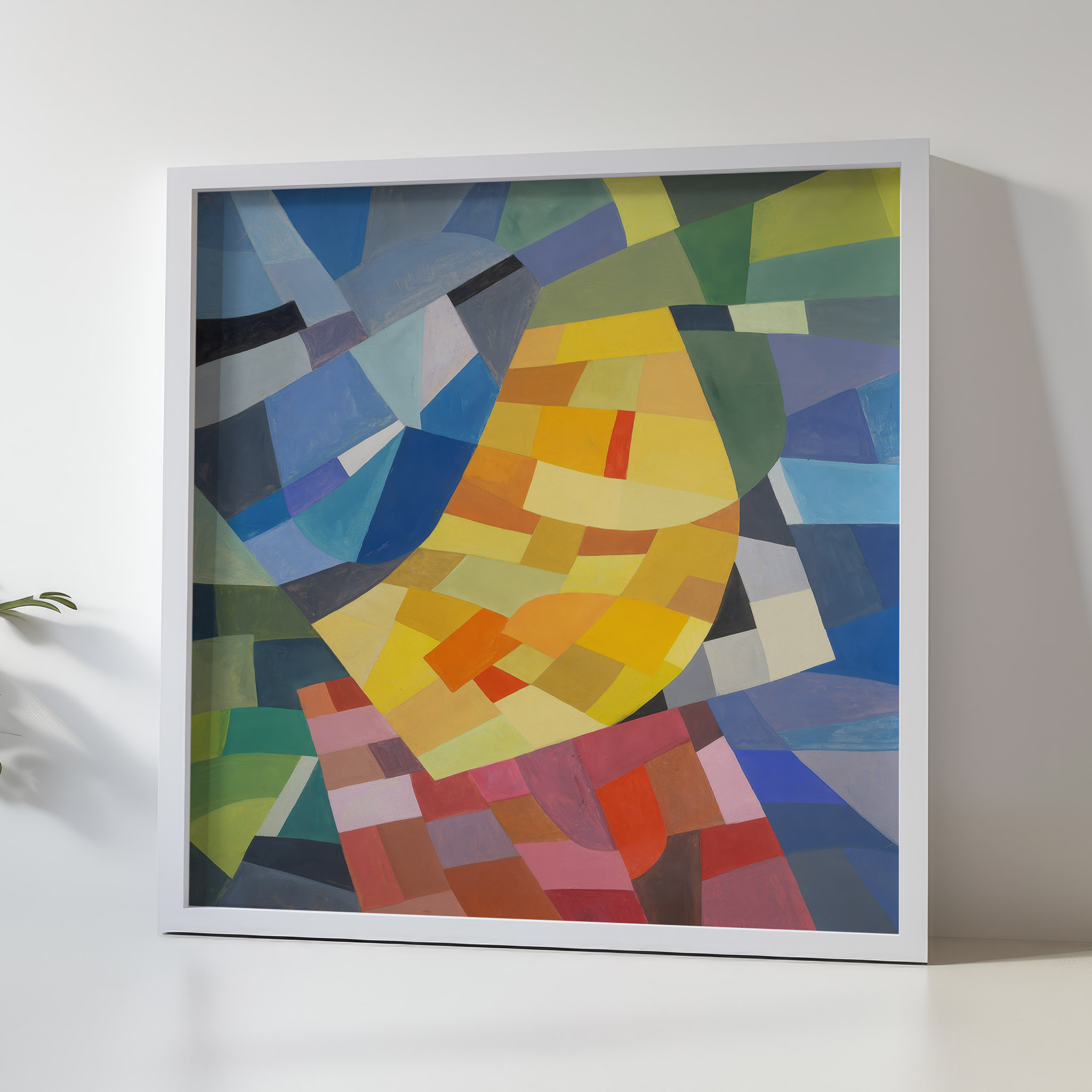 The print “Komposition (1930) – Otto Freundlich (1)” exhibits a dynamic array of geometric shapes intricately composed to form a tapestry of color and form. Vivid shades intertwine with muted tones, presenting a visual symphony where each element contributes to a sense of balance and unity. The interplay of color and shape suggests movement and depth, engaging the viewer in a contemplative analysis of the relationships between the individual components within the piece.