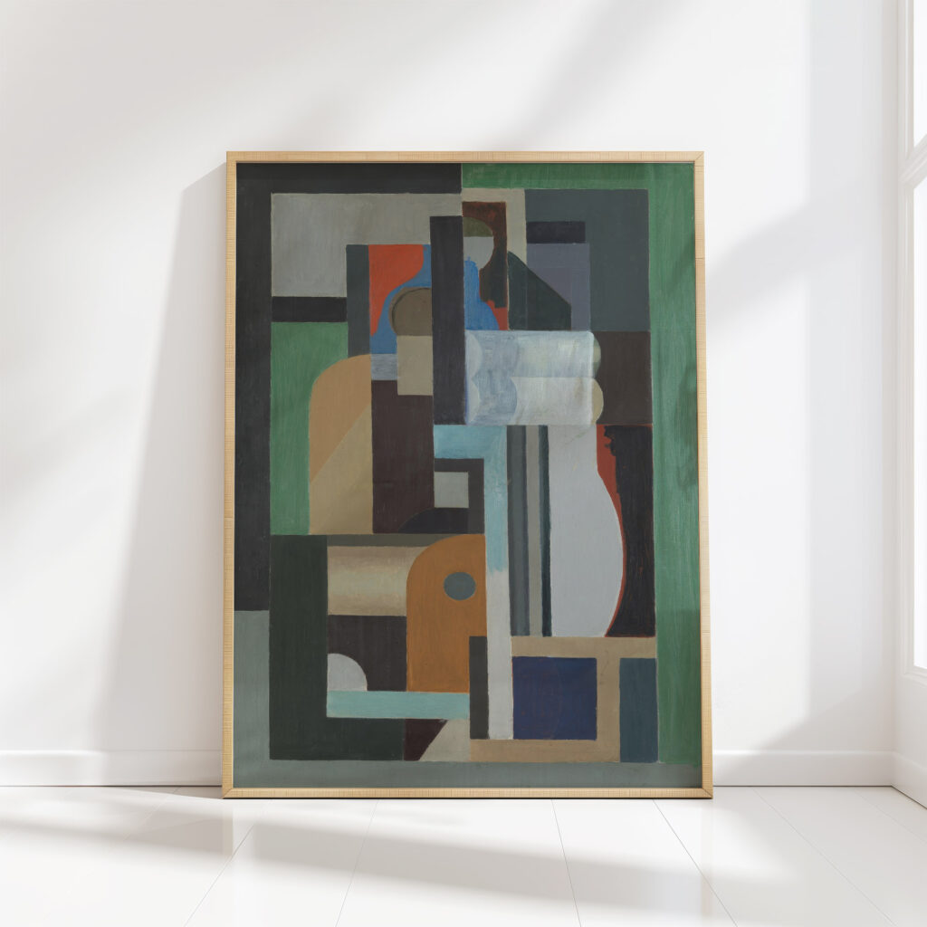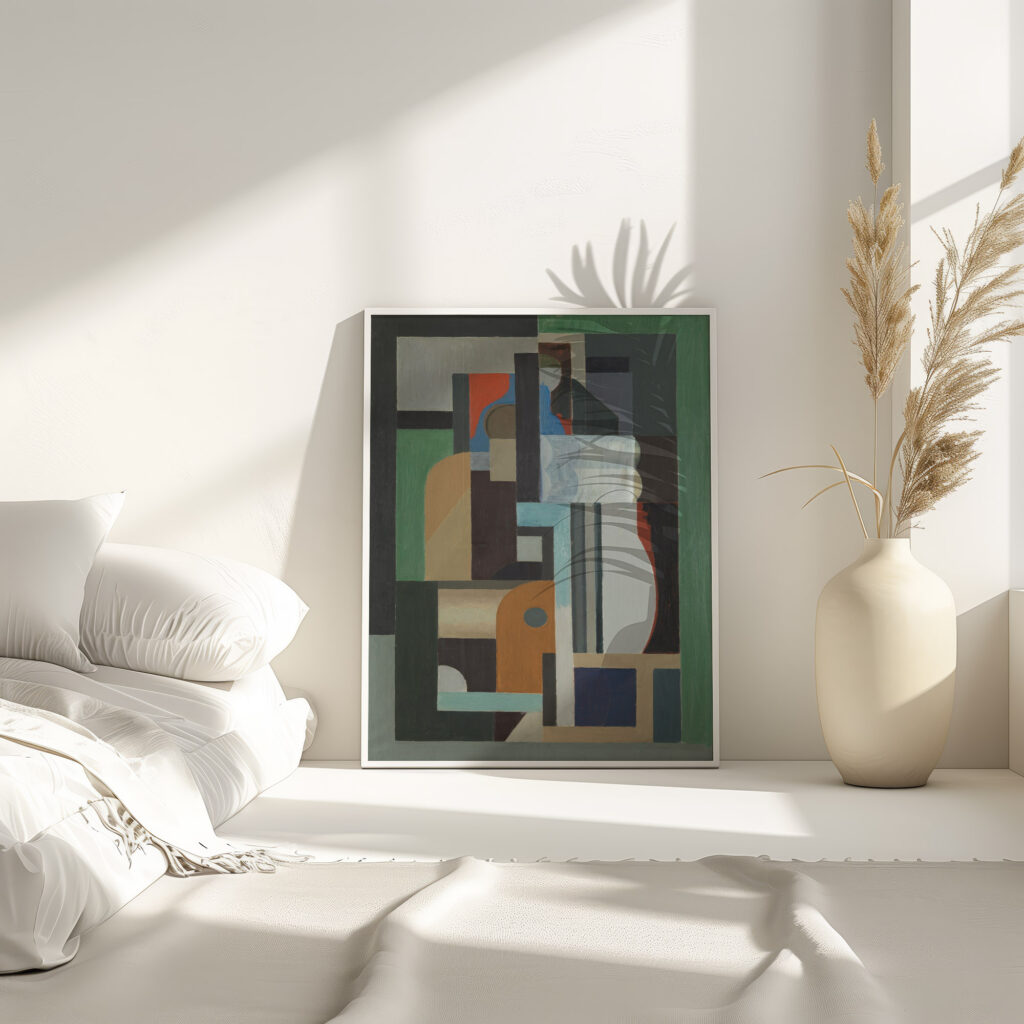 “Composition – Ragnhild Kaarbø” presents a study of form, space, and color interaction. It is an abstract creation using various geometric figures layered and intertwined, suggesting depth and perspective. The juxtaposition of shapes and the thoughtful composition evoke a sense of balance. While predominantly using straight lines and angles, the inclusion of a curved form adds a dynamic contrast to the overall rigidity. The color scheme ranges from earthy and subdued tones to segments of more vivid hues, contributing to a focal point amid the complexity. This careful orchestration of elements results in a captivating visual puzzle.