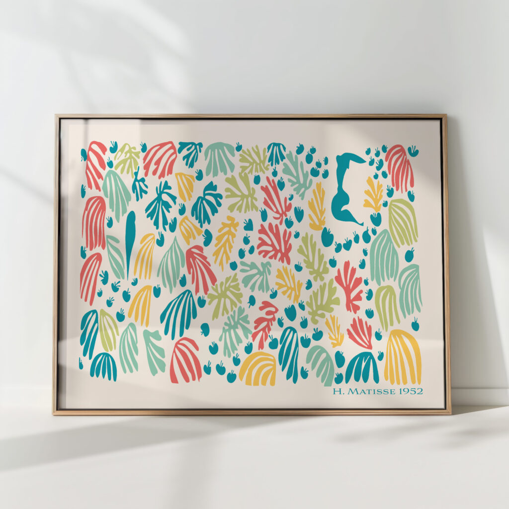 This high-quality print showcases Henri Matisse’s La Gerbe from 1953, a masterpiece characterized by its bold use of color and abstract form. The composition is alive with a variety of shapes resembling leaves and natural elements, arranged in a rhythmic pattern that almost seems to dance across the canvas. A distinct blue silhouette stands out, adding depth and intrigue to the dynamic array of forms. The piece exudes a lively, energetic vibe that’s reflective of Matisse’s innovative approach to art during the modernist period. It would make a striking statement in any contemporary interior, bringing a touch of Matisse’s genius into the home.