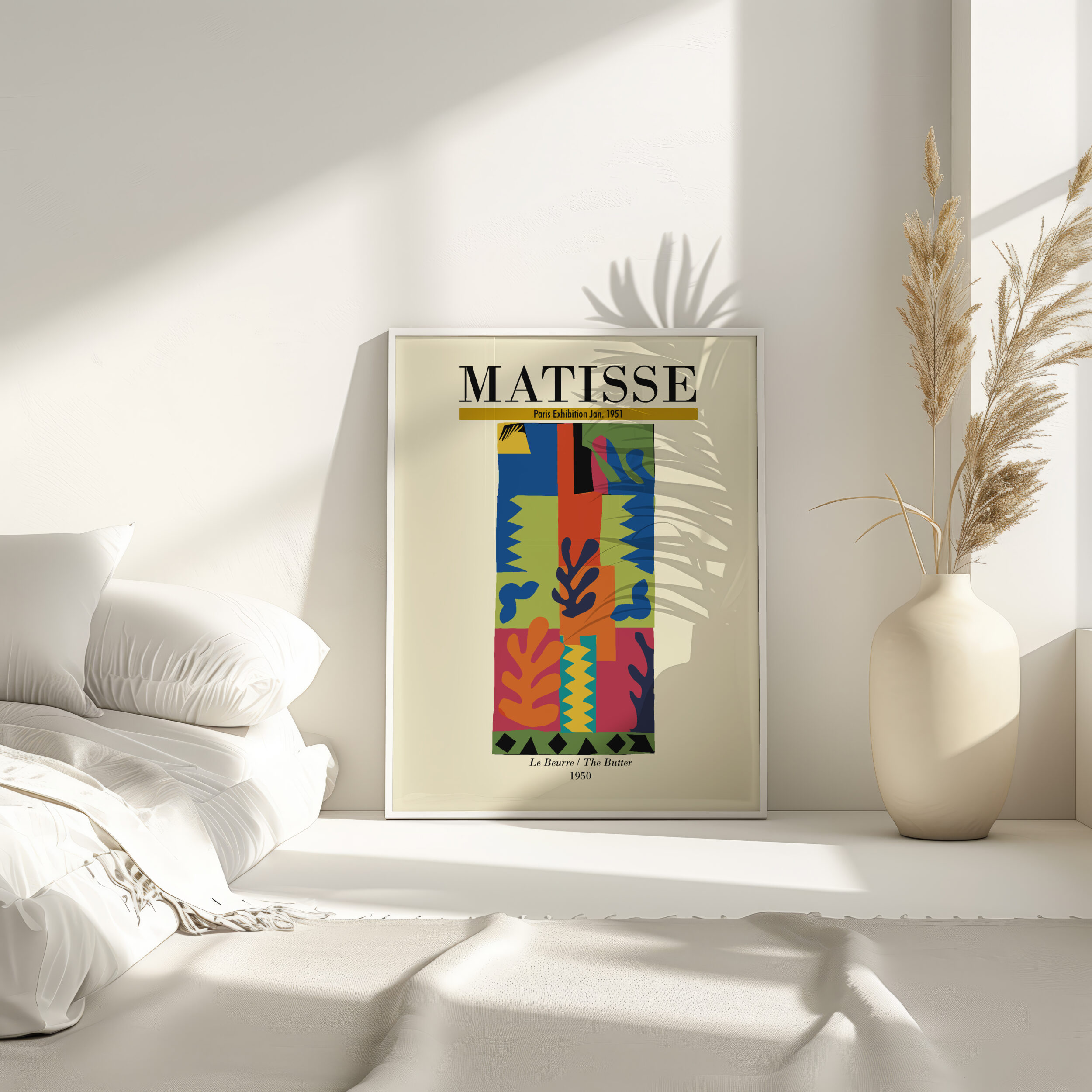 Henri Matisse’s Le Beurre is a striking example of modernist abstract art. This high-quality print captures the essence of the original work showcased at the Paris Exhibition in 1951. Known for his masterful use of color and form, Matisse creates a dynamic composition with bold, flat shapes and a palette of primary and secondary colors. Abstract leaf-like figures and geometric patterns draw the eye, creating a tapestry of interconnected segments. Perfect for admirers of Matisse’s groundbreaking approach and those looking to add a touch of mid-century modern vibrancy to their space. This piece embodies the innovative spirit of Modernism, making it a timeless addition to any collection.