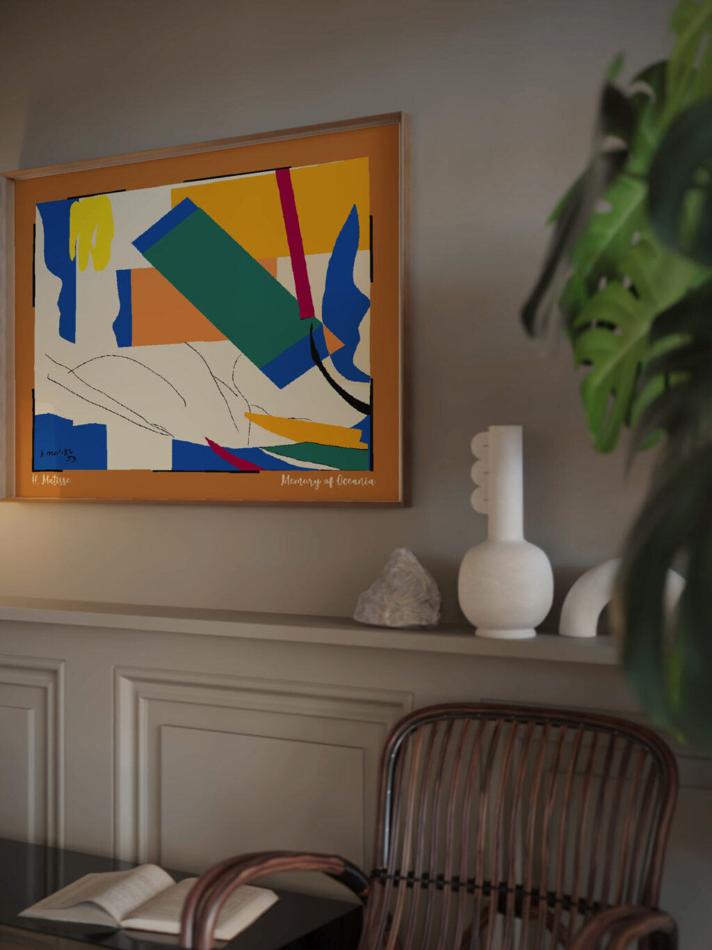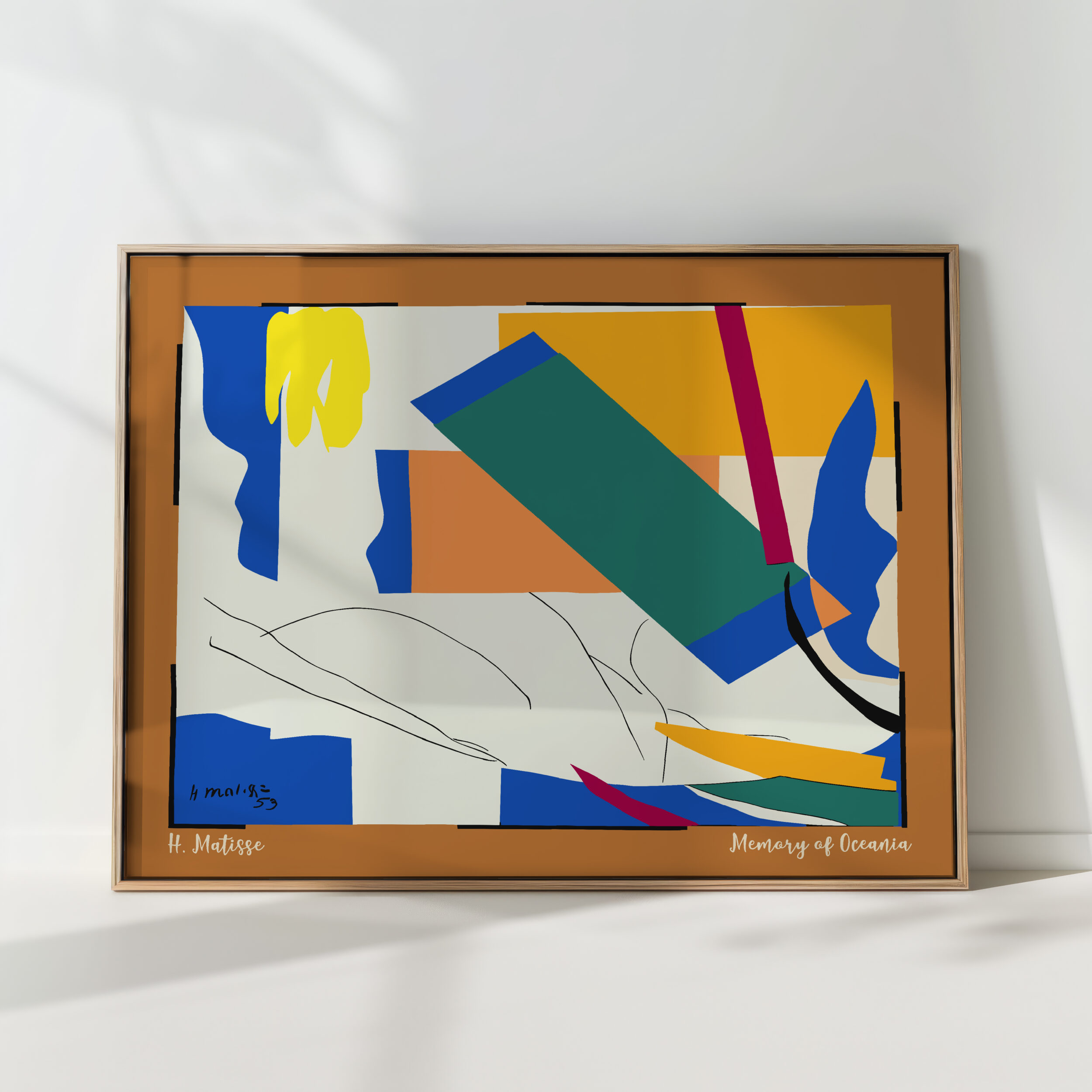 This Henri Matisse print features Memory of Oceania, a work that encapsulates the artist’s abstract exploration through bold shapes and colors. The composition is a lively interaction of vibrant hues and geometric forms, creating a dynamic visual narrative. Matisse’s confident use of color block juxtapositions against a neutral background results in a captivating and timeless piece. This evocative artwork can enhance any living space, bringing Matisse’s innovative vision of abstraction and his rhythmic interpretation of the exotic landscape.