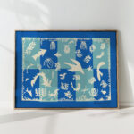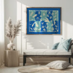 This striking Henri Matisse print presents a lively composition of cut-out forms on a cool blue backdrop, evocative of underwater marine life. The playful arrangement of birds, coral, and foliage-like figures exemplifies Matisse’s innovative cut-out technique, where he carved into color, creating a dynamic interplay between figure and space. It captures a sense of movement and spontaneity while reflecting the artist’s late-career exploration into simplified forms and bold colors. This piece would make a joyful and thought-provoking addition to any collection, inviting interpretation and admiration.