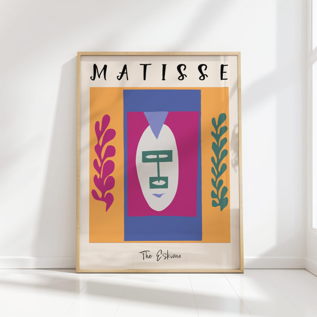 This Henri Matisse Print titled The Eskimo features a stylized face centrally composed within a geometric border. Matisse’s use of contrasting colors and shapes creates a dynamic and lively visual experience. The simple yet expressive facial features are surrounded by leaf-like motifs, which resonate with Matisse’s signature use of plant shapes. This fine art print embodies a vibrant blend of figuration and abstraction, capturing the essence of Matisse’s innovative artistry.