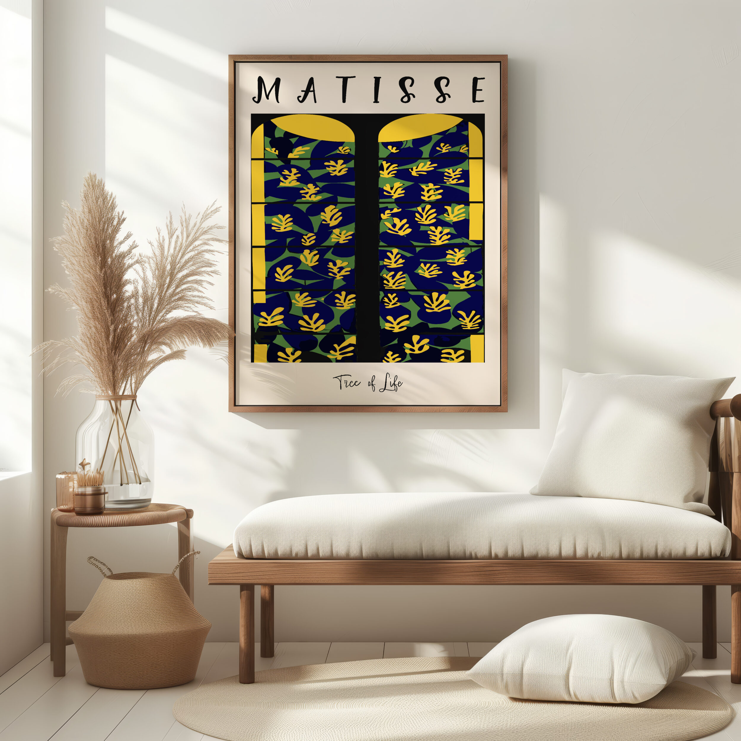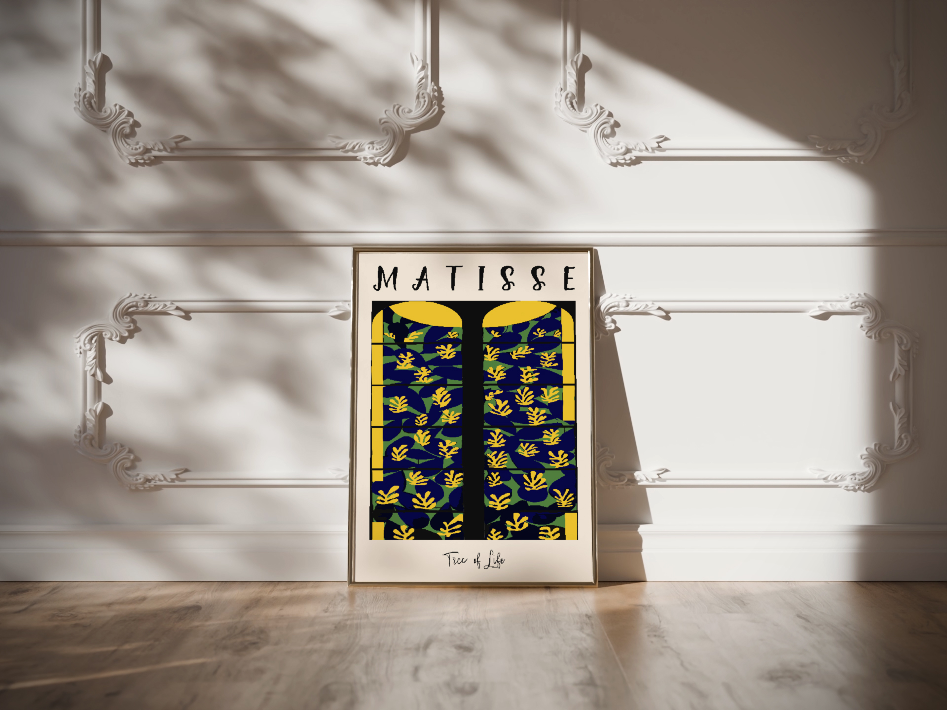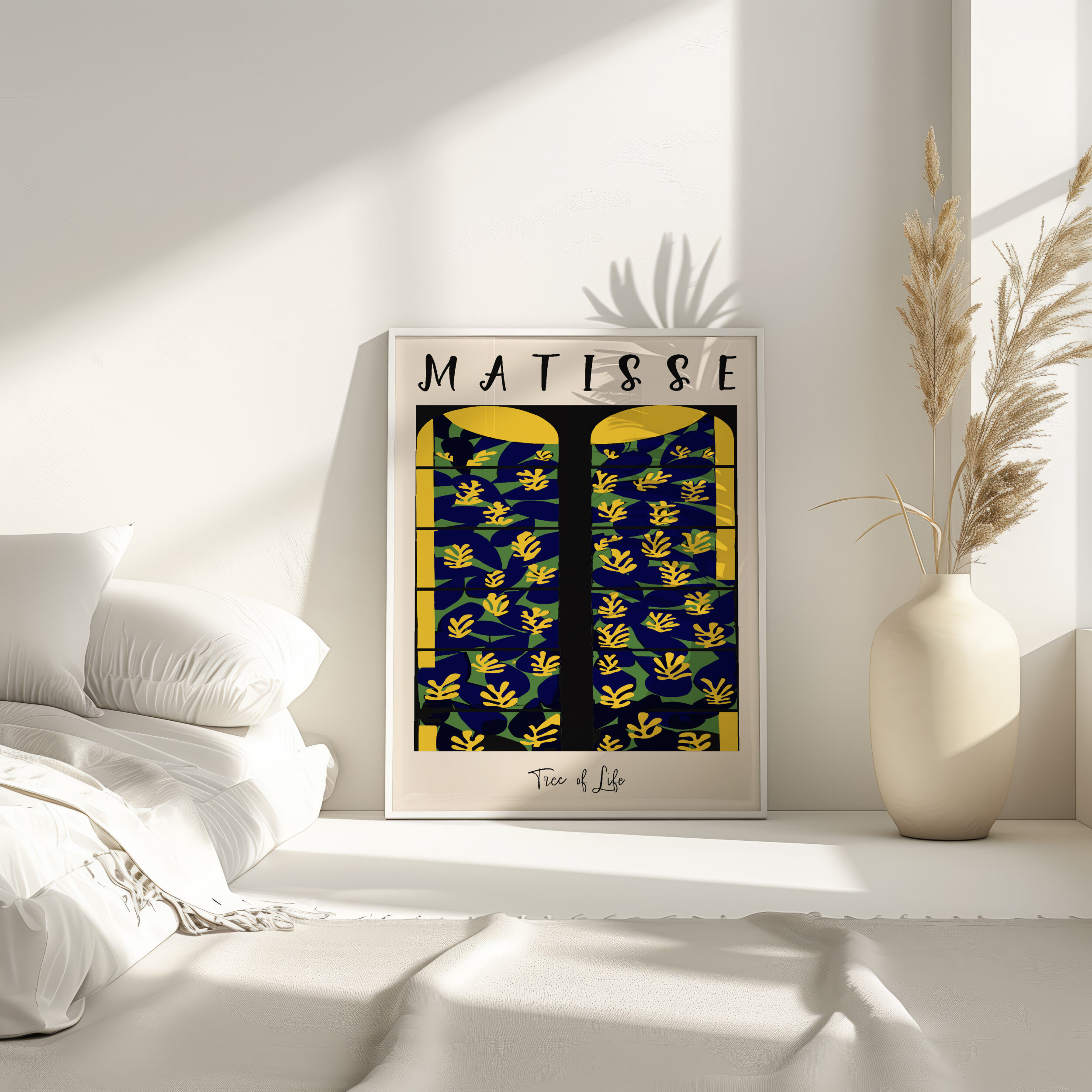 This Henri Matisse print features the Tree of Life, a vibrant display of colors and patterns. Dark blue serves as the background for the sprawling yellow tree with its multitude of leaves, creating a stark, joyful contrast. Matisse’s expert use of simple shapes and colors results in a visual feast that celebrates nature and its connection to human life. This piece is a beautiful example of modernist art, ideal for adding a touch of elegance and vibrancy to any space.