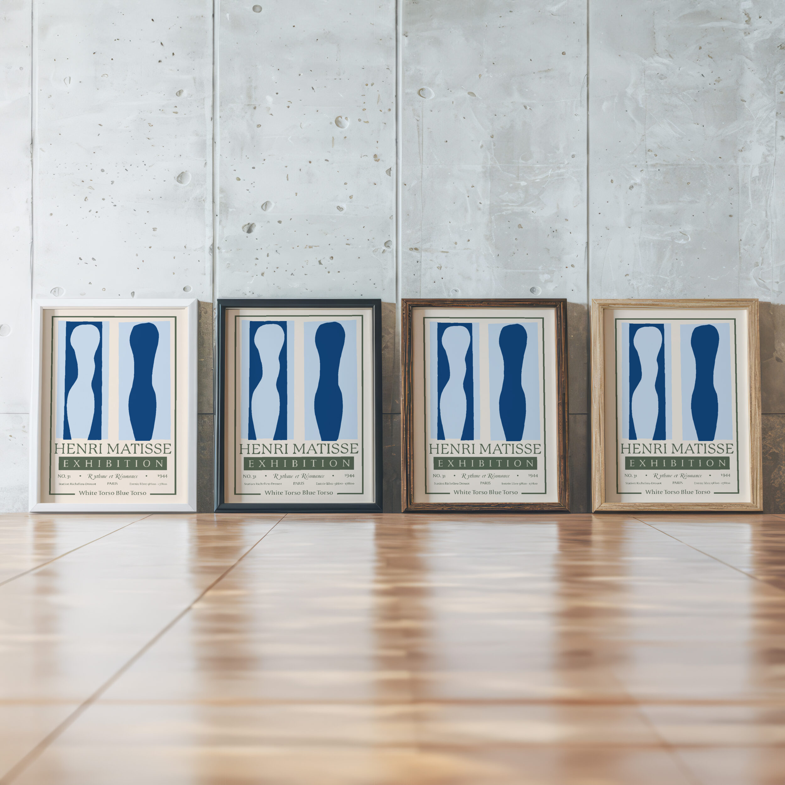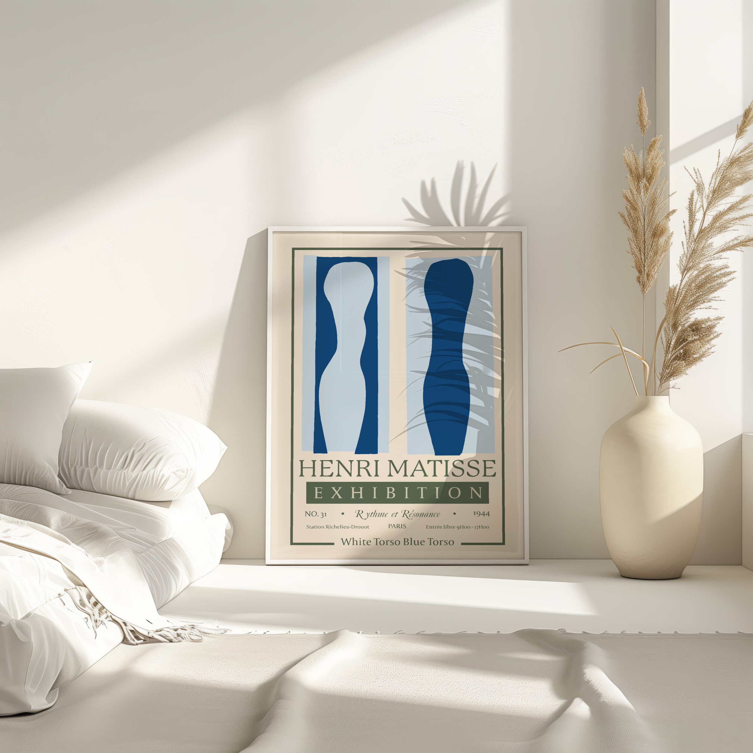 This print features a dual-torso design by Henri Matisse, a celebrated artist known for his bold, expressive use of color and form. The artwork exhibits two contrasting silhouettes in shades of blue and white, each torso mirroring the other, creating a rhythmic and resonant visual experience. The simplicity and elegance of the shapes against the minimal background highlight Matisse’s modernist approach, making it a timeless piece for any art lover’s collection.