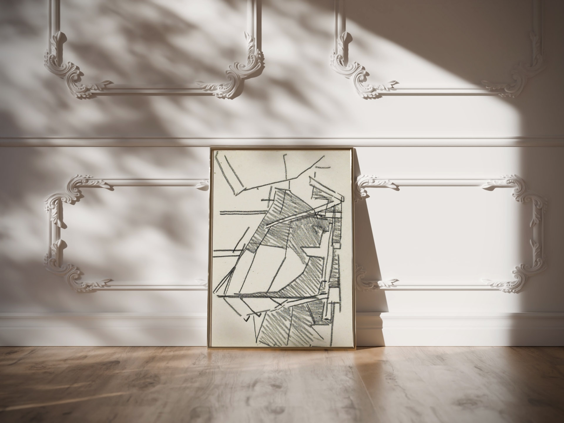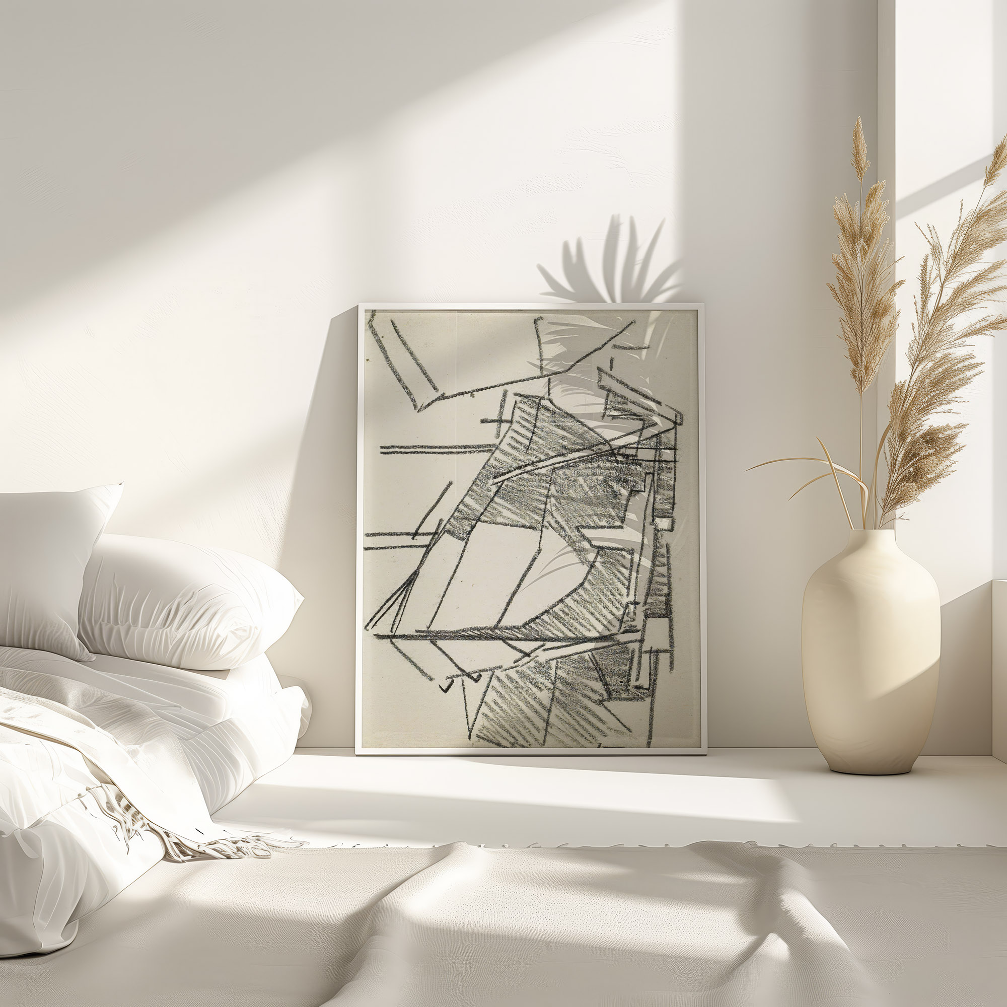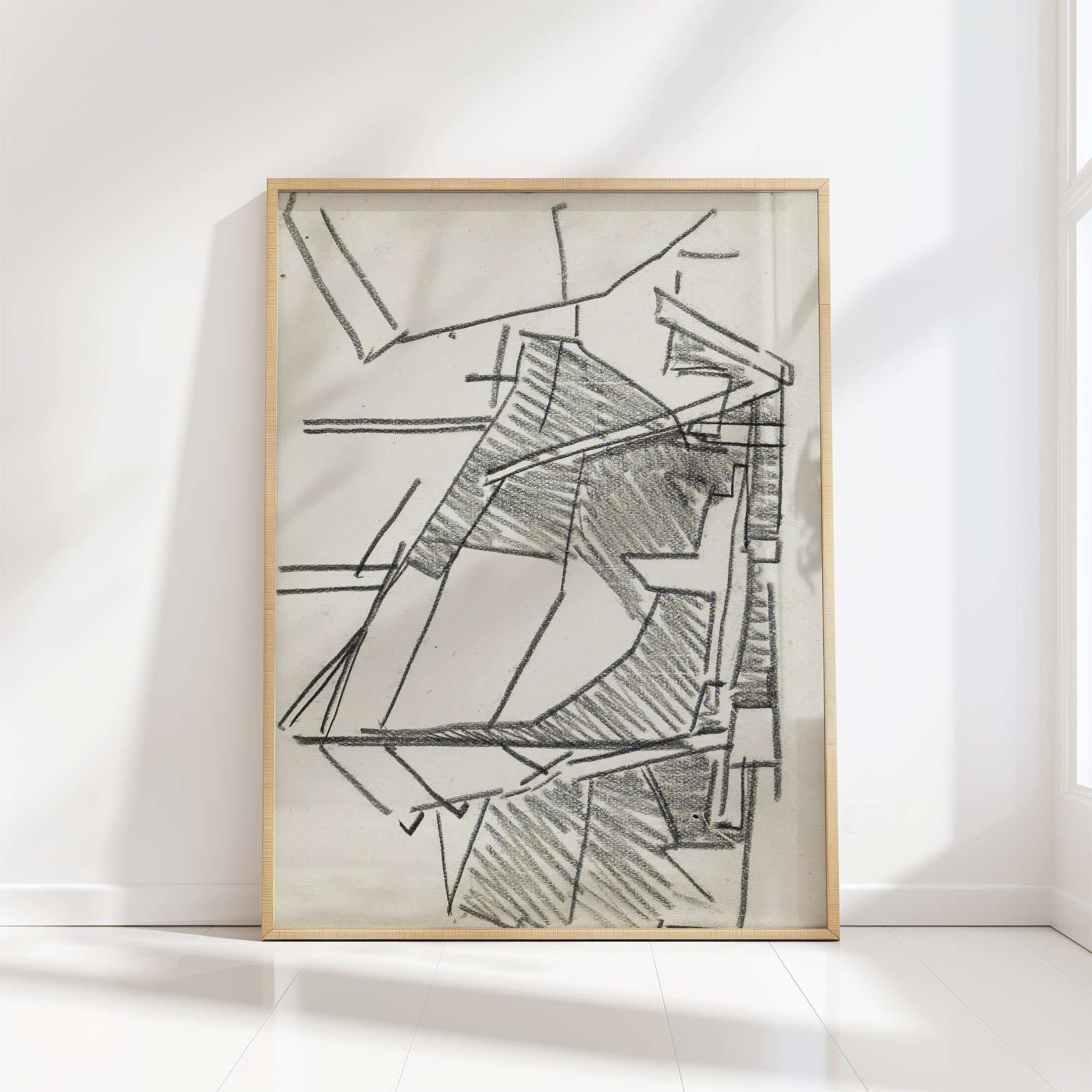 The image titled “Schip op een werfhelling” by Reijer Stolk features abstracted geometric shapes and lines that collectively suggest the form of a ship on a slipway. The work employs a sketch-like technique that captures the essence of shipbuilding and maritime activity. The use of contrasting directional strokes adds a sense of dimension and texture, evoking the industrial atmosphere of a shipyard and the complexity of nautical engineering.