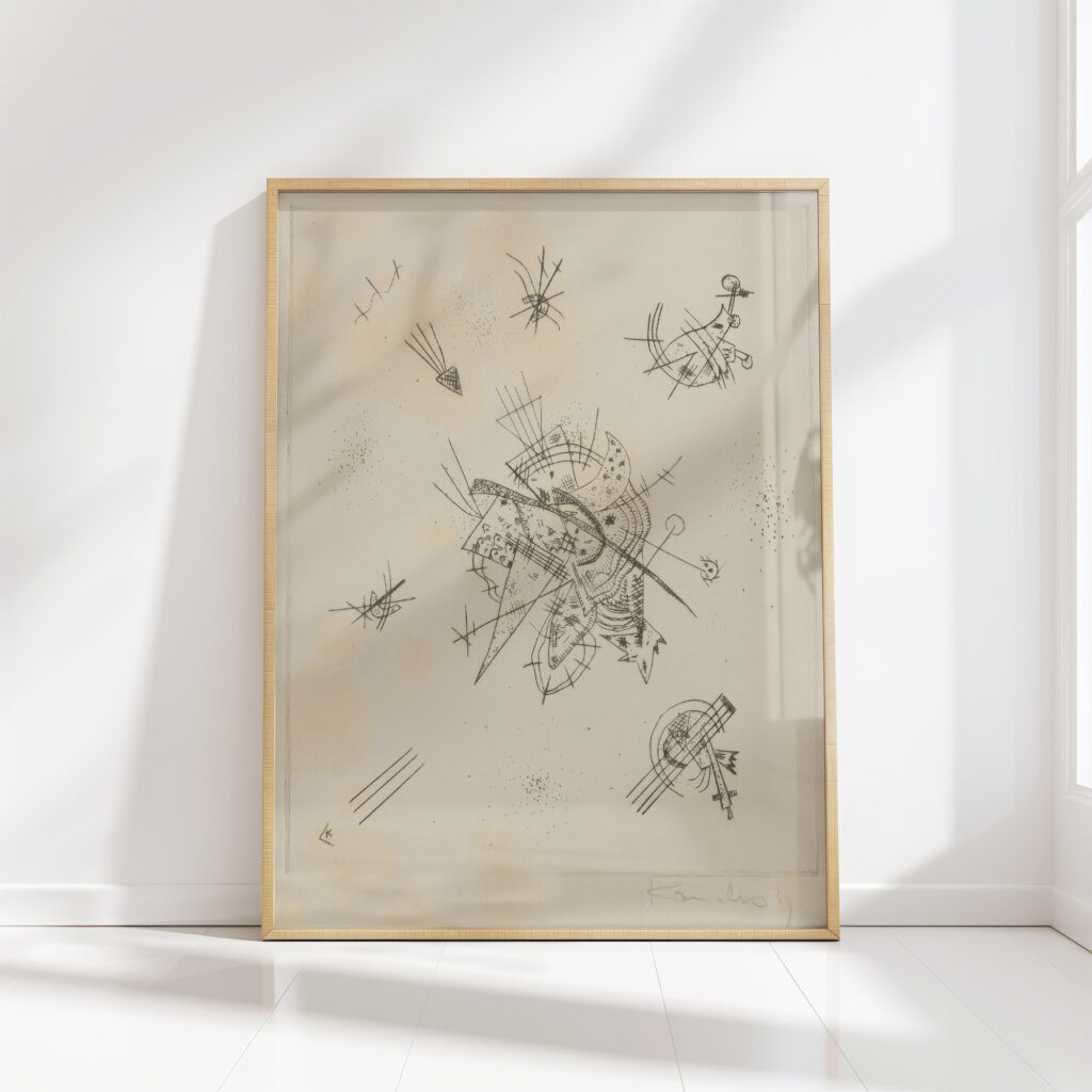 “Kleine Welten X (R. 173) (1922) – Wassily Kandinsky” displays a dynamic equilibrium of abstract motifs interlacing geometric shapes and lines with floating elements. The ensemble conveys a sense of rhythm and cosmic patterning, using a sparse black-on-white aesthetics to draw attention to each individual mark. The interplay of solid forms and staccato dot scatterings suggests a musicality, aligning with Kandinsky’s inclination towards synesthesia and his translation of auditory experiences into visual artwork. The print invites contemplation of the complex relationships between the shapes and the negative space they occupy.