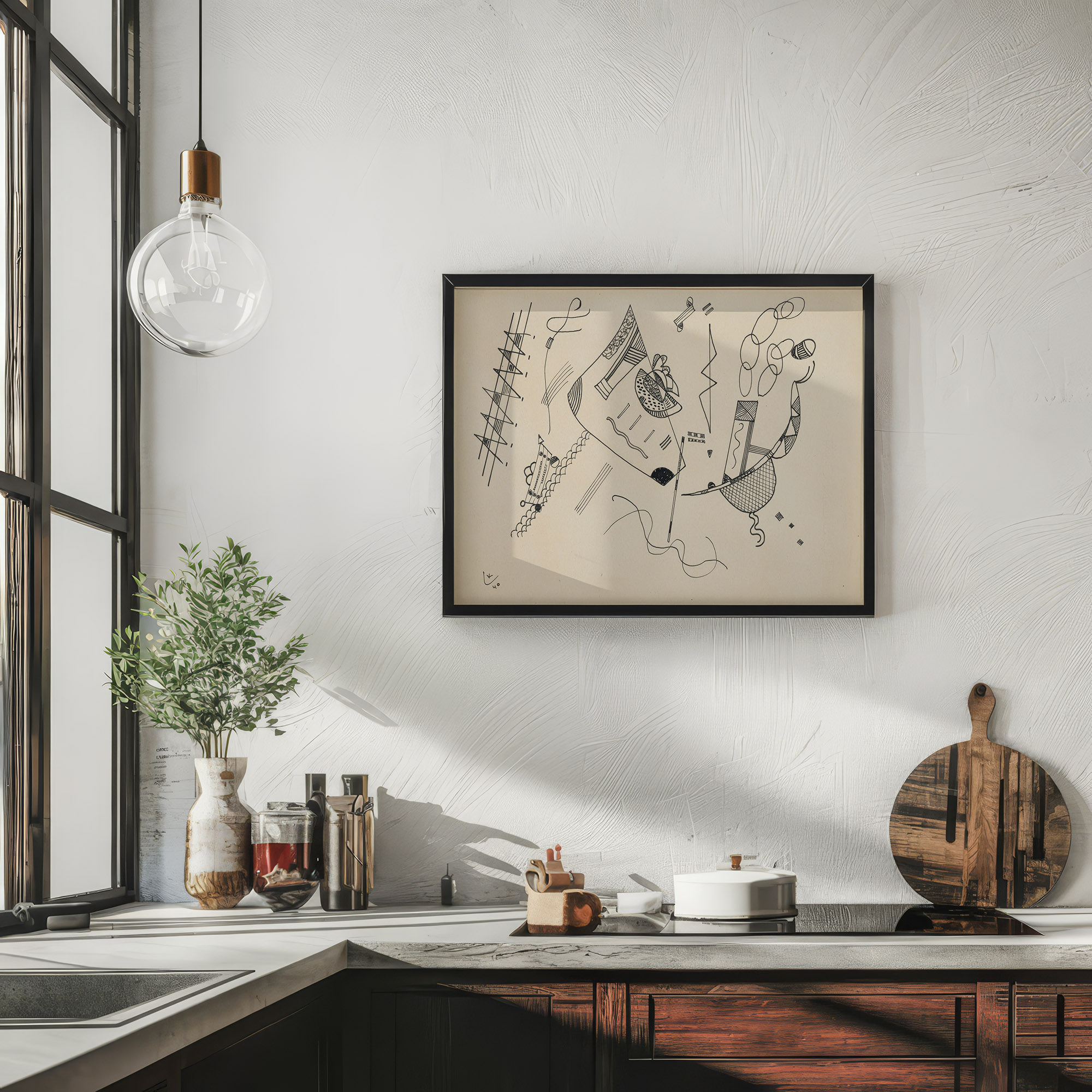 Wassily Kandinsky’s “Ohne Titel” is a striking exploration of abstract forms. The composition is a lively interplay of geometric shapes, fluid lines, and delicate patterns, inviting viewers into a visual symphony. Kandinsky creates a sense of depth and motion by juxtaposing various elements, evoking an almost musical quality that resonates with the viewer’s inner creative pulse.