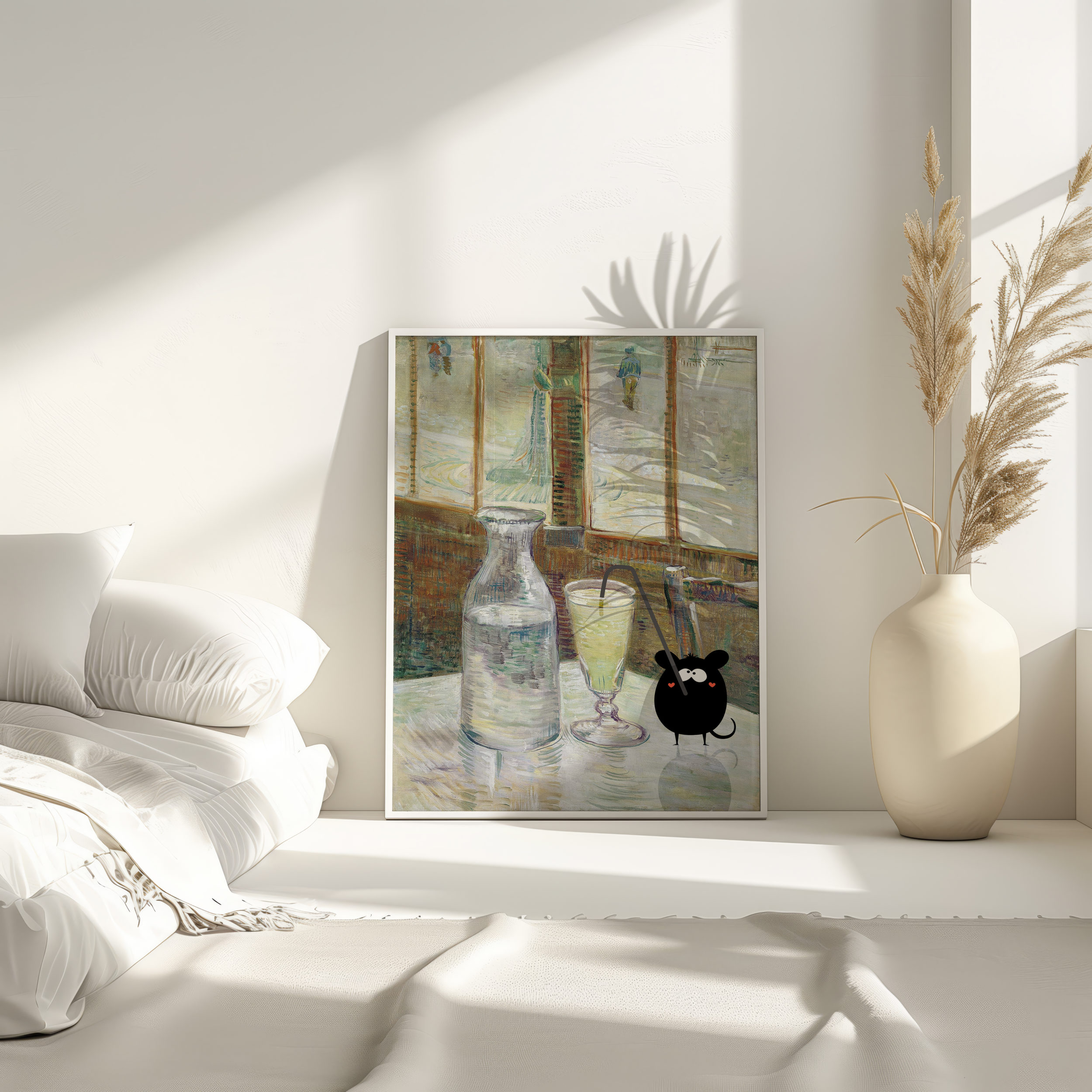 This print presents a unique juxtaposition of an animated character against the backdrop of an indoor setting. A clear glass and bottle sit prominently on a table, showcasing the tranquility of inanimate objects within a seemingly calm space. The room is suffused with soft tones, amplifying the light that streams through the large windows, hinting at a quiet establishment. The playful presence of the character adds a touch of whimsy to the otherwise still life-like depiction, inviting viewers to contemplate the synthesis of animated imagination with classical art elements. This piece is a conversation starter, an unexpected harmony between the animate and inanimate.