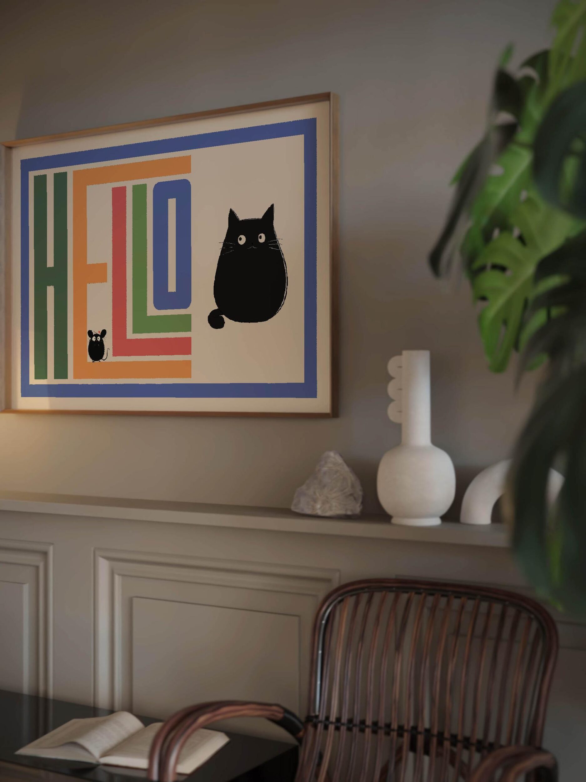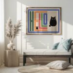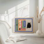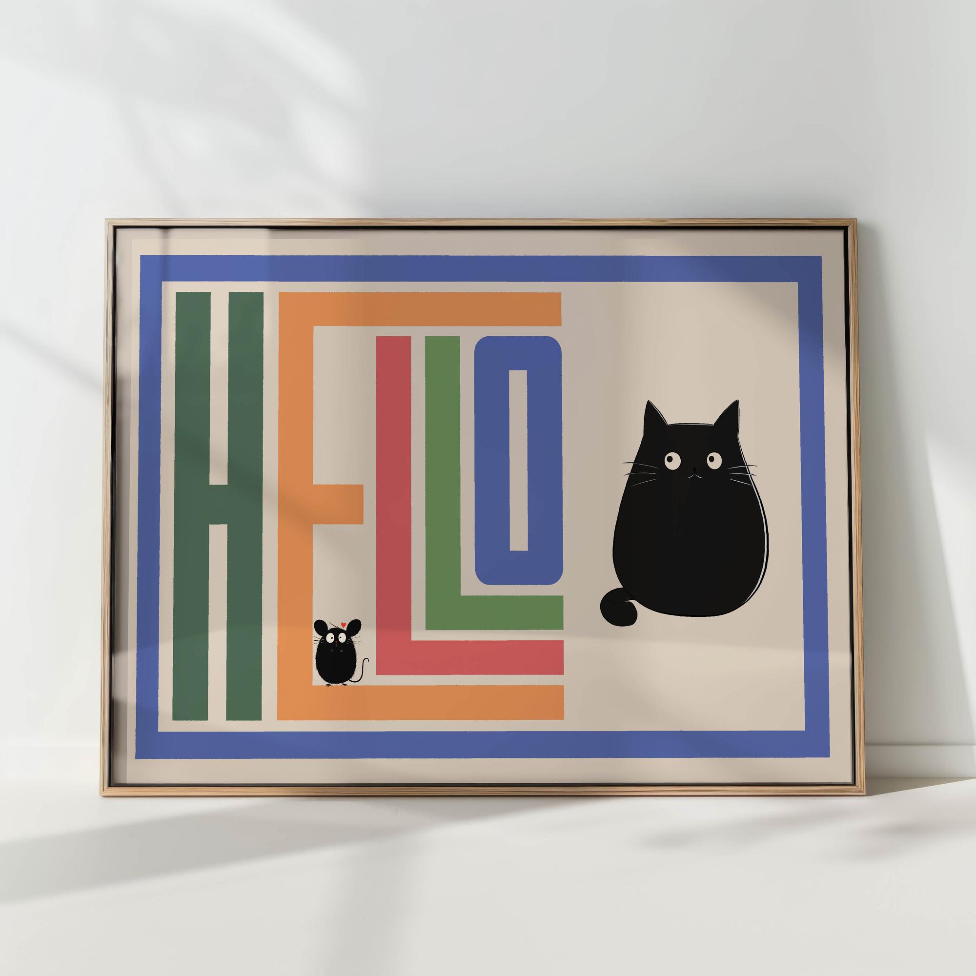 This print captures a playful scene with bold typography spelling out the word “Hello”. To the left, a curious mouse peeks out beside the oversized letter H, while to the right, a large black cat sits composedly. The pastel-colored letters contrast with the cat’s dark silhouette, creating a focal point that’s both humorous and engaging. The design’s clean lines and modern aesthetic make it a perfect addition to any contemporary setting, whether it’s a living room, a child’s bedroom, or a quirky workspace. This print invites smiles and adds a touch of light-hearted charm to your wall decor collection.