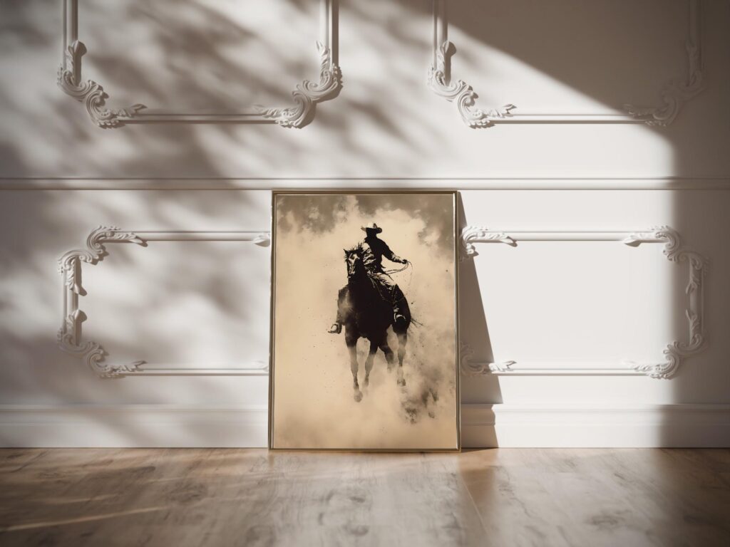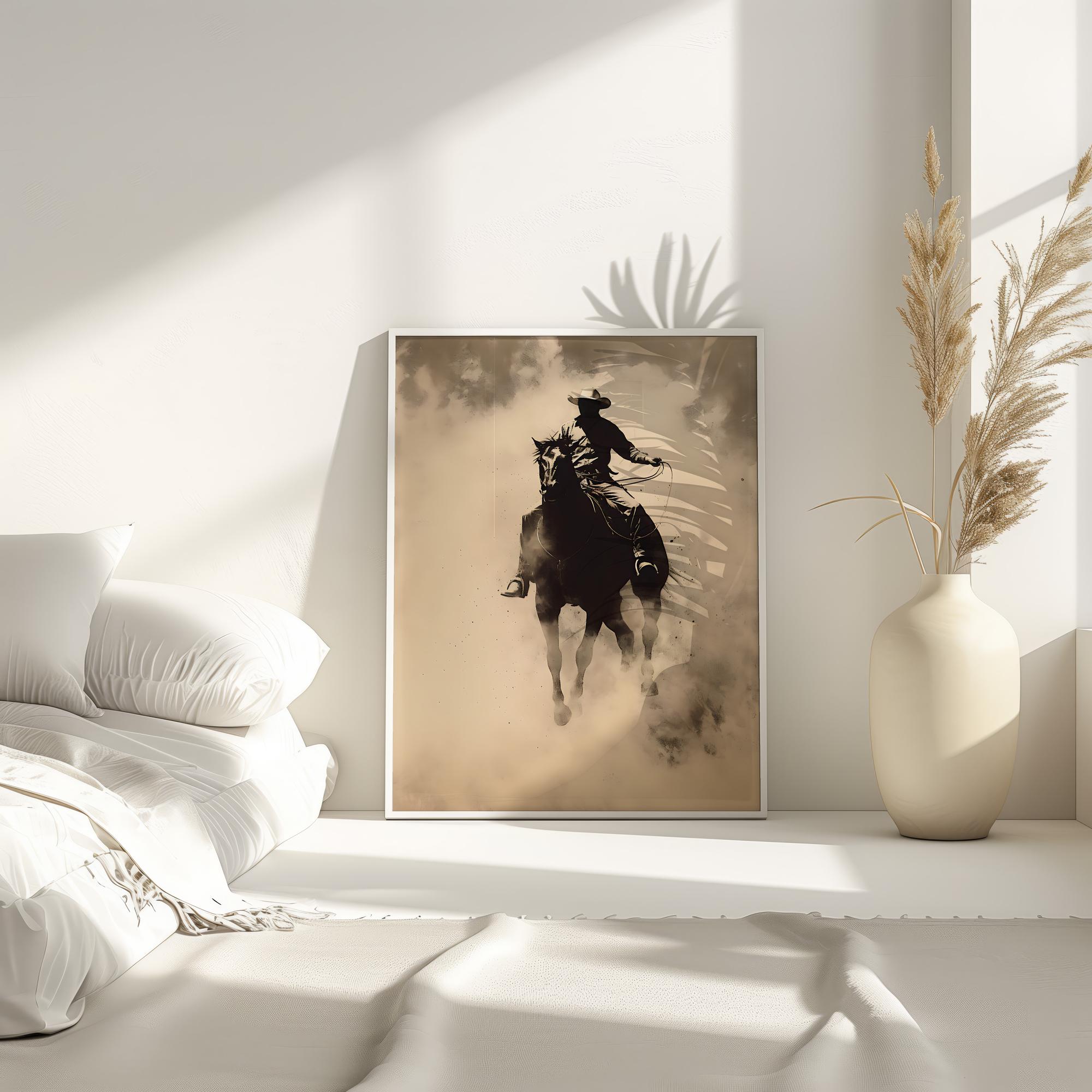 This striking print captures the dynamic essence of the Wild West with a silhouette of a cowboy confidently riding his horse through a cloud of dust. The sepia tones and rustic imagery evoke a sense of classic western adventure. This print is perfect for those who appreciate the raw beauty and nostalgia of cowboy culture, making it an ideal addition to any space that celebrates traditional American themes. The dusty atmosphere adds to the overall impact, creating a vibrant and engaging scene that transports viewers to the heart of a timeless tale.