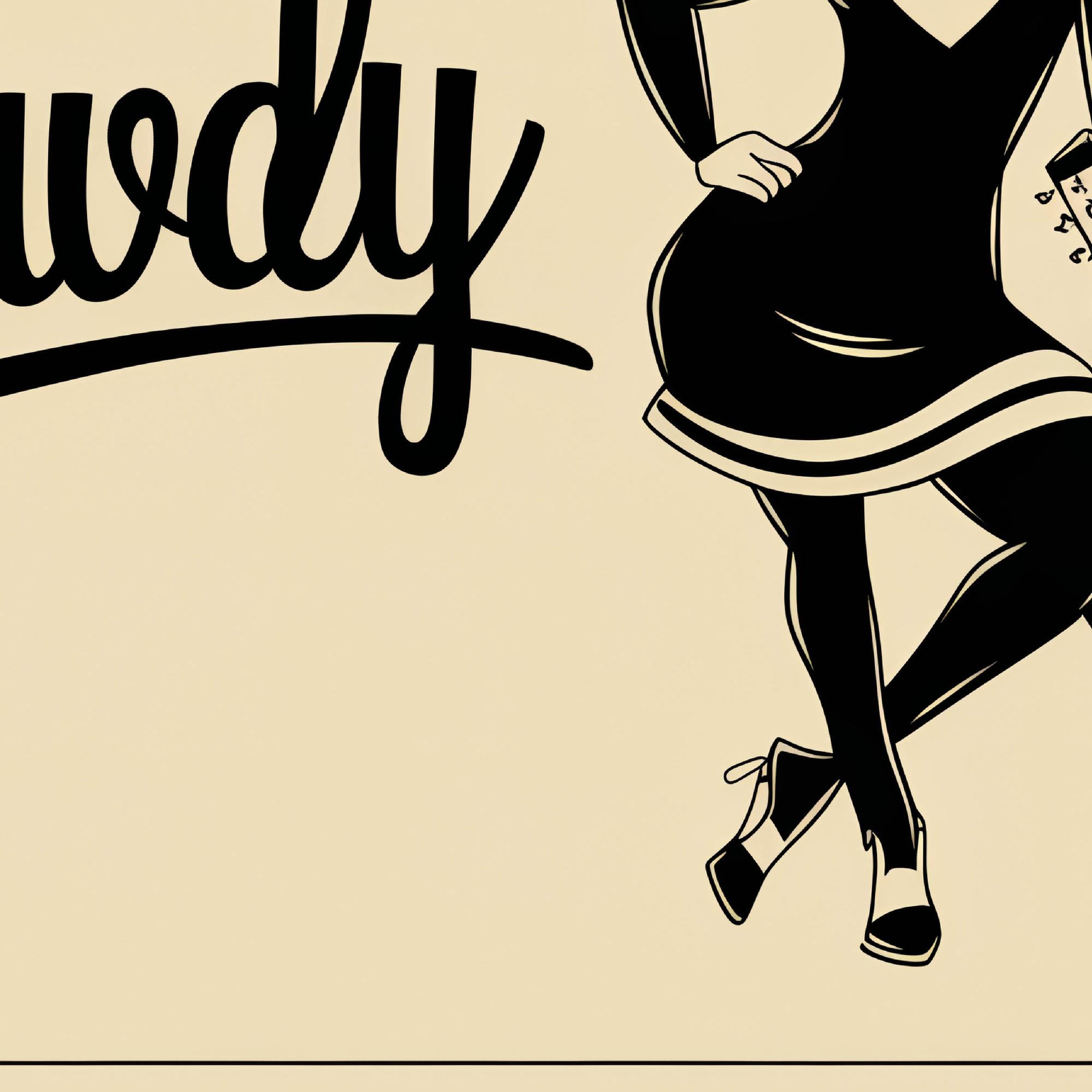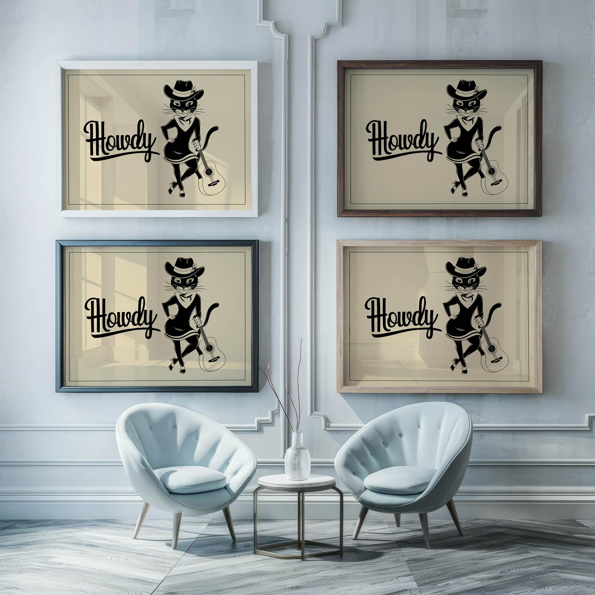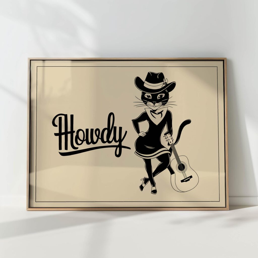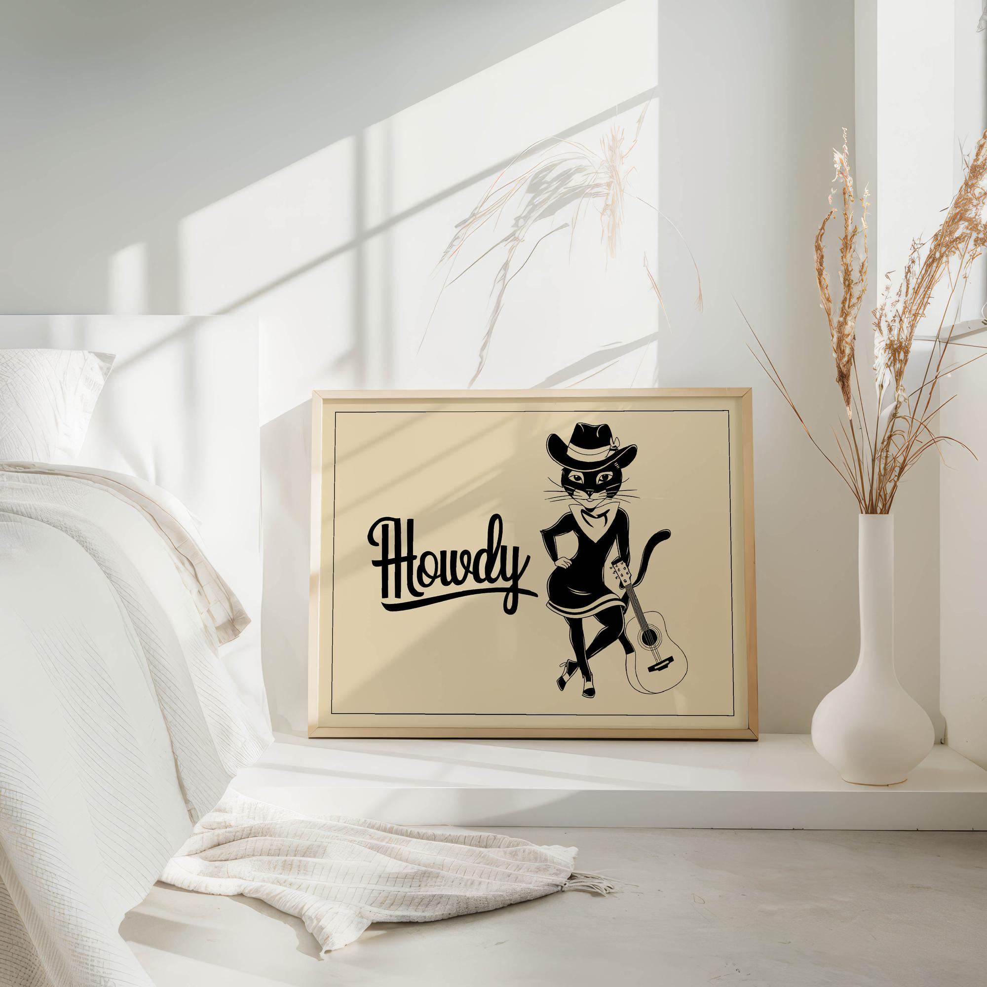 This delightful Typography Print showcases the salutation “Howdy” in an elegant script, accompanied by a whimsically illustrated black cat donning a classic hat and suit, leaning casually against an acoustic guitar. The monochrome palette against a warm backdrop lends a contemporary edge to the design, making it a versatile piece suitable for a variety of settings. It’s a playful yet stylish choice that fits seamlessly into modern decor schemes, appealing to enthusiasts of music, feline charm, and light-hearted art.