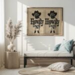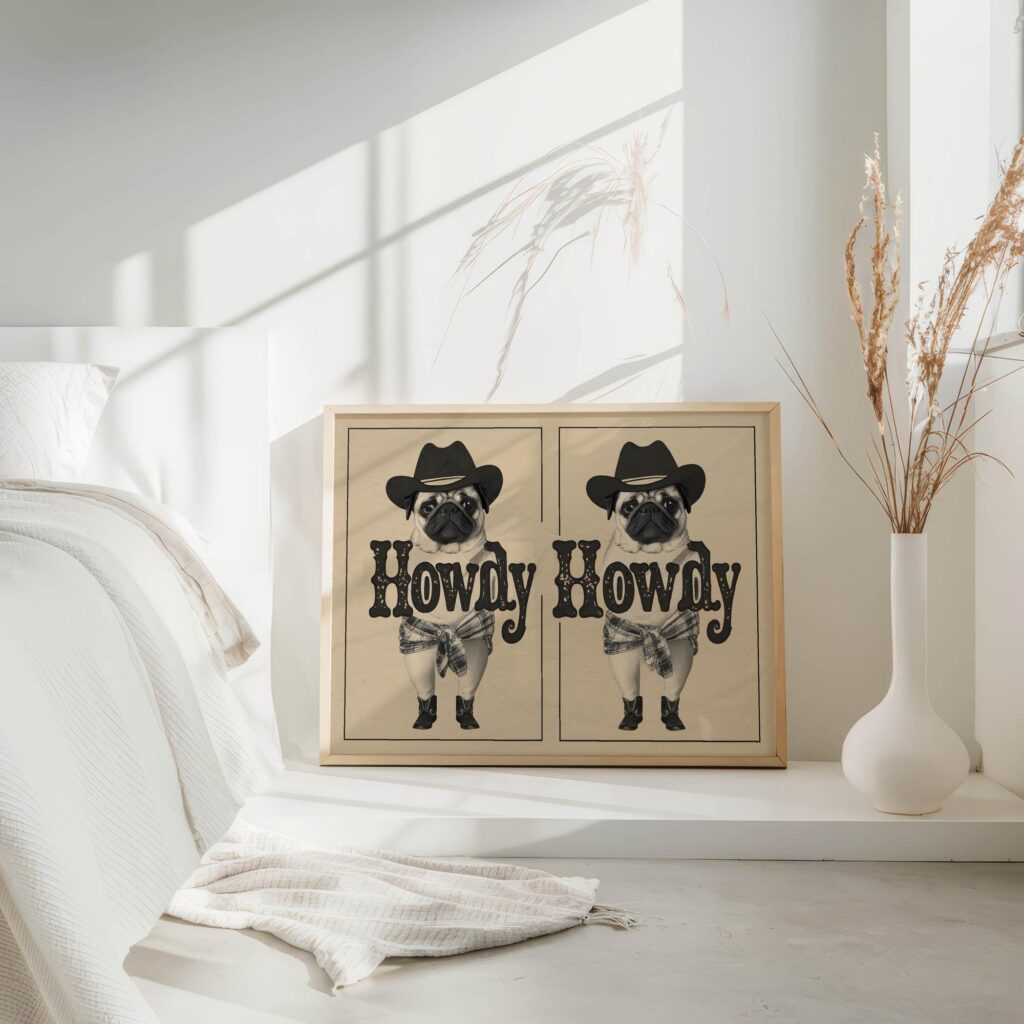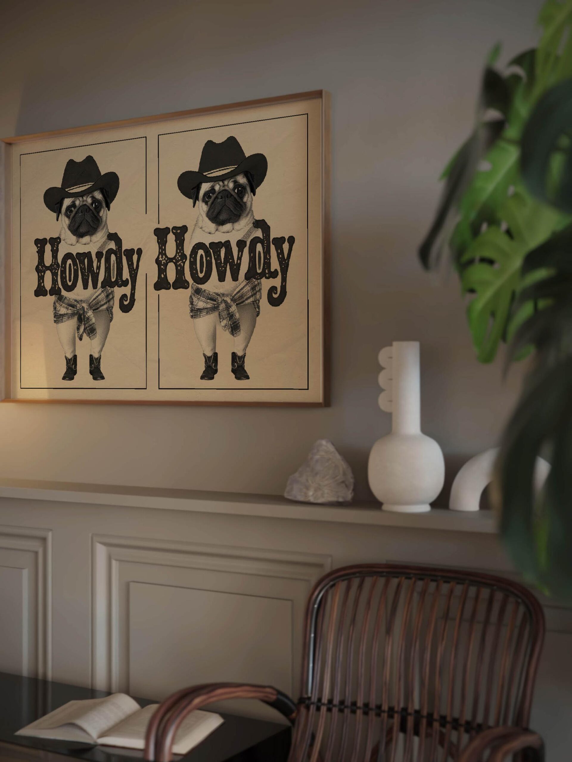 This captivating print features a charming pug poised in a playful cowboy outfit complete with a wide-brimmed hat and plaid shirt tied at the waist. The backdrop’s neutral tone accentuates the dog’s expressive face and the bold, decorative “Howdy Howdy” text, creating a piece that exudes a whimsical and inviting aura. Perfect for adding a touch of humor and inspiration to any space, this print is sure to delight animal lovers and those who appreciate lighthearted, contemporary design.