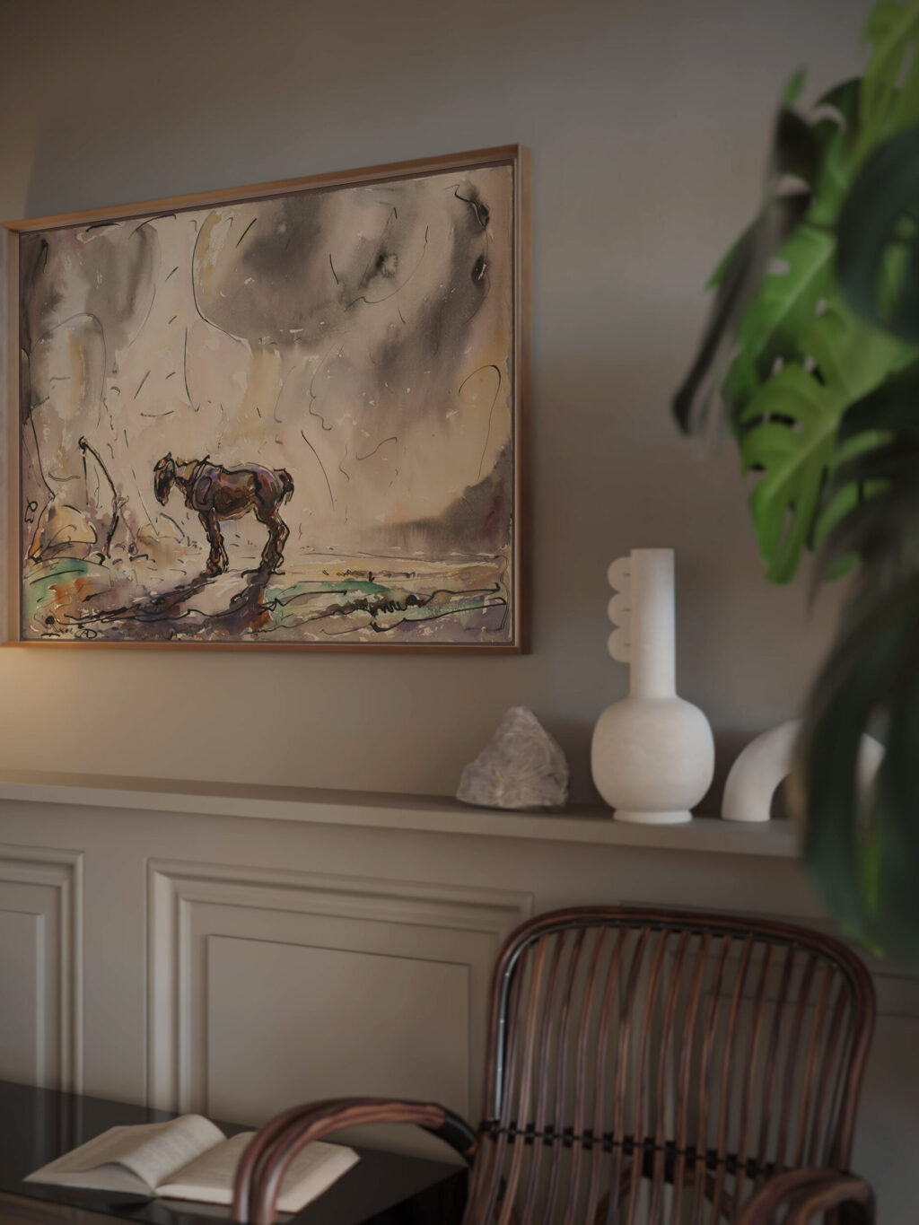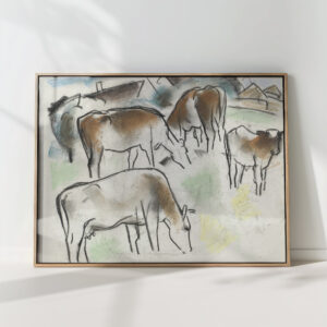 “Lonely Horse” by Alfred Ost depicts a horse in a sparse terrain, harnesses draped over its back, suggesting recent labor. Its isolation is palpable within the expansive setting. The foreground is marked by faint lines hinting at a path or furrows, while subtle washes of watercolor instill a melancholic atmosphere. The horse’s stature and the absence of human figures accentuate the theme of solitude, and the artwork’s loose, dynamic brushwork conveys both the energy and tranquility of the scene.