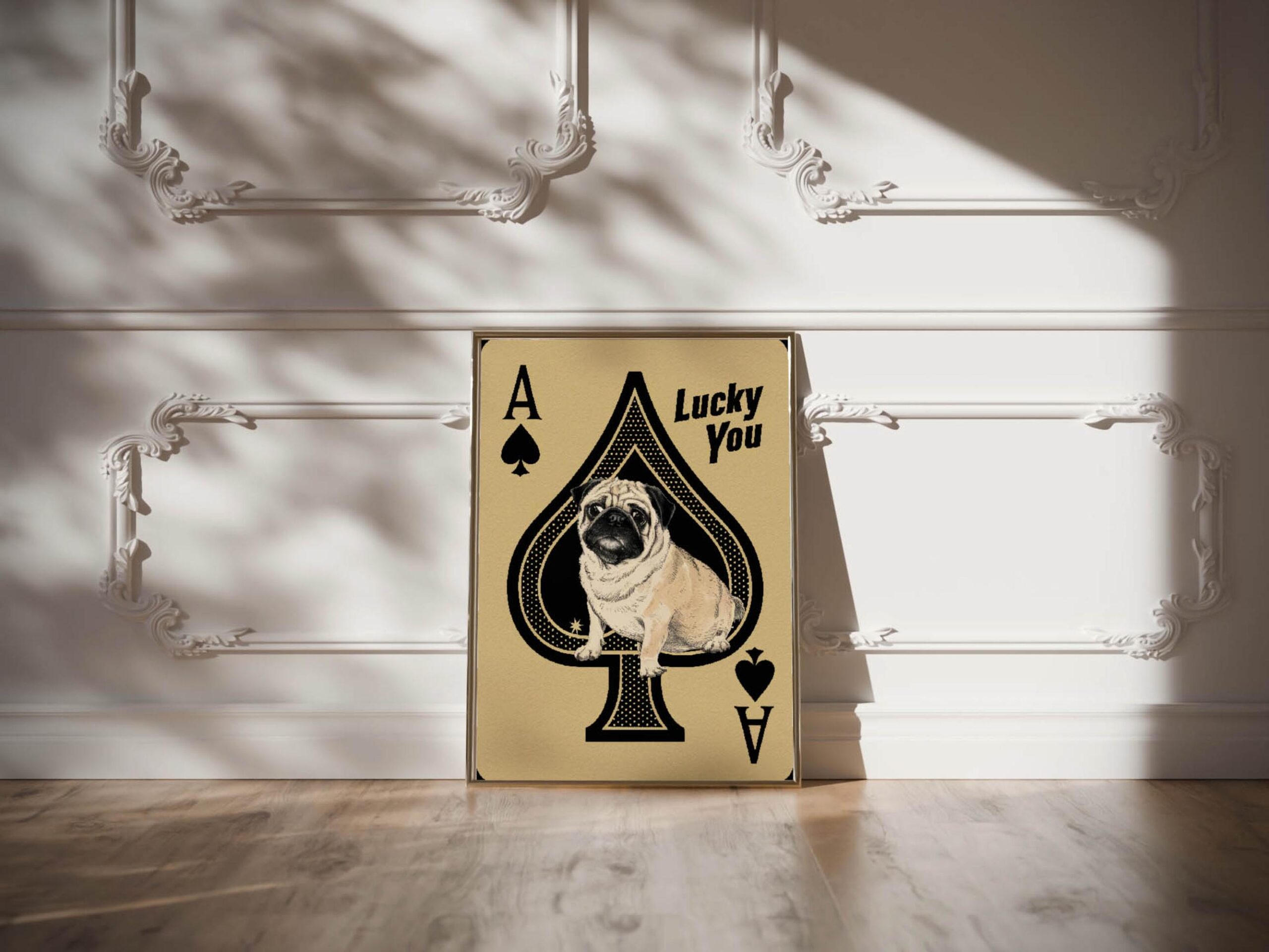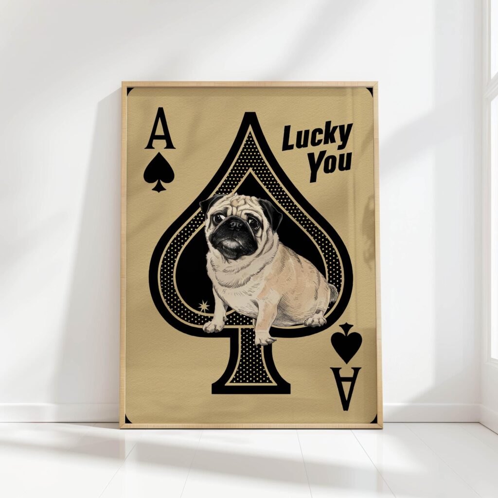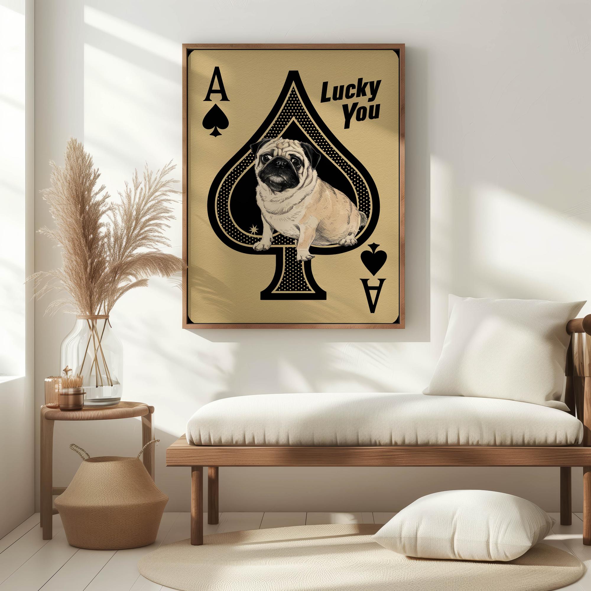 This eye-catching typography print features the phrase “Lucky You” placed atop a classic ace of spades playing card. At the heart of the design, a beautifully drawn pug sits regally, adding an element of surprise and whimsy. The vintage color palette of neutrals with a hint of black creates a stylish and versatile piece. This delightful artwork effortlessly combines animal charm with iconic card imagery, perfect for adding a playful yet sophisticated touch to any space.
