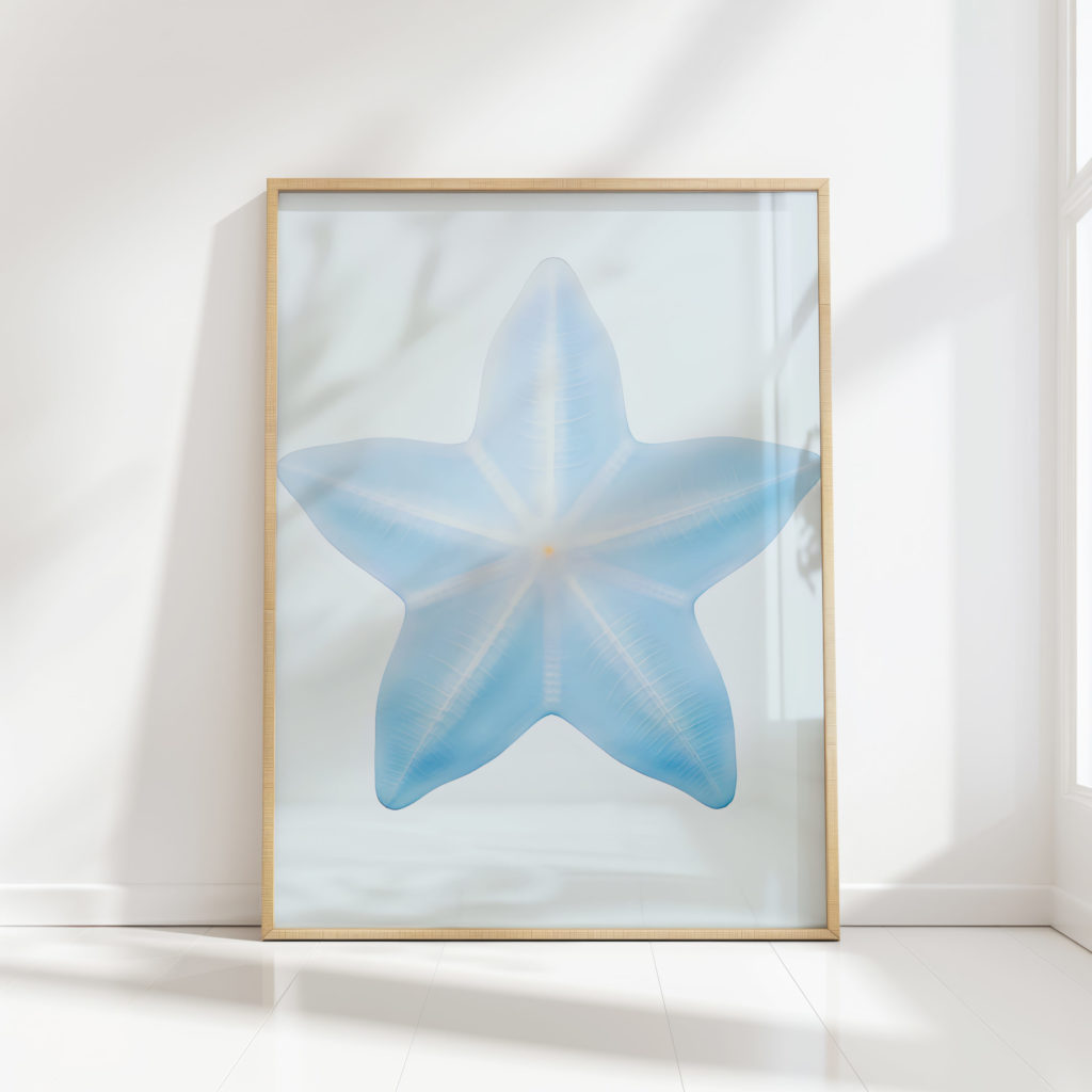 This serene blue starfish print captures the essence of oceanic life and brings a peaceful, coastal ambiance to any space. The starfish’s gentle curves and subtle gradient hues of blue suggest a tranquil undersea setting, offering an elegant touch to contemporary interiors. Ideal for those who appreciate marine life and a clean, modern aesthetic, this art piece is a beautiful representation of sea creatures, perfect for adding a calming influence to your home or office.