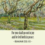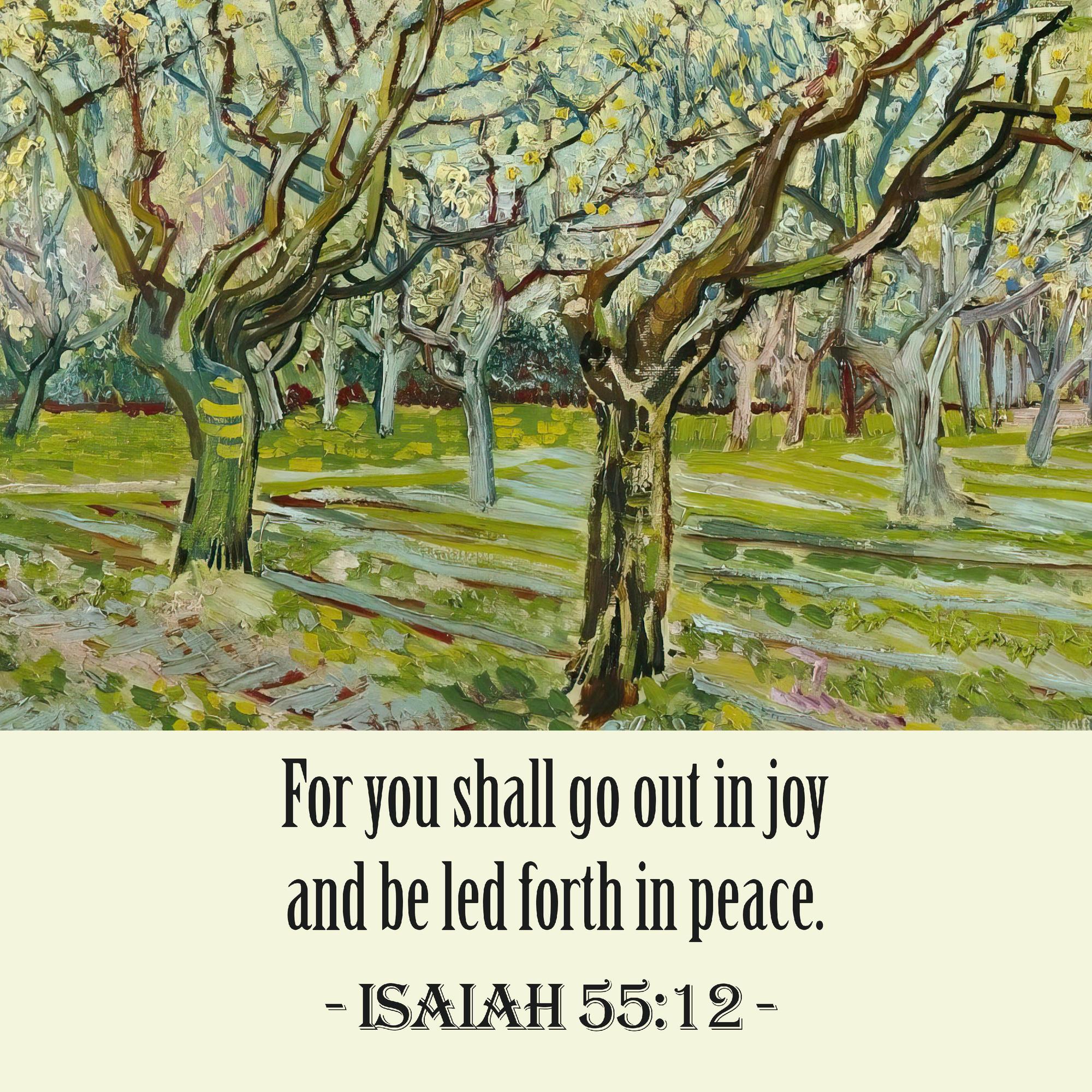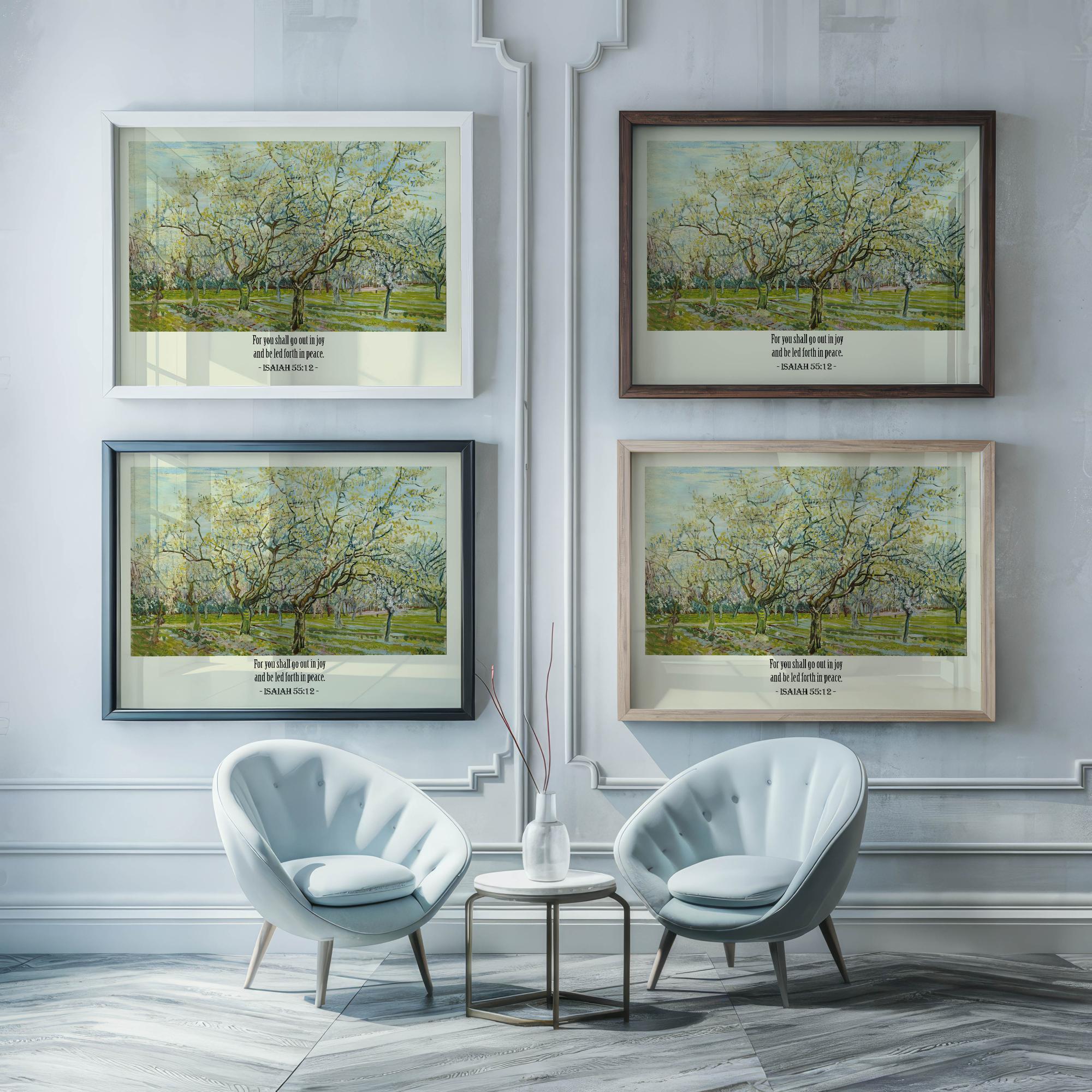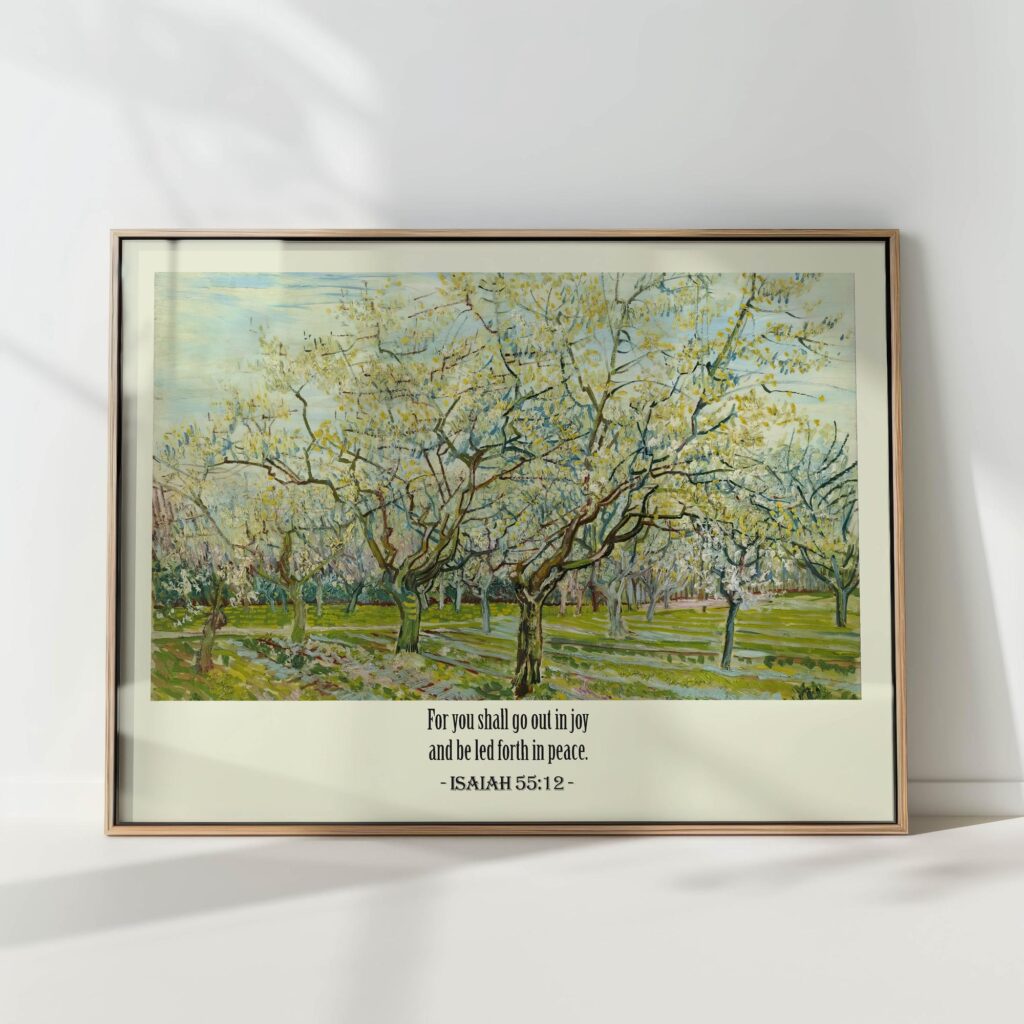 This high quality print brings a tranquil orchard scene to life, filled with delicate blossoms against a clear sky. Center stage are the flowering trees, their branches laden with pale blooms. Dappled sunlight graces the grassy floor, and a sense of peacefulness emanates from the natural setting. Overlaying the image is an inspiring phrase from Isaiah 55:12, offering a message of joy and peace. This piece effortlessly blends natural beauty with spiritual inspiration, making it a thoughtful addition to any space seeking a touch of calm and reflection.