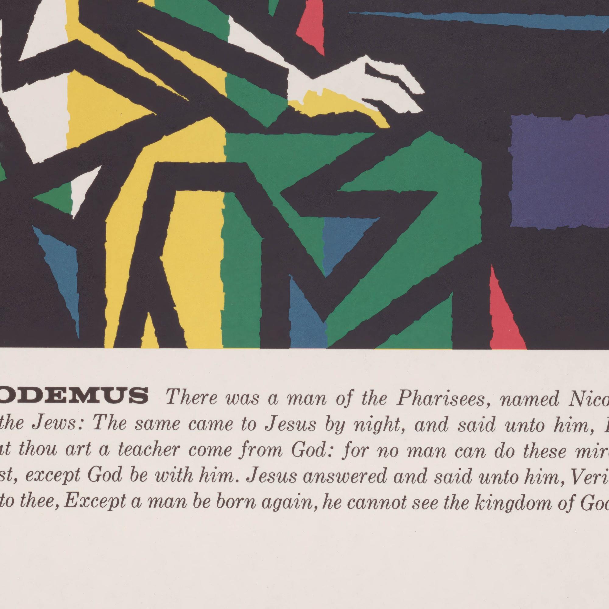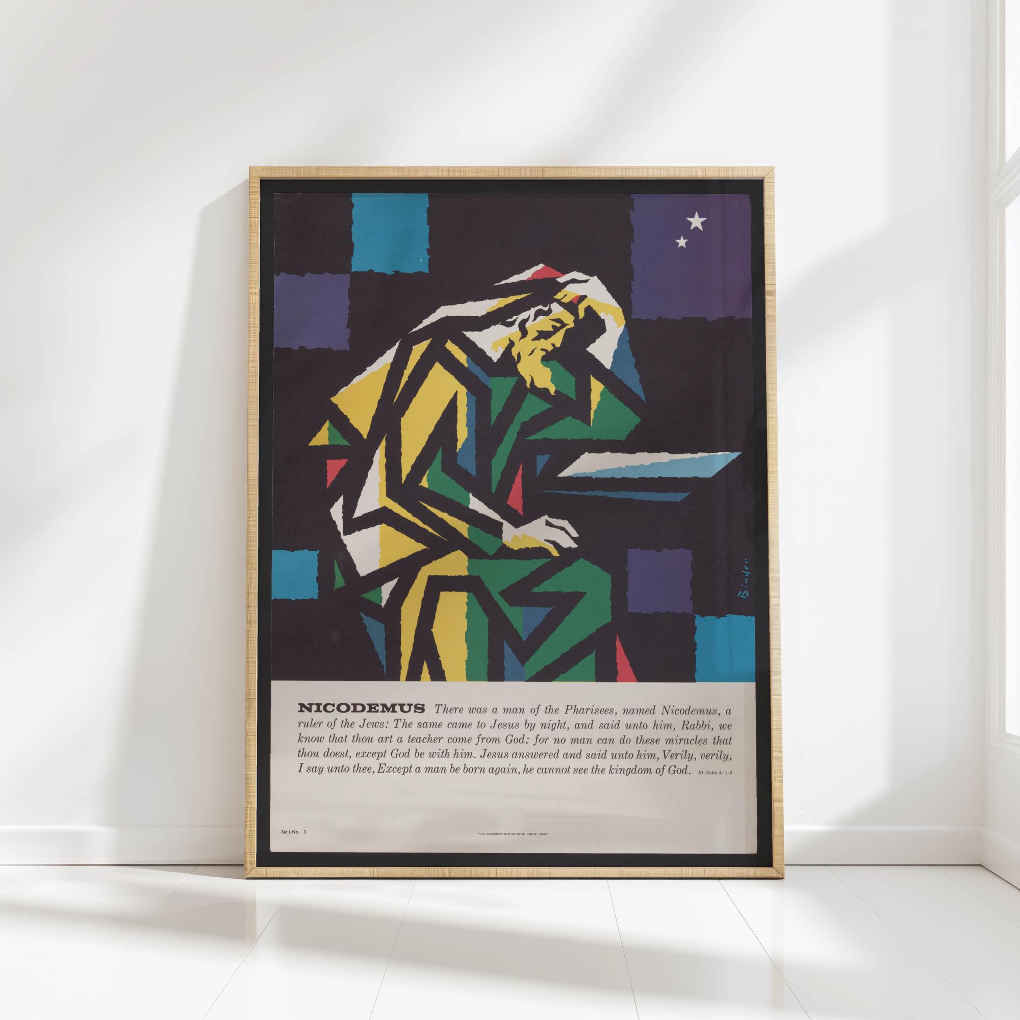 This compelling print showcases a colorful abstract portrayal of Nicodemus, an iconic figure from the Christian narrative, engaged in contemplative reading against a backdrop interspersed with stars. The physical objects and vibrant color palette accentuate the thematic focus on spirituality. Biblical text below the figure adds narrative depth, creating a conversation between the visual and the textual. This piece is a thoughtful addition for anyone looking to add a spiritual dimension to their space.