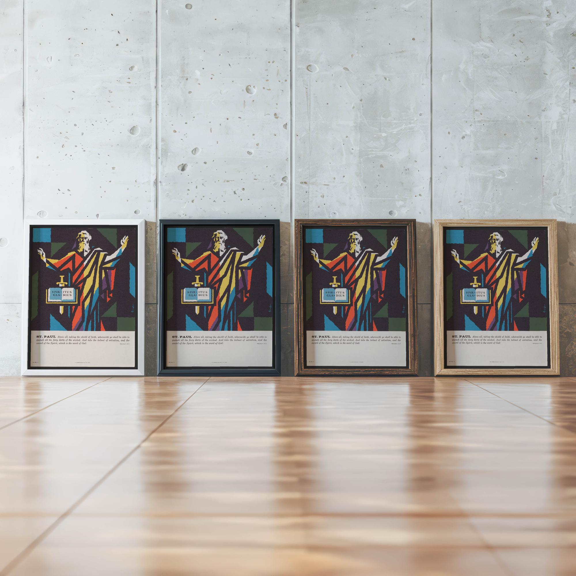 This striking print showcases a colorful depiction of St. Paul, vividly rendered in a contemporary style that captures attention. The design features St. Paul outstretched in a gestural pose, symbolizing openness and proclamation, with a sword and shield at his side, representing the spiritual battle and protection described in Ephesians 6:16-17. His vibrant robe flows with a patchwork of bright colors set against a nuanced background, creating a powerful visual narrative. This image evokes a sense of inspiration and resilience, making it an excellent addition to any space that seeks to motivate and uplift.