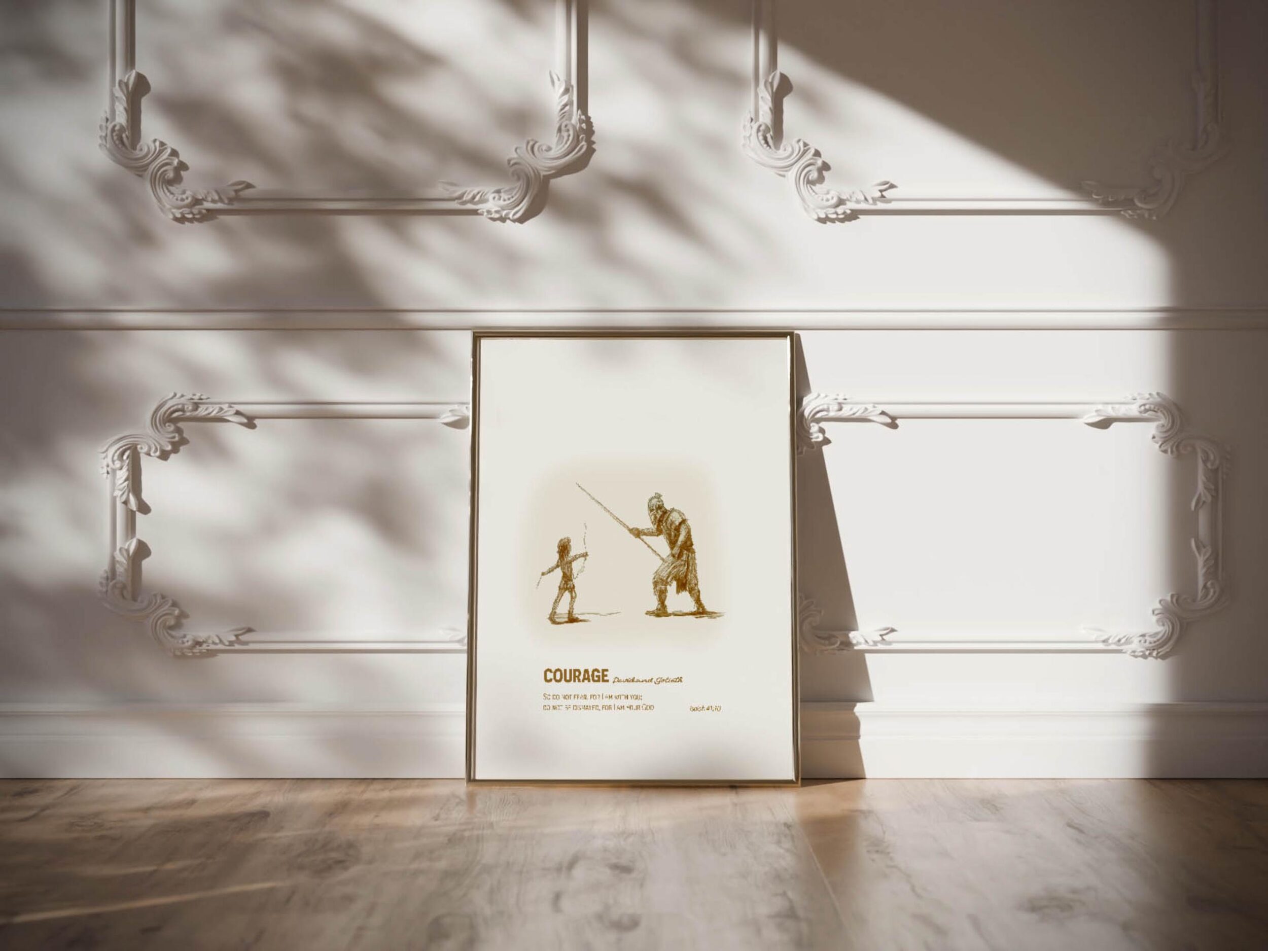 This high quality print captures the iconic biblical confrontation between David and Goliath, symbolizing the victory of faith and courage over seemingly insurmountable odds. Rendered with a modern touch, the artwork presents the young David, armed only with a simple sling, standing brave and resolute against the towering Goliath, bringing to life a powerful message of inspiration. Whether for a place of worship, a home, or an educational setting, this work serves as an evocative reminder of the strength of spirit and the power of belief.