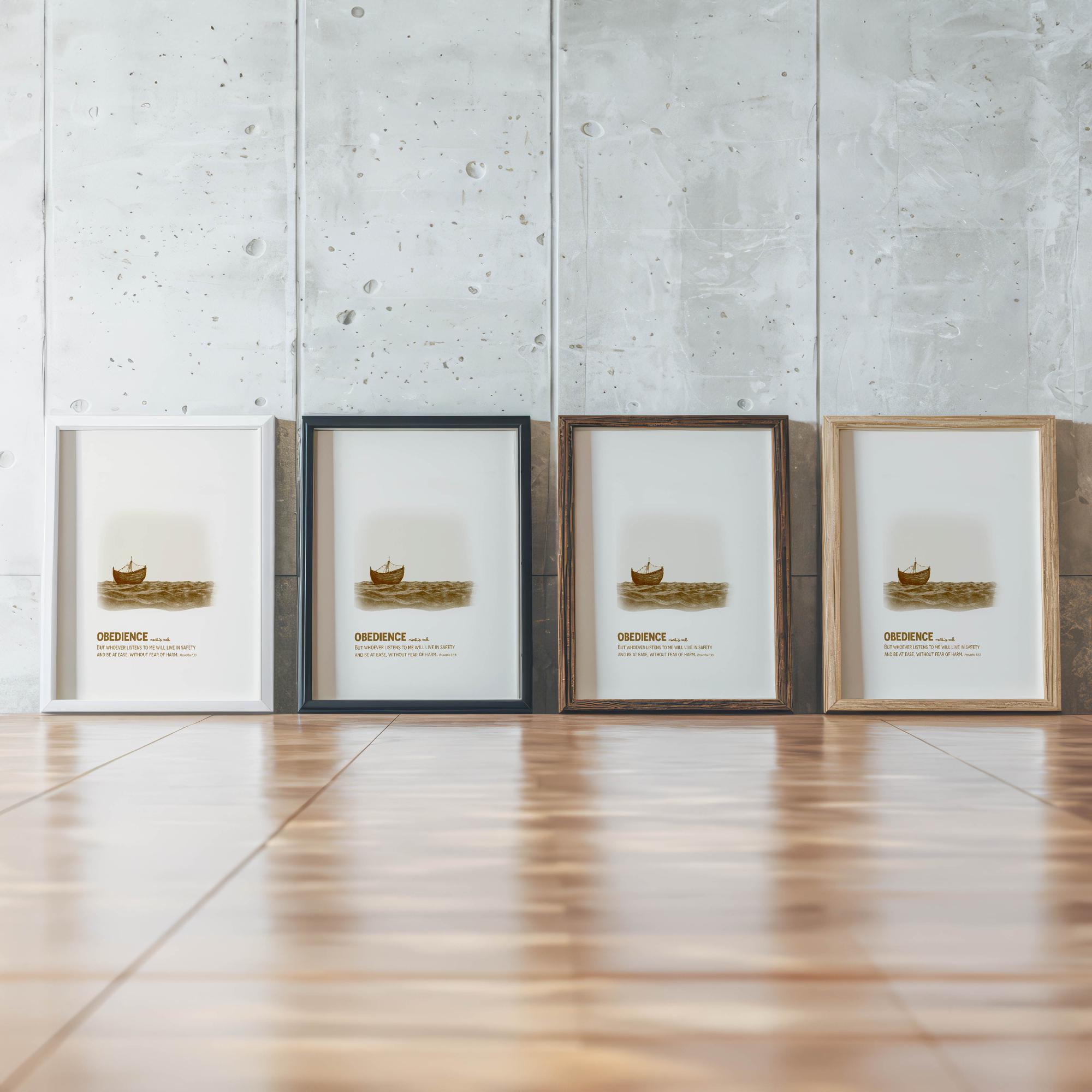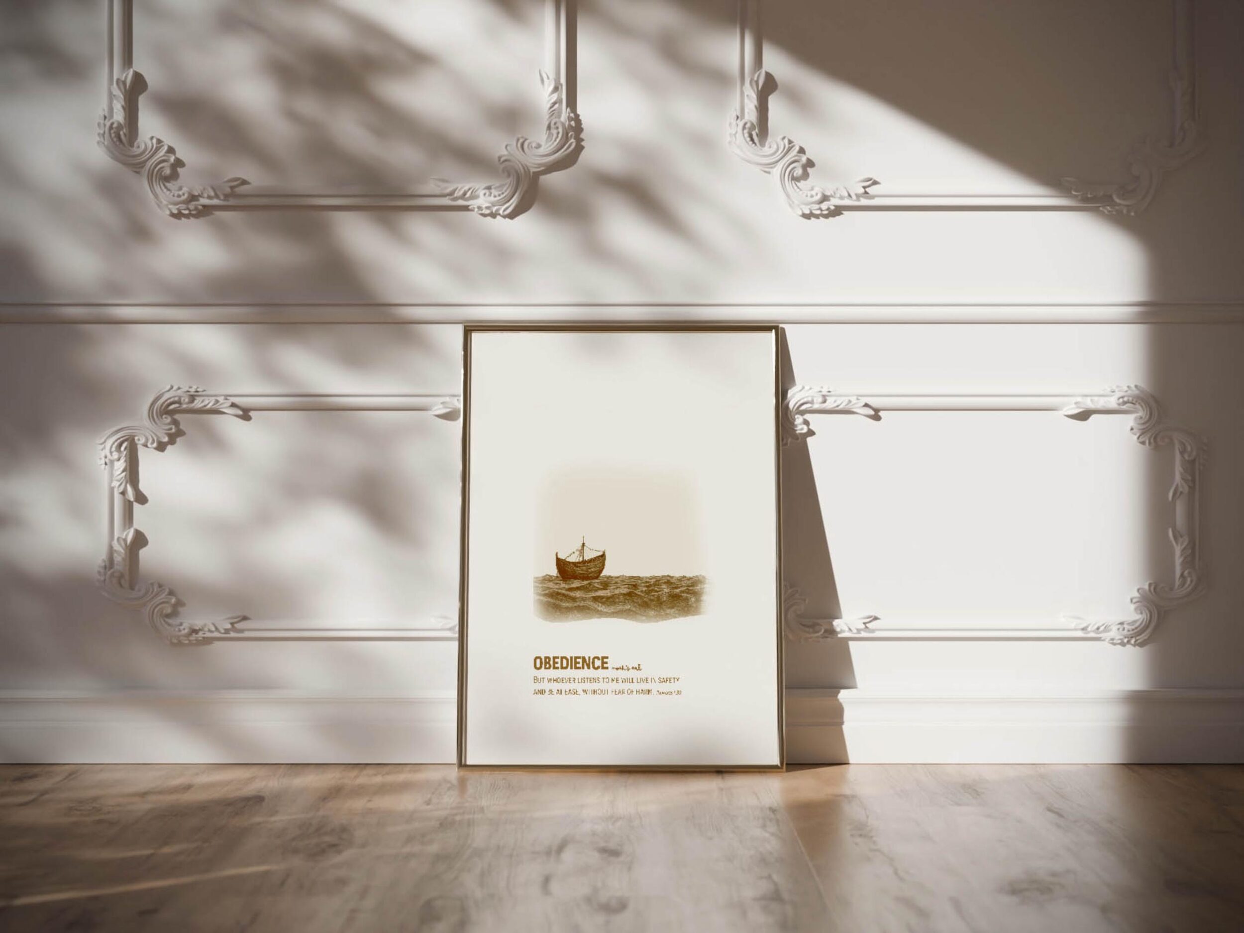 This serene print portrays a lone boat gently floating on calm waters, evoking a sense of peace and solitude. Beneath the image, a powerful message from Proverbs 1:33 inspires faith and obedience, offering a meditative and calming presence. Ideal for those seeking a spiritual reminder in their daily lives, this artwork seamlessly blends religious scripture with a simple yet powerful visual narrative. It serves not only as a decorative piece but also as a daily encouragement to live in safety, without fear, and with trust in higher guidance.