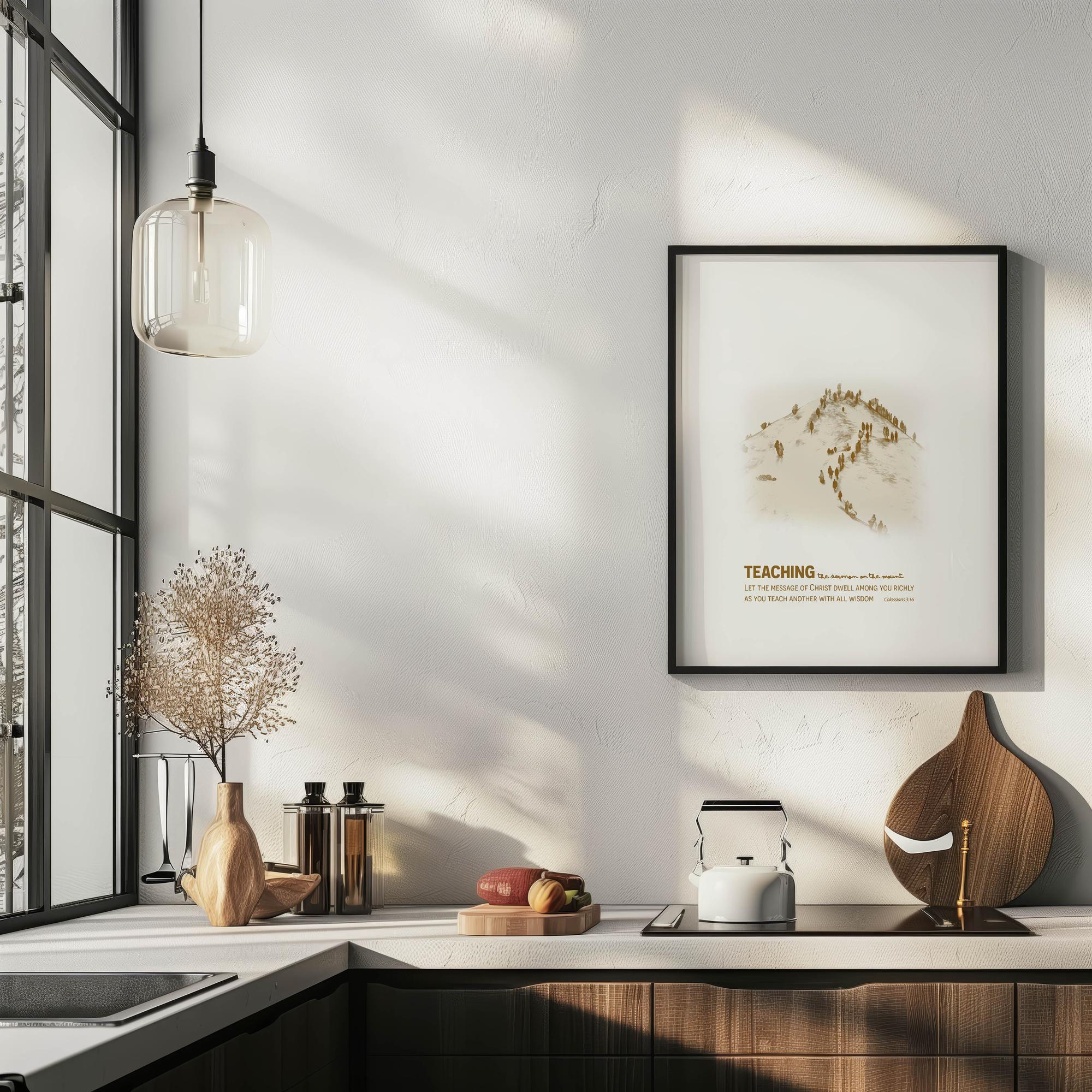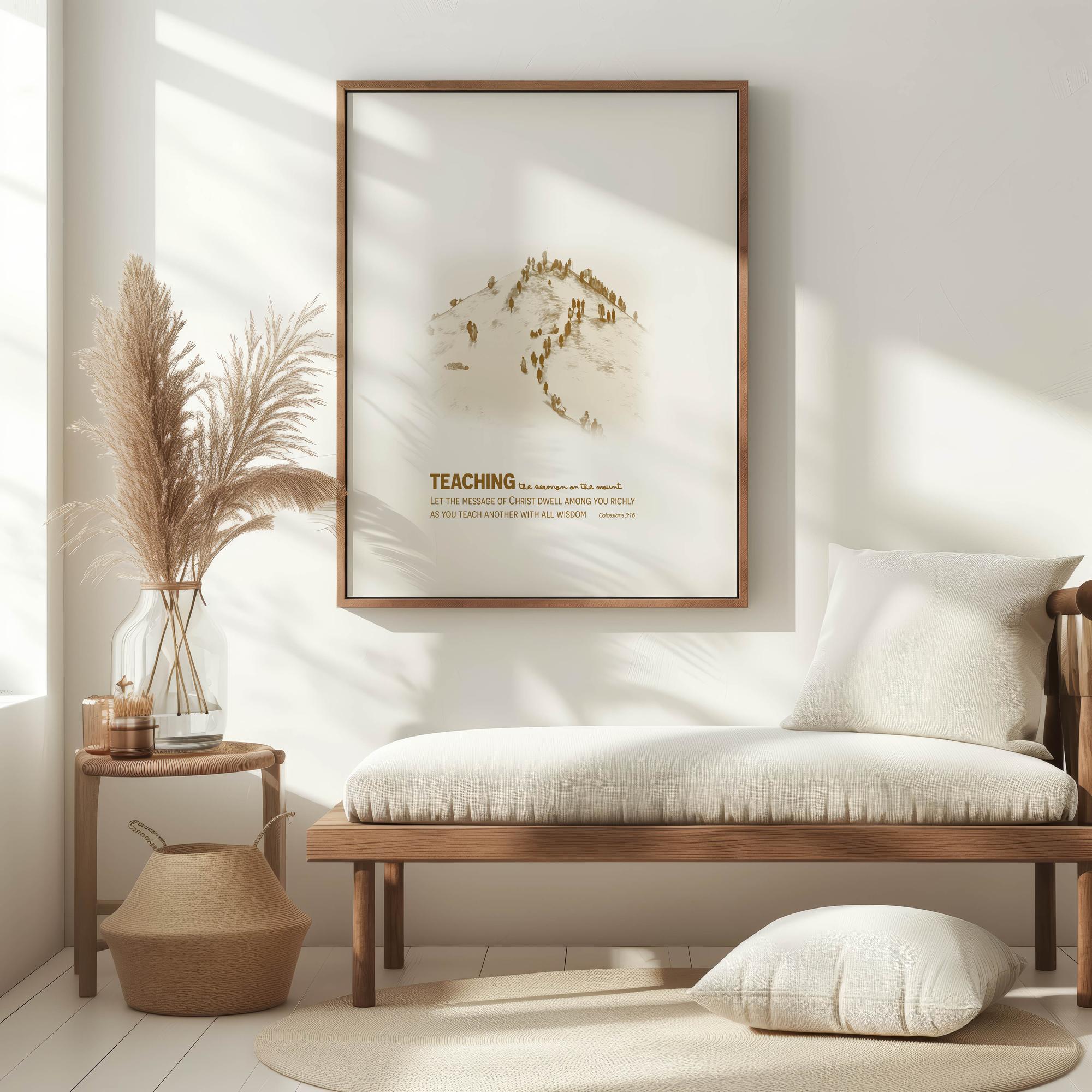 This high-quality print features a solemn gathering of individuals ascending towards a focal point of light, invoking a sense of spiritual enlightenment and community. The illustration elegantly fuses the concept of teaching with a profound scripture quote from Colossians 3:16, encouraging shared wisdom and the internalization of Christ’s message. The warm tones and soft shadows create an atmosphere of contemplation and reverence, making this art piece a thoughtful addition to any space seeking a touch of tranquility and spiritual reflection. Ideal for a contemplative nook or as a meaningful gift, this print is bound to stir introspection and conversation.