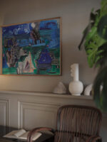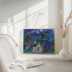 Raoul Dufy’s “Bateaux” showcases a bustling harbor with various boats, from sailboats with billowing sails to larger vessels adorned with colorful flags. The dynamic brushstrokes evoke movement, suggesting the gentle sway of boats on water. Above, seagulls are depicted in flight against a strikingly patterned sky that creates a sense of energy and vivacity. The print is characterized by its bold color palette and the abstracted forms that give a nod to the harmony and rhythm of maritime life.
