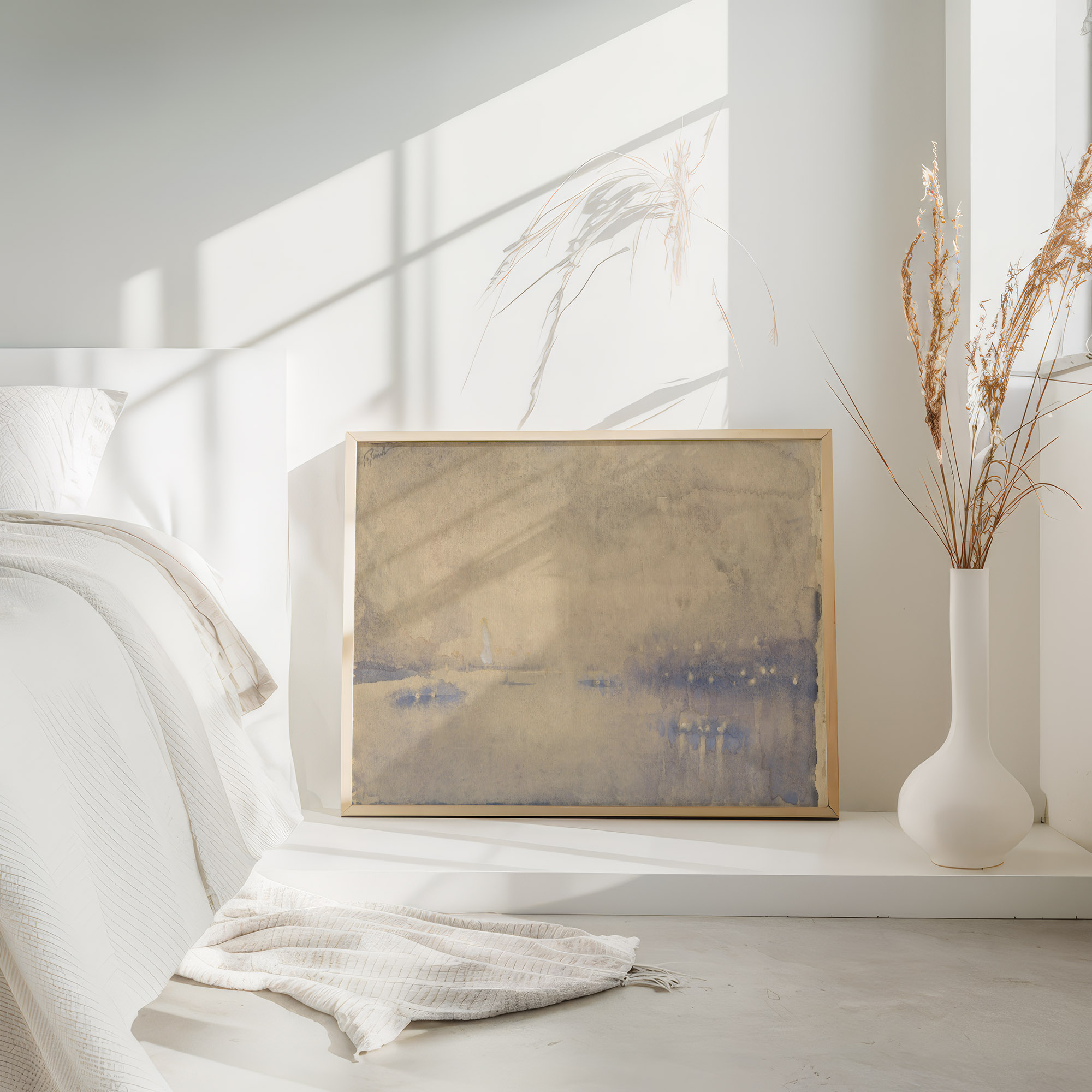 “Lighting Up – Joseph Pennell” captures an ethereal waterfront setting where the glow of lights dances on the surface of calm waters. The print hints at boats moored against a dock, under the watchful gaze of the city’s silhouetted buildings fading into the misty backdrop. This atmospheric scene evokes the quietude of evening where artificial and natural light converge, blurring the line between the constructs of man and the fluidity of nature.