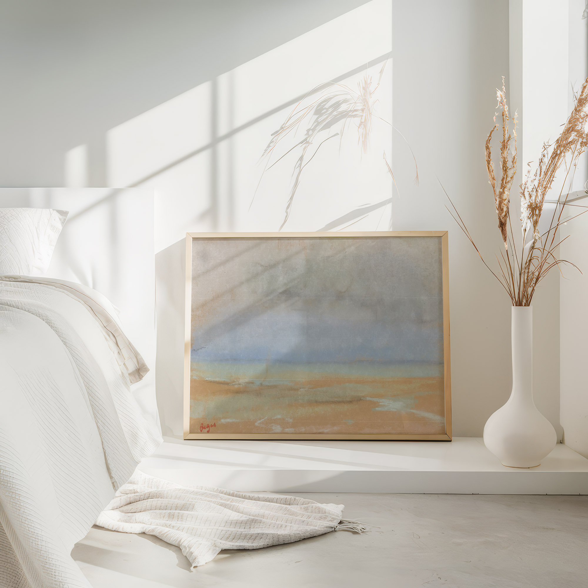 “Au bord de la mer” by Edgar Degas captures the calm essence of a coastal environment. The horizon is subtly defined, merging skies with the sea in soothing hues. The sand is rendered with varying tones, suggesting the presence of moisture and dryness. Degas employs a minimalist approach, with no figures or intricate details, focusing instead on the vastness and simplicity of nature. The composition conveys a sense of peace and vast open space, encouraging contemplation.
