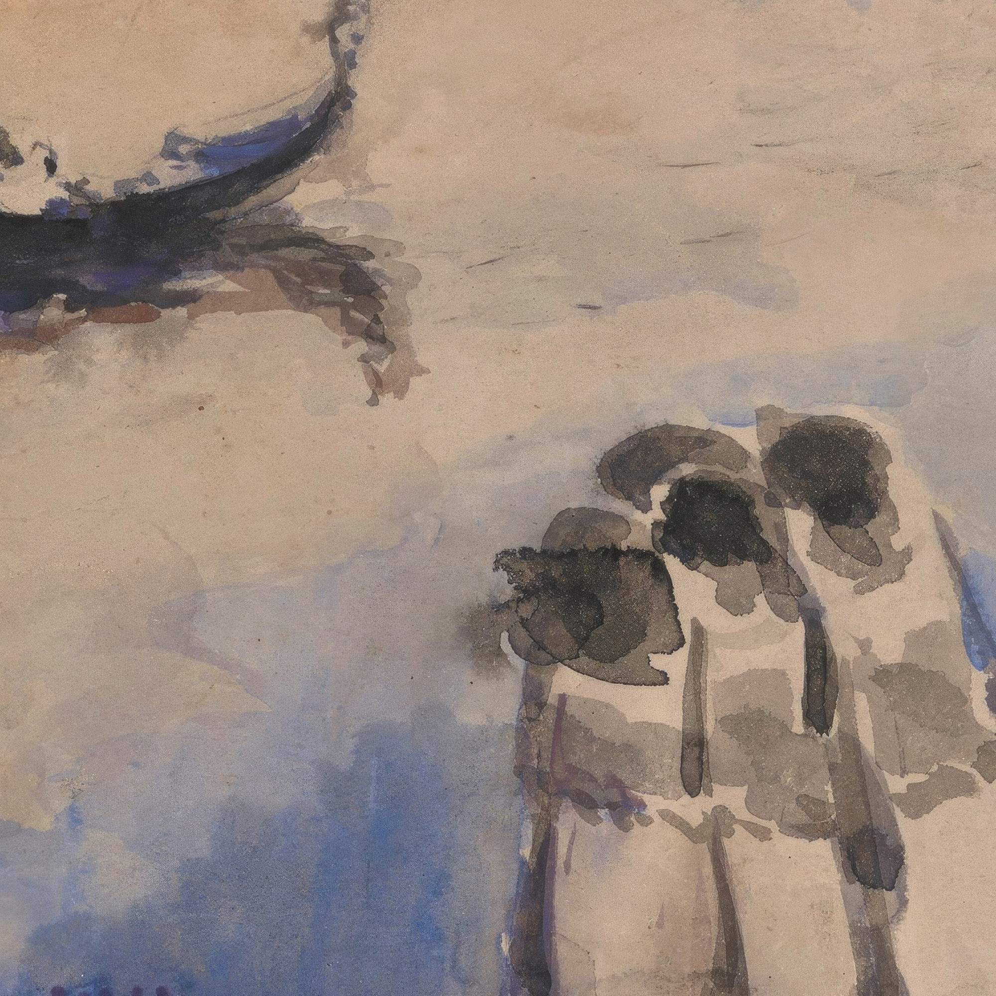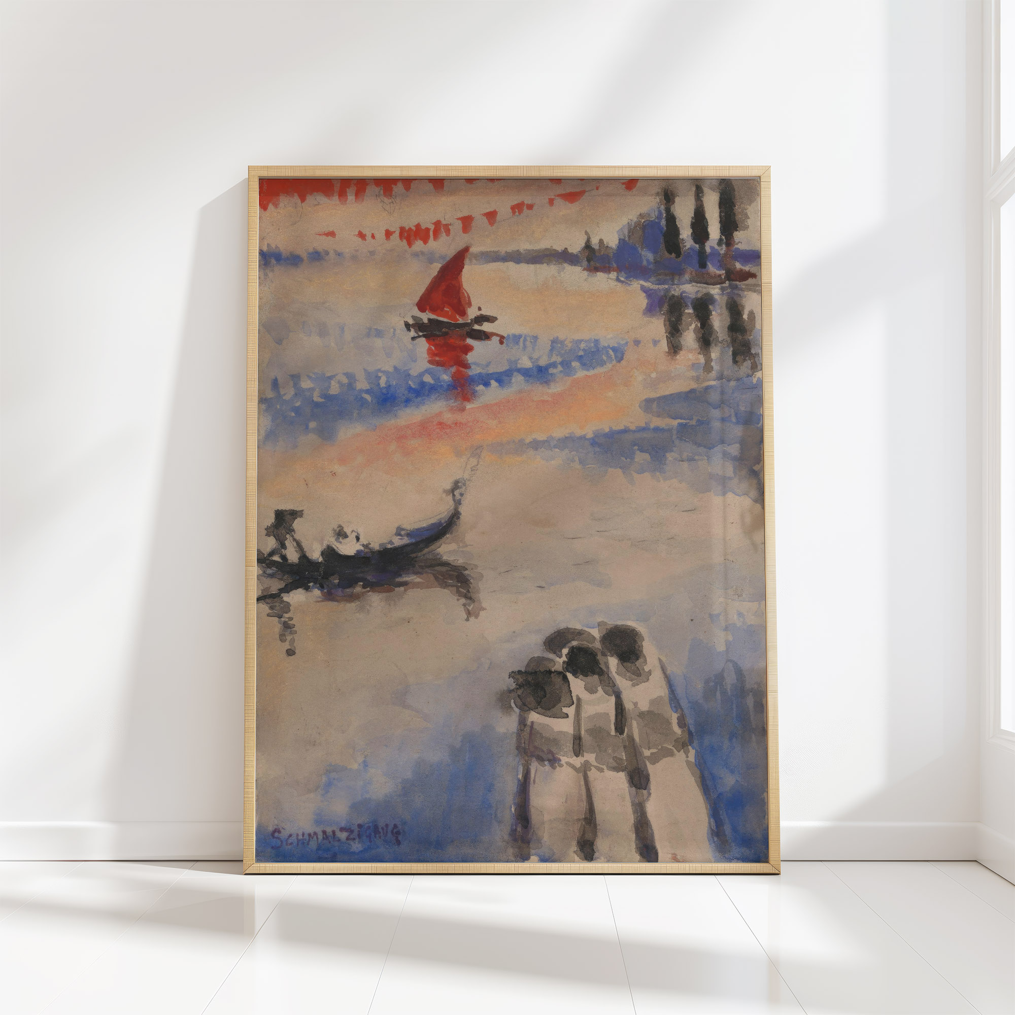 In the print, a striking red sailing ship catches the eye as its sail billows in the middle of a calm, blue expanse, suggesting the open sea or a large body of water. A gondola with its characteristic silhouette floats nearby, hinting at a Venetian setting. In the foreground, two figures appear closely engaged, possibly sharing an intimate moment or conversation, while the reflected colors on the water’s surface add depth and a sense of tranquility to the scene. The overall composition conveys a sense of peaceful maritime life with an impressionistic touch.